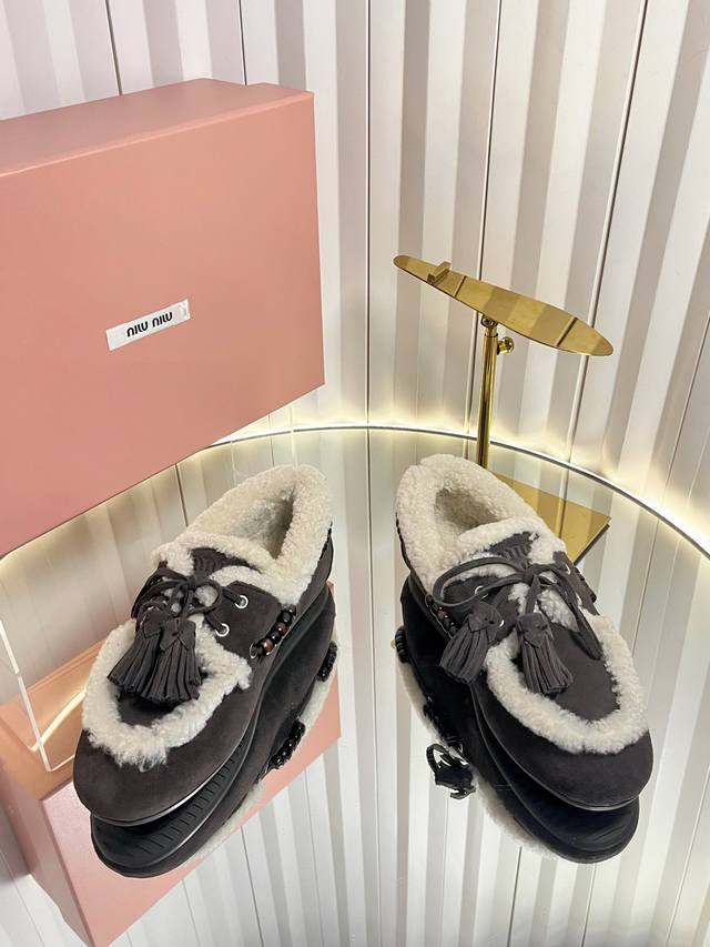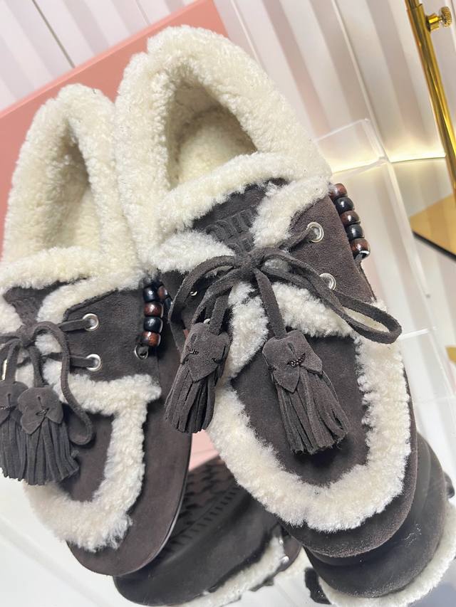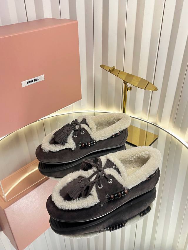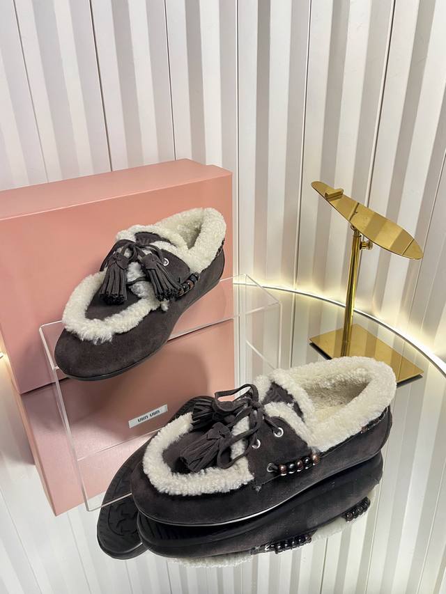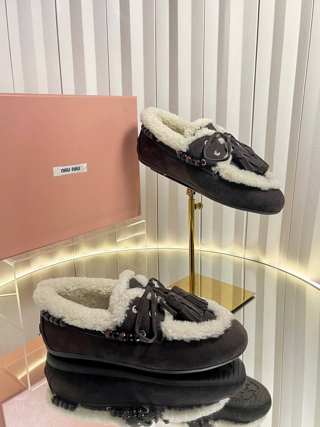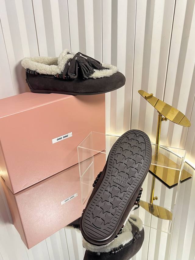Miu Mi* 25Fw Deck Shoes Wool Loafers DDD New Miu Miu wool loafers. Available in retro shades such as brown and dark brown; white plush embellishments on the edges and opening create a striking contrast, adding warmth and a touch of cuteness. Wooden beading embellishments on the sides and tassel details on the laces further enhance the retro feel; the classic loafer silhouette is simple yet sophisticated. DDD Pair with a high-waisted pleated skirt and a white sweater, layered with a preppy blazer for a retro-preppy look; or choose a floral dress for a sweet touch, the retro feel of the plush shoes contrasting beautifully with the dress's femininity. DDD Upper: Calfskin DDD Lining: Wool DDD Outsole: Original molded outsole DDD Size: 34-41 (34, 40, 41 are custom orders and cannot be returned or exchanged DDD)