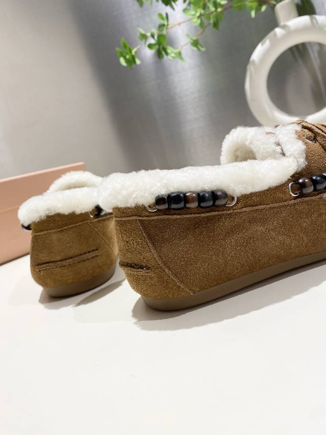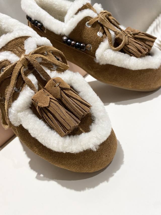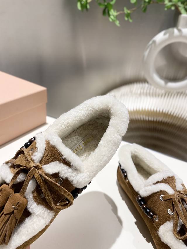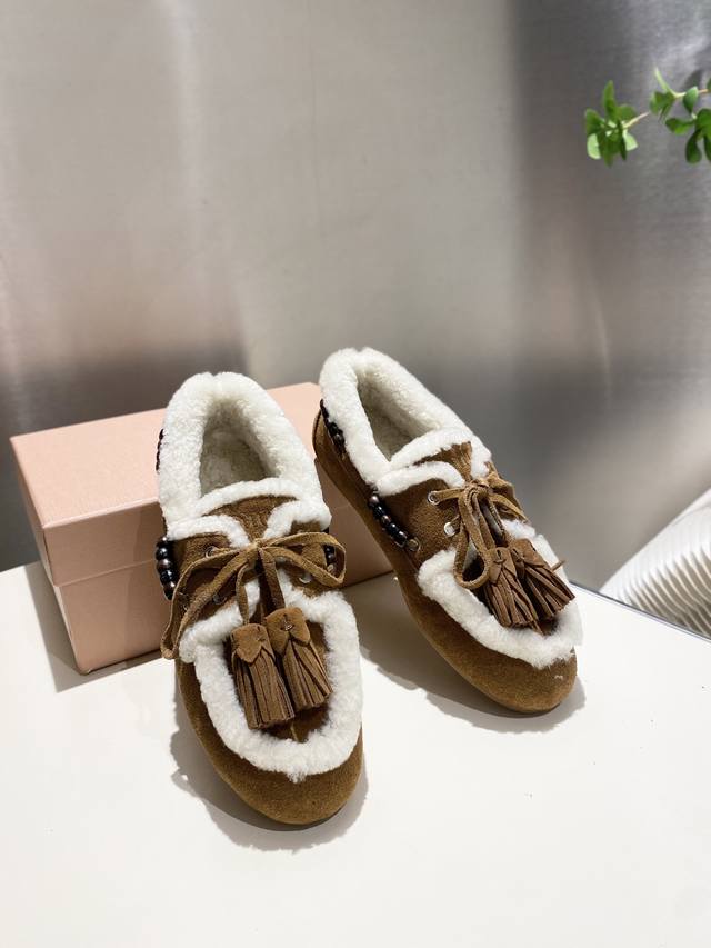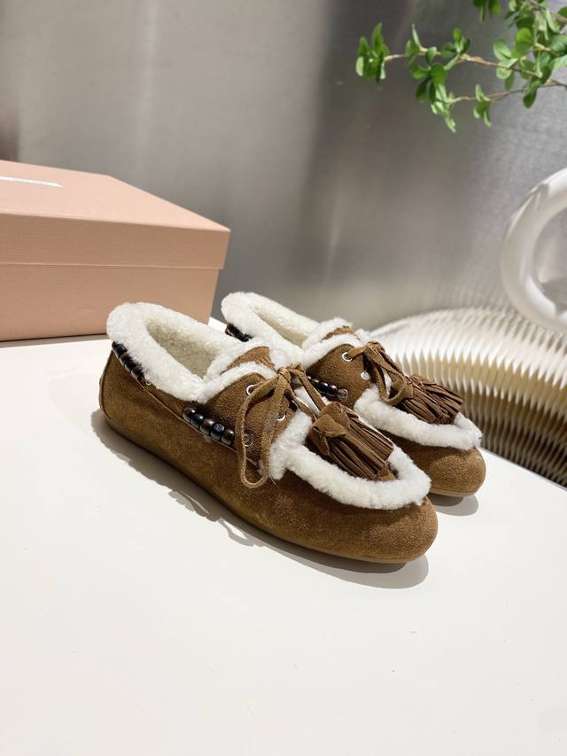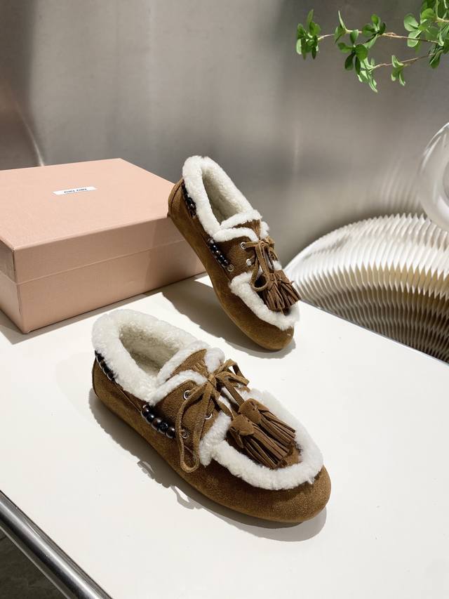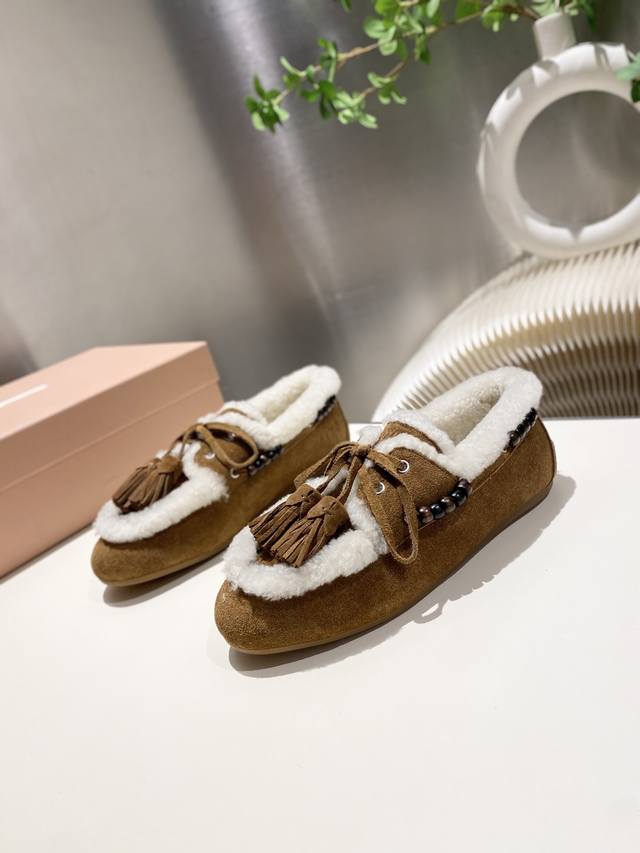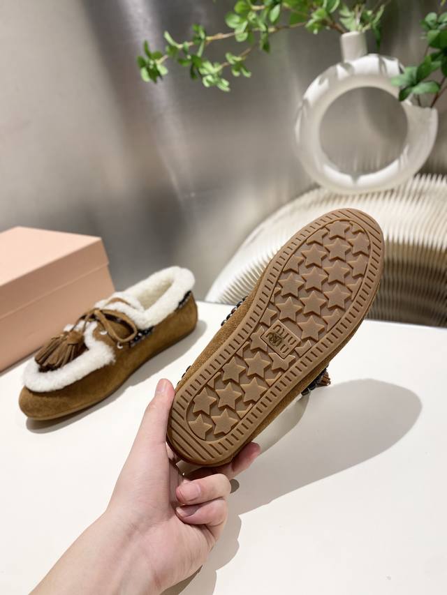 Miu Miu 2025 Flat Loafers with Furry Linings, New Fashion Show Style with Tassels. Retro Loafers, Retro Fashionable Simple High-End, Easily Matched, Very Comfortable to Wear, A Must-Have of the Year! Original suede upper, wool lining, original outsole. Sizes 34-41. Customized (DDD)