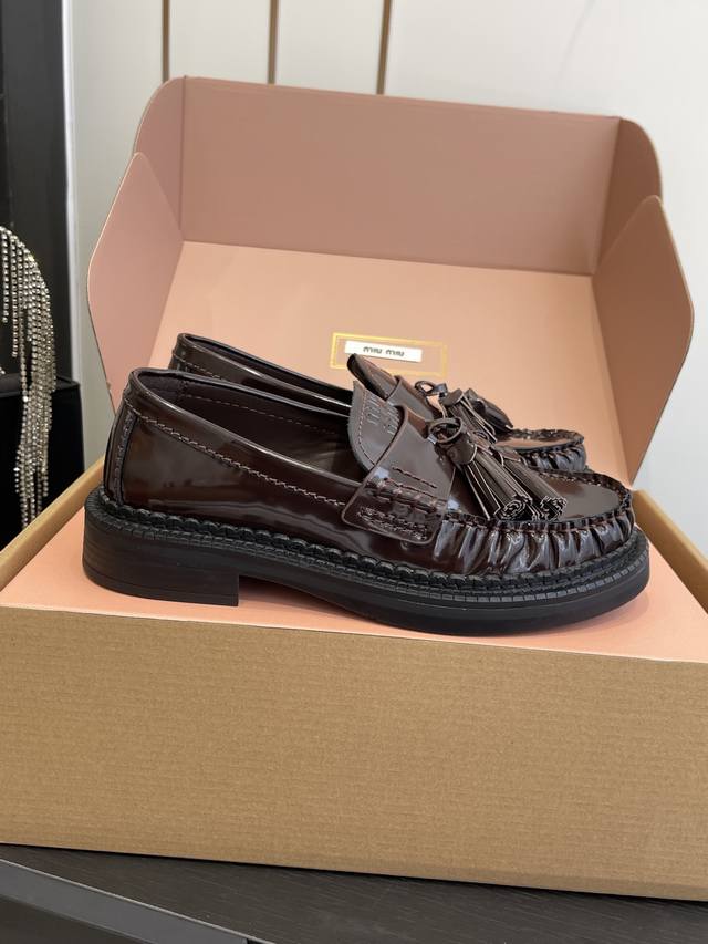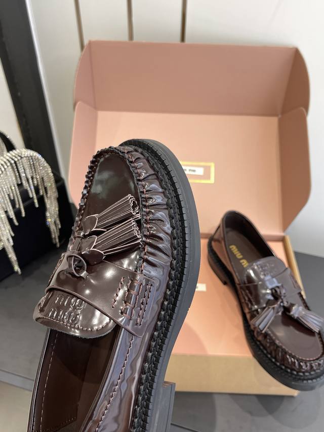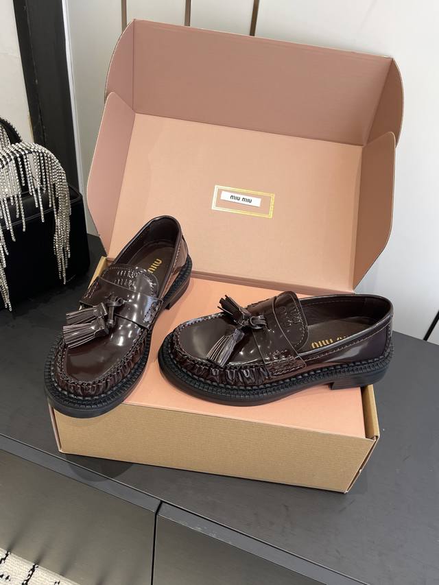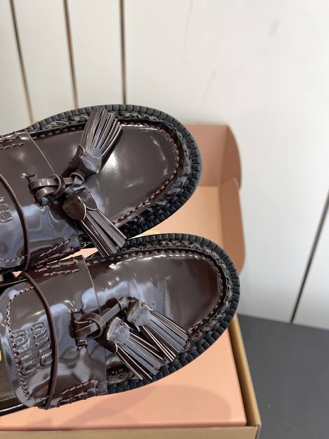 Miu Miu 25Fw Deck Shoes New Tassel Loafers. Blending retro and modern styles, the classic loafer silhouette is adorned with tassel embellishments, adding a lively and playful touch. The platform design also brings a hint of retro British style, while enhancing the overall look. Made of high-quality leather, the shoes have a delicate texture and excellent luster. The stitching is exquisite, and the tassel details are meticulously crafted, showcasing the brand's refined workmanship. Pair them with a pleated skirt and a white shirt, topped with a knitted cardigan, for a fresh and youthful campus style. The tassel elements on the shoes complement the lively feel of the preppy look perfectly. Upper: Cowhide Lining: Cowhide Outsole: Original molded outsole Sizes: 35-40, 40 custom-made.