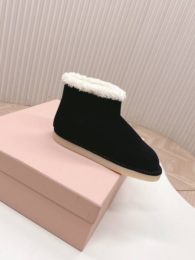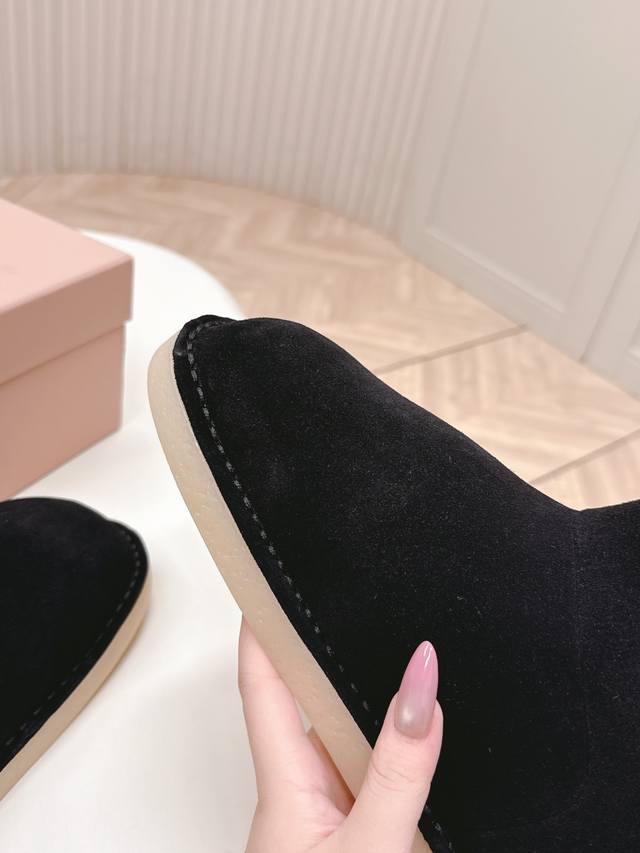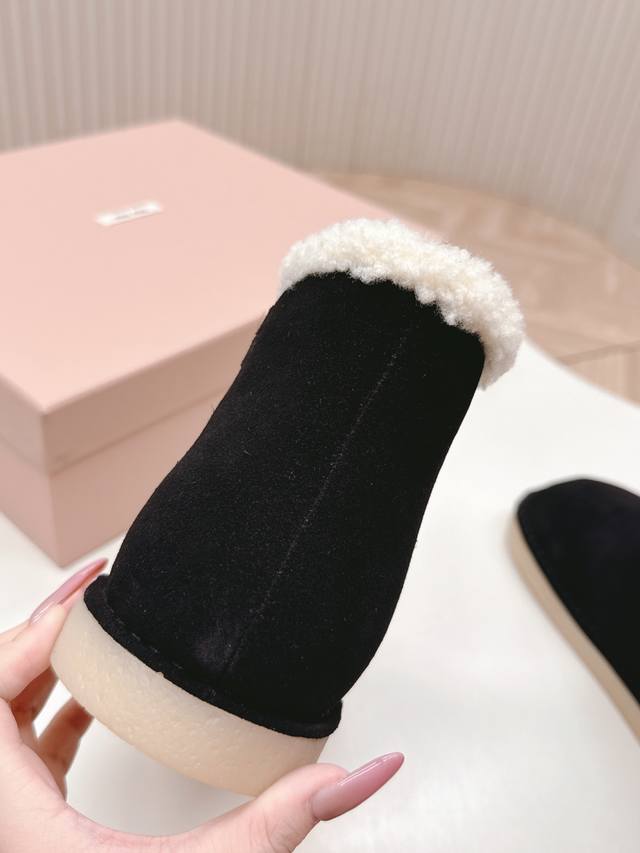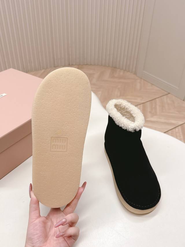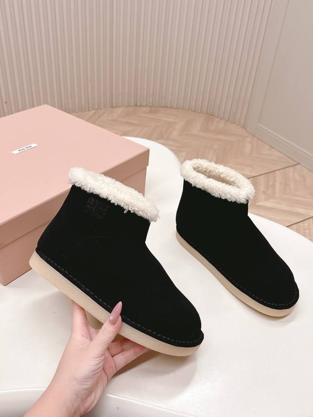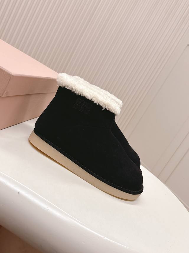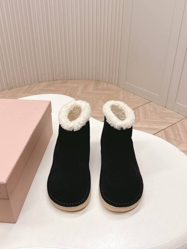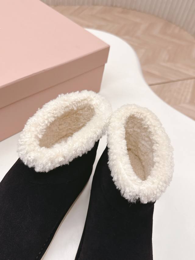 Miu Miu 25Fw Deck Shoes. These wool snow boots feature a finely textured suede upper, with a soft, fluffy white fur trim around the ankle, adding a touch of style while providing warmth and a snug fit. For styling, the light beige version pairs well with light-colored jeans and knit skirts for a fresh and gentle winter look; the dark brown version is suitable for pairing with dark-colored cargo pants and wool skirts for a retro yet warm style, making them suitable for both everyday outings and winter commutes. Upper: Cowhide Suede; Lining: Wool; Outsole: Rubber; Sizes: 35-39