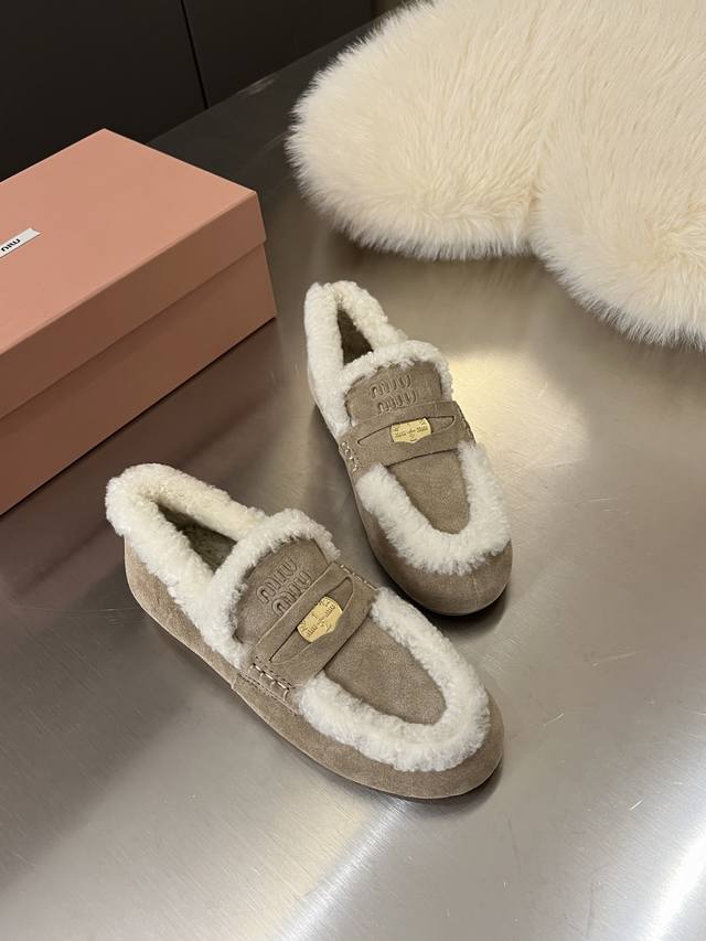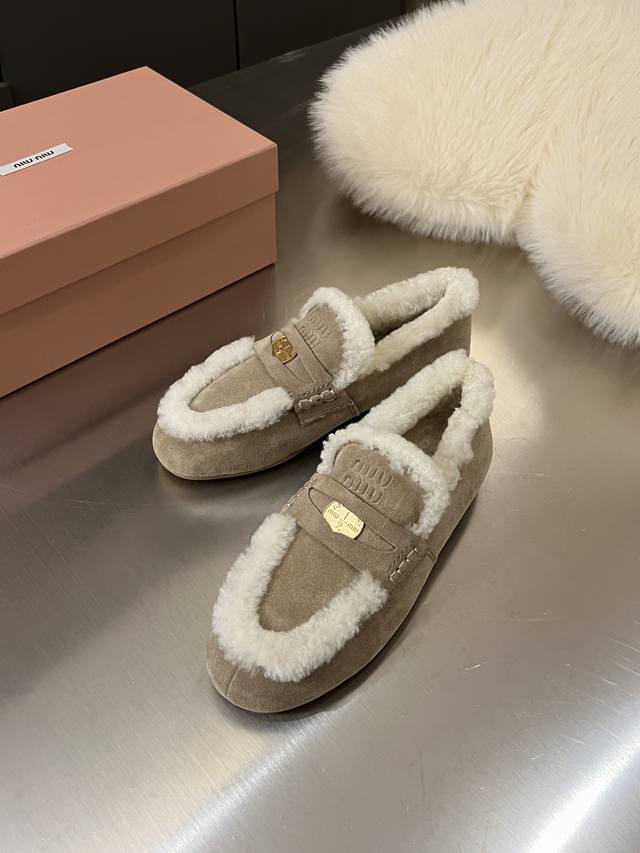 Miu Miu Autumn/Winter New Gold Coin Loafers 100% Pure Wool Runway Style DDD A super popular old-money style in recent years, retro, fashionable, simple, and sophisticated. Easily paired with any outfit, very comfortable to wear. The upper features gold coins and embossed logos, showcasing a unique classic style. DDD Original cow suede material DDD Lambswool lining DDD Original molded raw rubber non-slip sole DDD Sizes 35-40 DDD