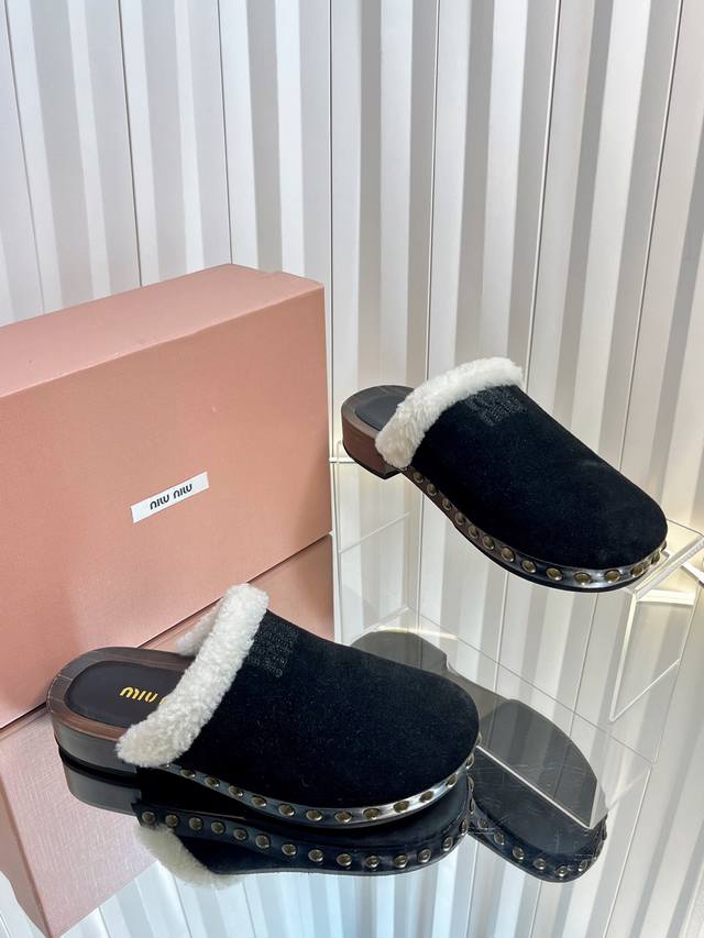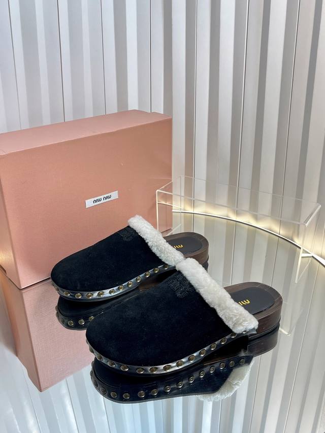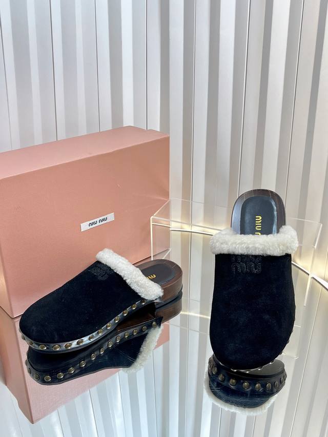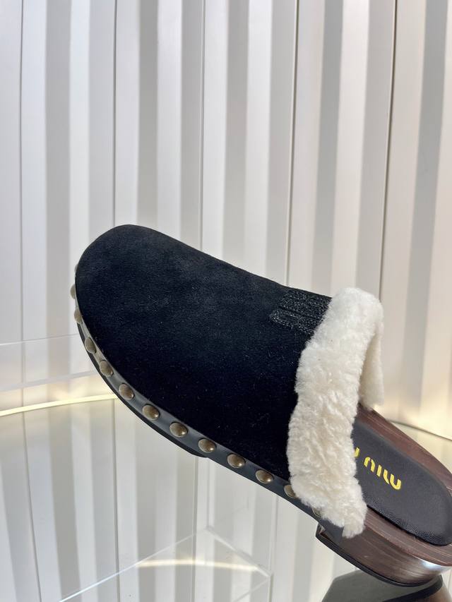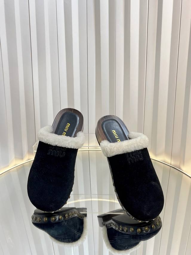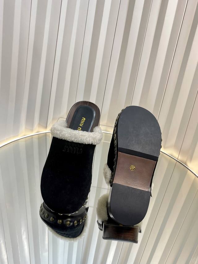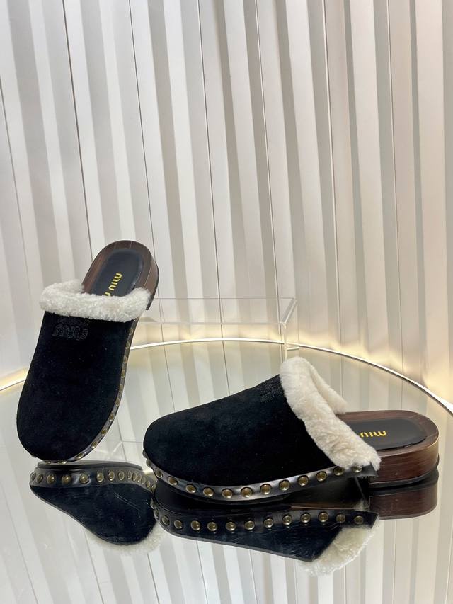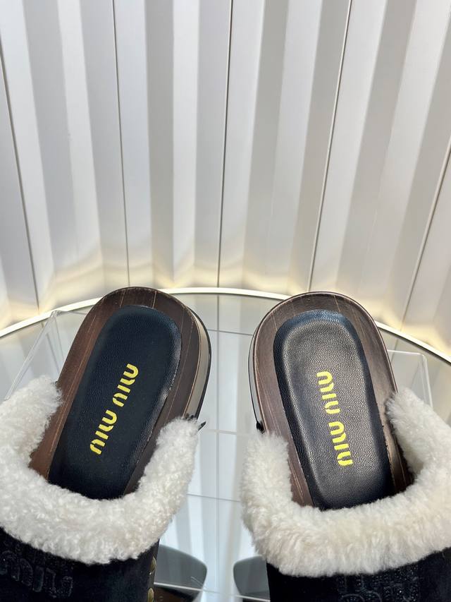 Miumi*25 New Wool Slippers, Thick-Soled Wooden Clogs, Fleece Mules. The upper is
