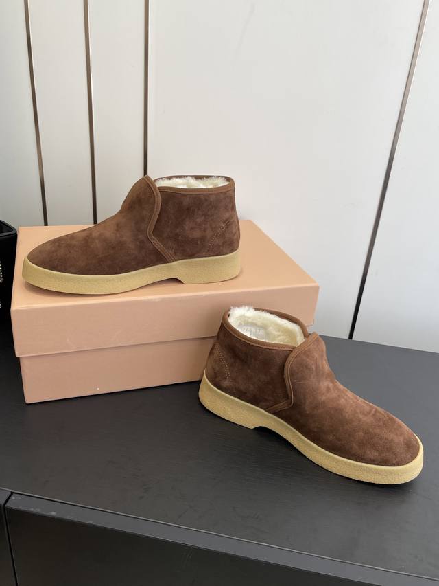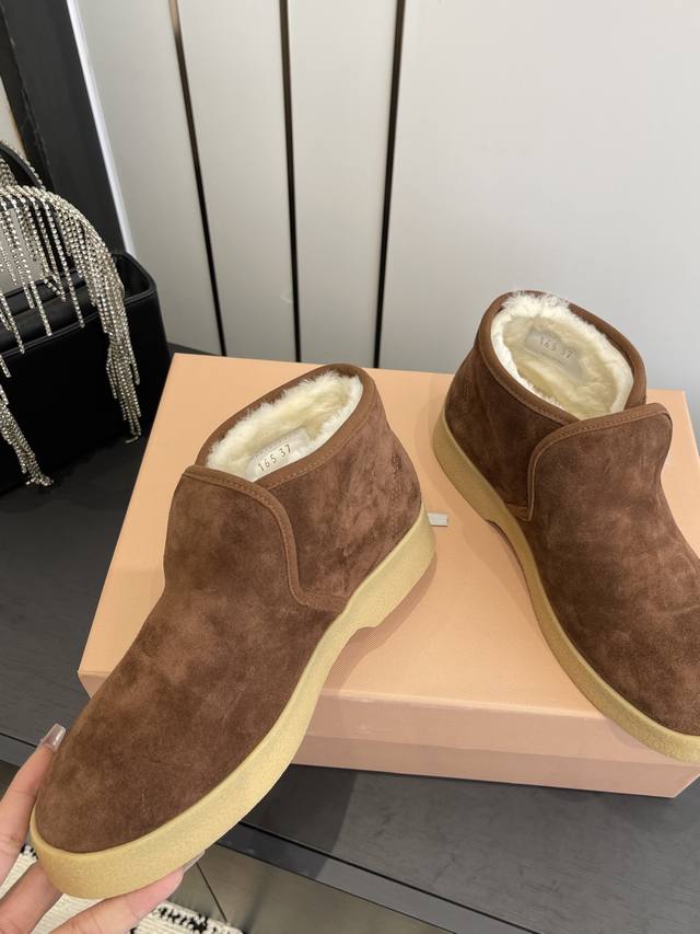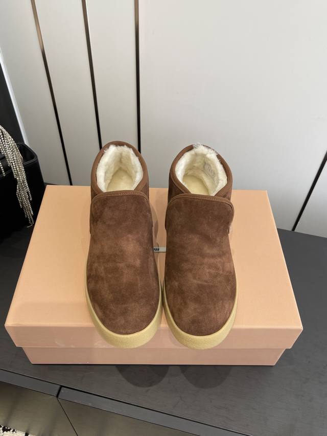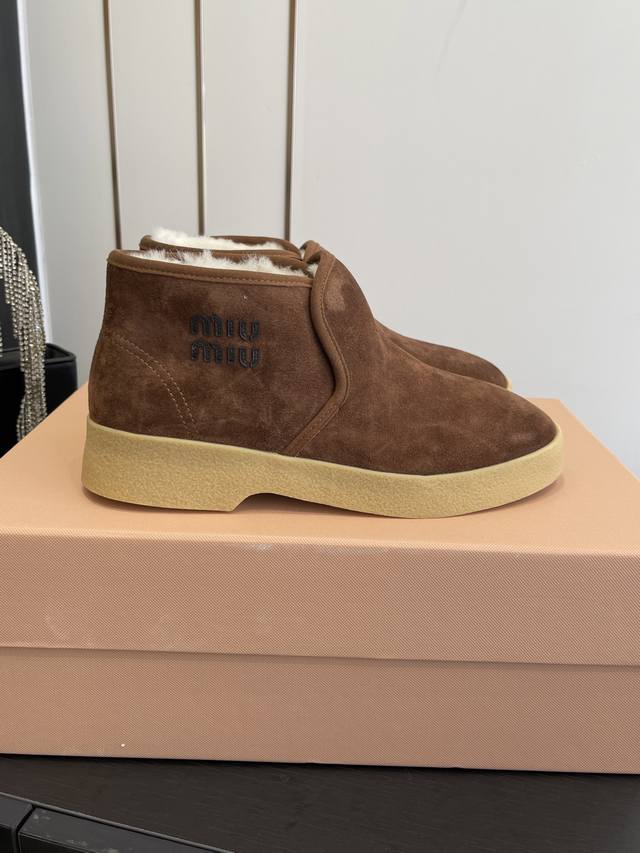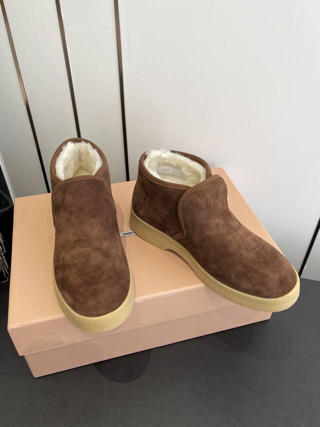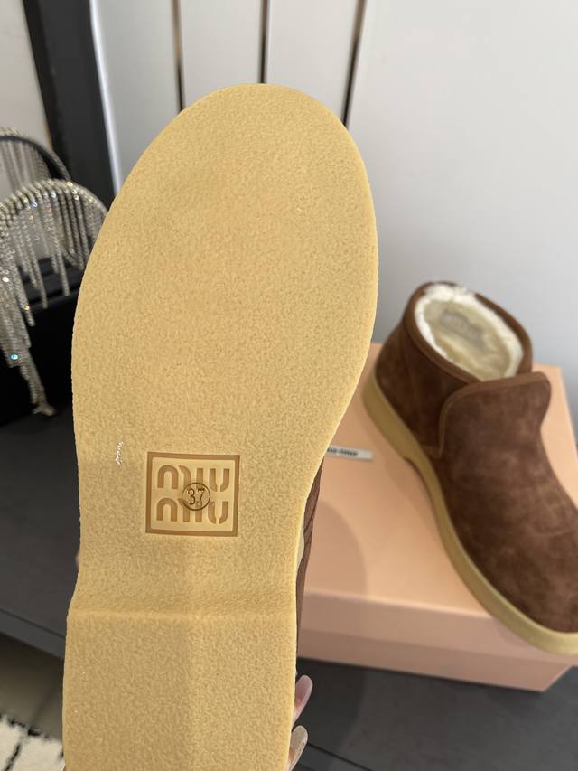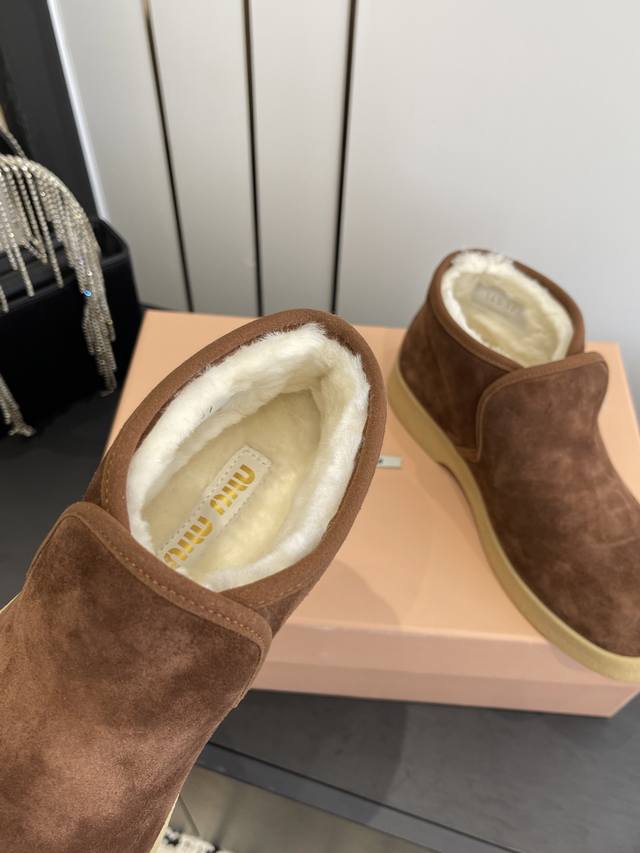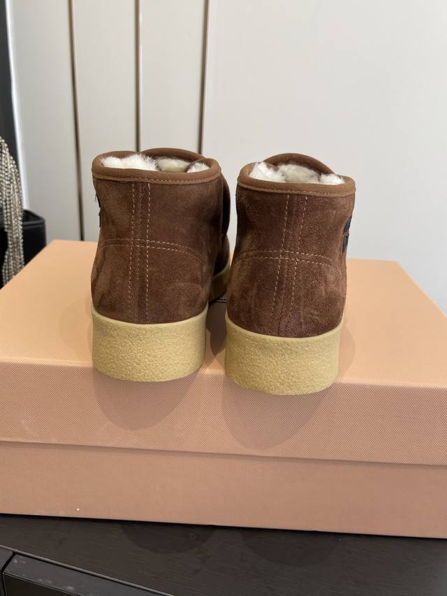 Miu Miu Fall/Winter Runway New Pure Wool Snow Boots - A Warm Choice for Sweet and Cool Girls in Winter. These snow boots reach new heights of sweetness and coolness. From design to details, they perfectly balance girlishness and warmth. The silky suede fabric exudes a delicate and luxurious feel. The wool trim at the opening is fluffy and soft, visually "warm," and can also flatter the ankle line, making the calves look slimmer. Suitable for everyday outings or winter commutes. Sizes: 35-40. 40 custom-made.