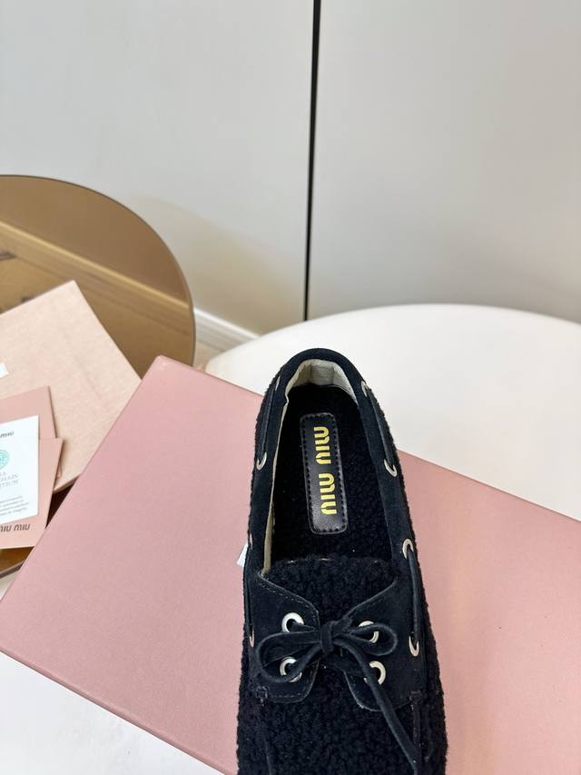 Miu Miu | Miu Miu Lambswool Maillard Style Loafers These white wool loafers from Miu Miu feature soft wool and suede trim, with an incredibly delicate texture! The classic loafer shape and lace-up design offer a retro yet comfortable feel, perfect for autumn and winter. The rubber sole provides excellent slip resistance, making them suitable for everyday commuting or casual wear. The Maillard color scheme is versatile, pairing well with both skirts and trousers, effortlessly creating a relaxed vibe. Miu Miu is known for its exquisite details and comfort, a must-have item for autumn and winter! Sizes 35-40, 40.41 (made to order)