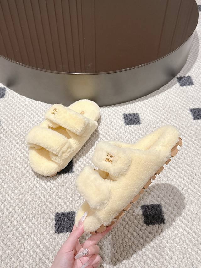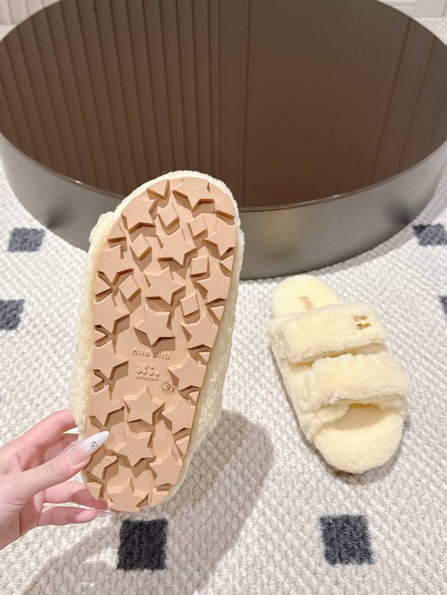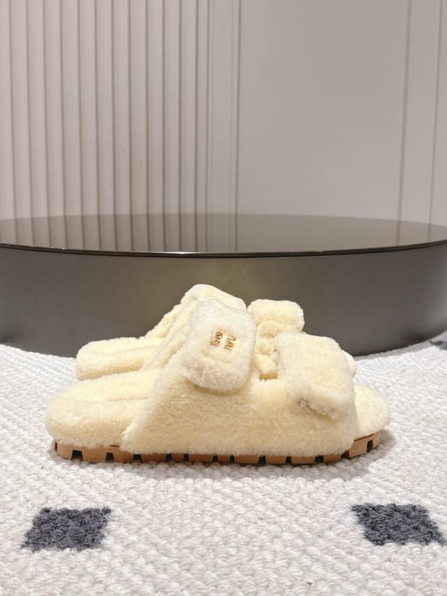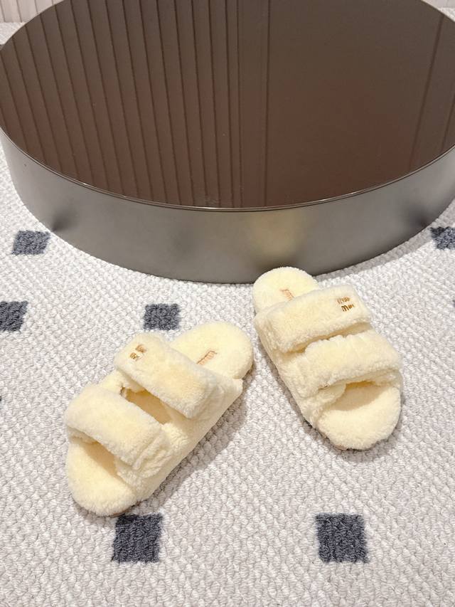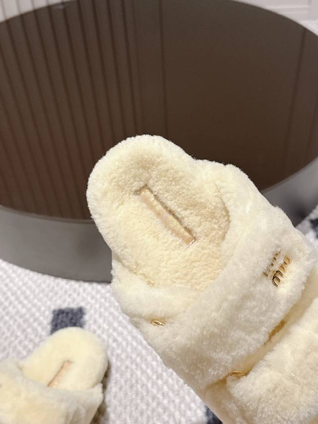 Miu Miu wool slippers, like walking clouds of softness~ The fluffy wool wraps around your feet, so soft it's heart-warming, instantly blocking out the chill of autumn and winter. Simple yet sophisticated, perfect for a relaxed stay-at-home look, or pair with a dress for a stylish outing. Every step feels like walking on soft clouds, achieving comfort and fashion in one go~" Sizes 5-40 41 (custom sizes available)