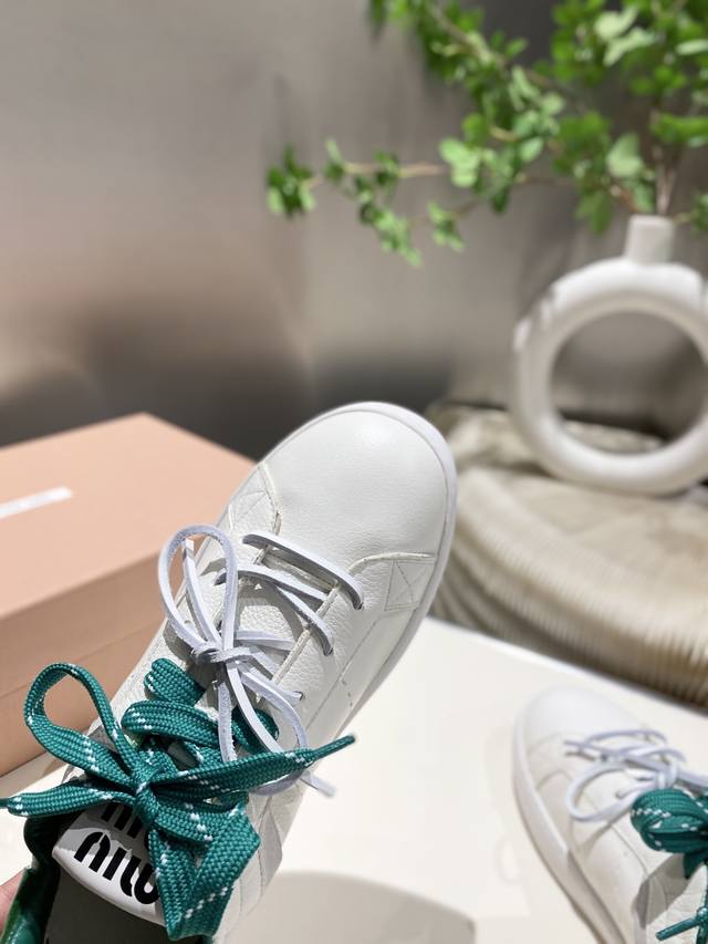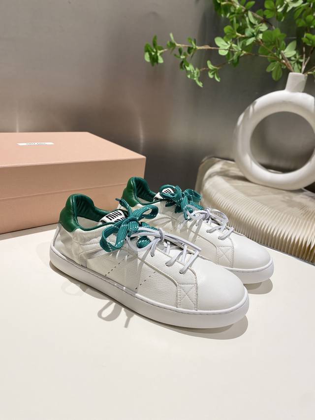 Miu Miu's 2025 Spring/Summer new casual white sneakers are here! A key style featured on the official website, these sneakers boast a simple plaid design and a distinctive tongue, exuding a youthful and sunny vibe. They pair effortlessly with long skirts, short skirts, and shorts, creating a unique style. Features include a super lightweight IP foam sole and a top-grain cowhide lining. The material is a 1:1 replica with a distressed and faded finish. Sizes 35-39, 34-40, and 41 are available. No returns or exchanges.