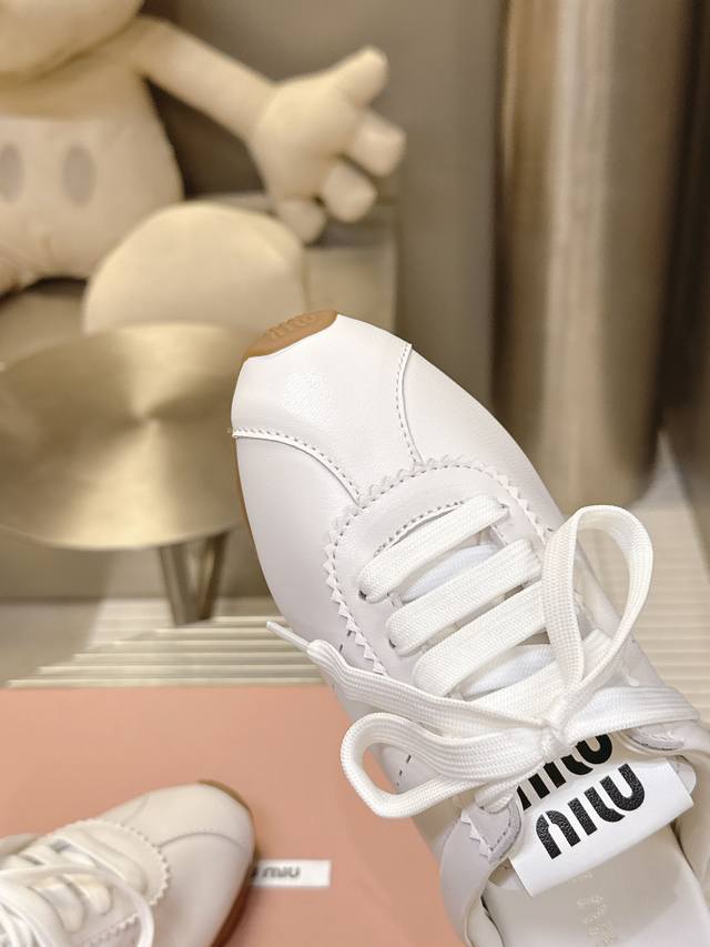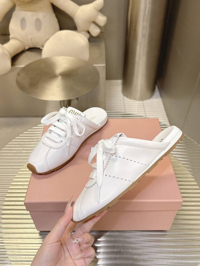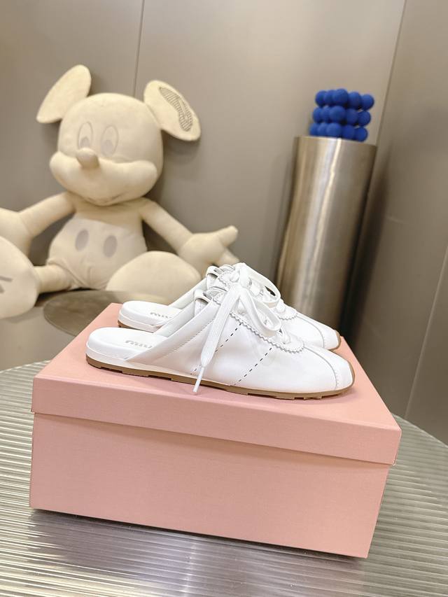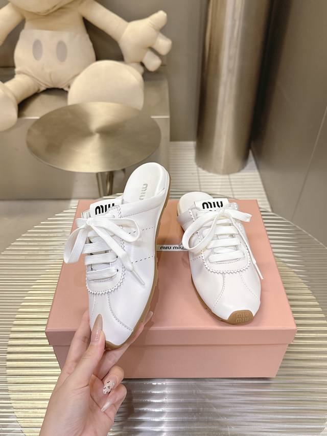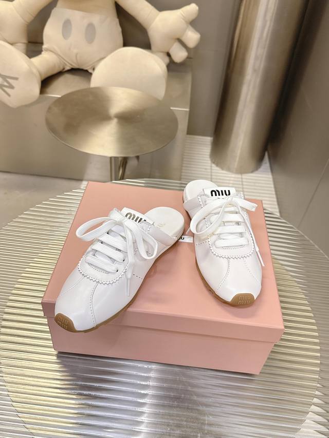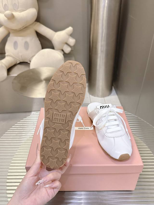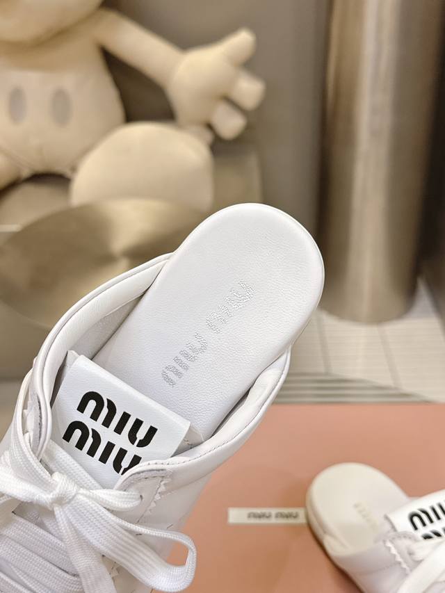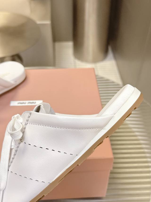 's adjustable straps fit snugly around the ankle, creating a relaxed yet refined look that allows you to walk with style without dragging your feet. The tongue is embellished with the classic Miu Miu logo, a detail-conscious delight
