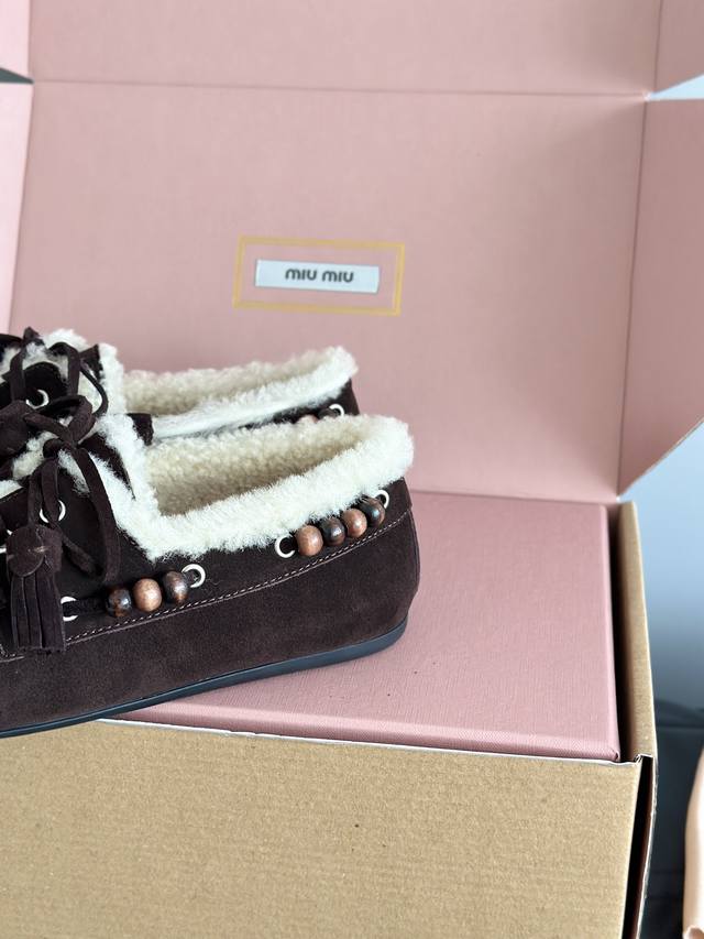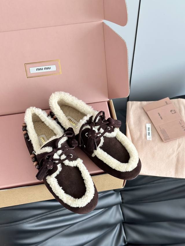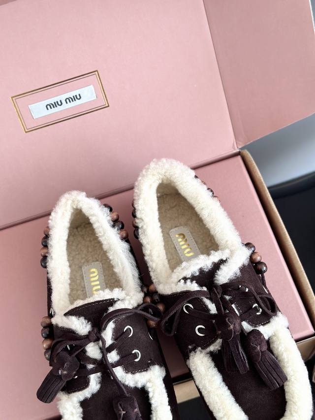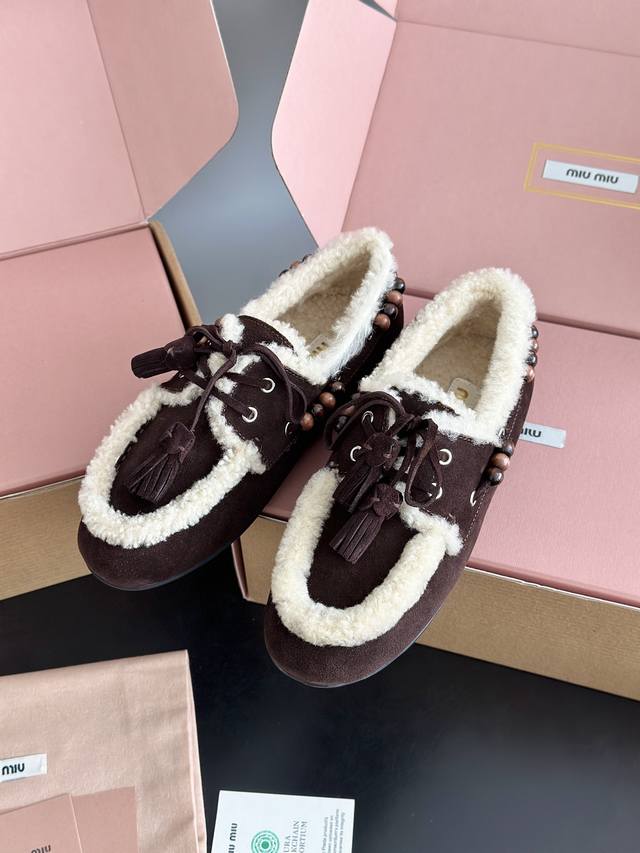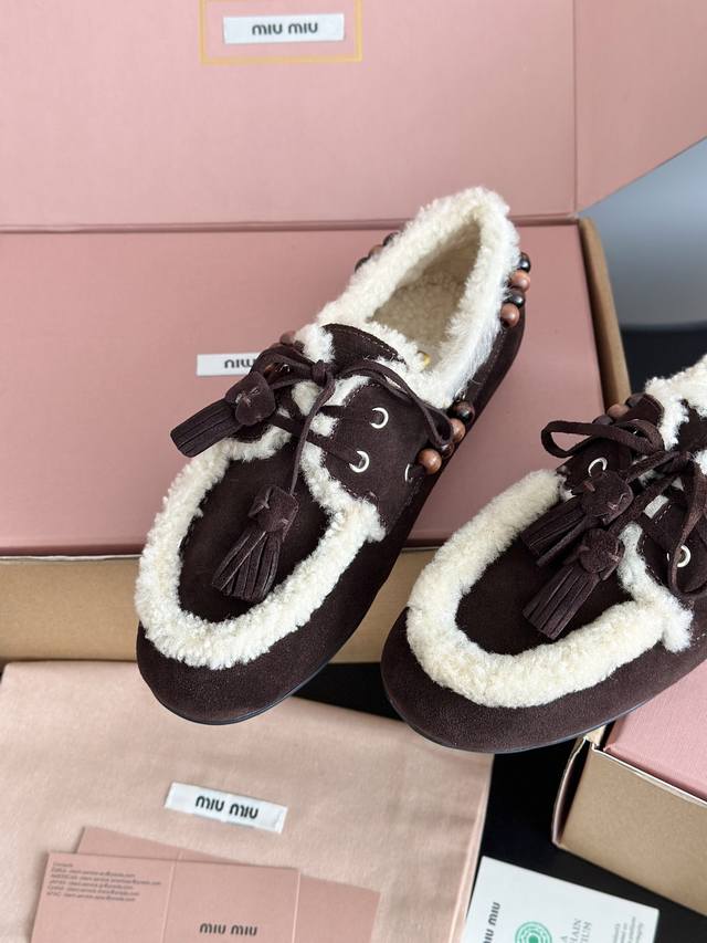Miumi*25 New Lambswool Tassel Loafers DDD Deck Shoes Wool loafers, available in retro shades such as brown and dark brown; white plush embellishments on the edges and opening create a striking contrast, providing both warmth and a touch of cuteness. Wooden beading embellishments adorn the sides, and tassel elements are added to the laces, maximizing the retro feel; the shoe shape is a classic loafer silhouette, the retro feel of the warm plush shoes colliding with the softness of a dress to create a unique style. DDD The upper is made of original cow suede, the lining is pure wool, and the outsole is made to the original mold. DDD Sizes: 35, 40. 40 is custom-made, no returns or exchanges. DDD