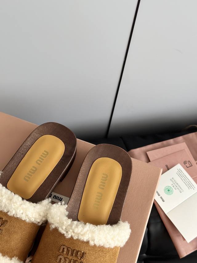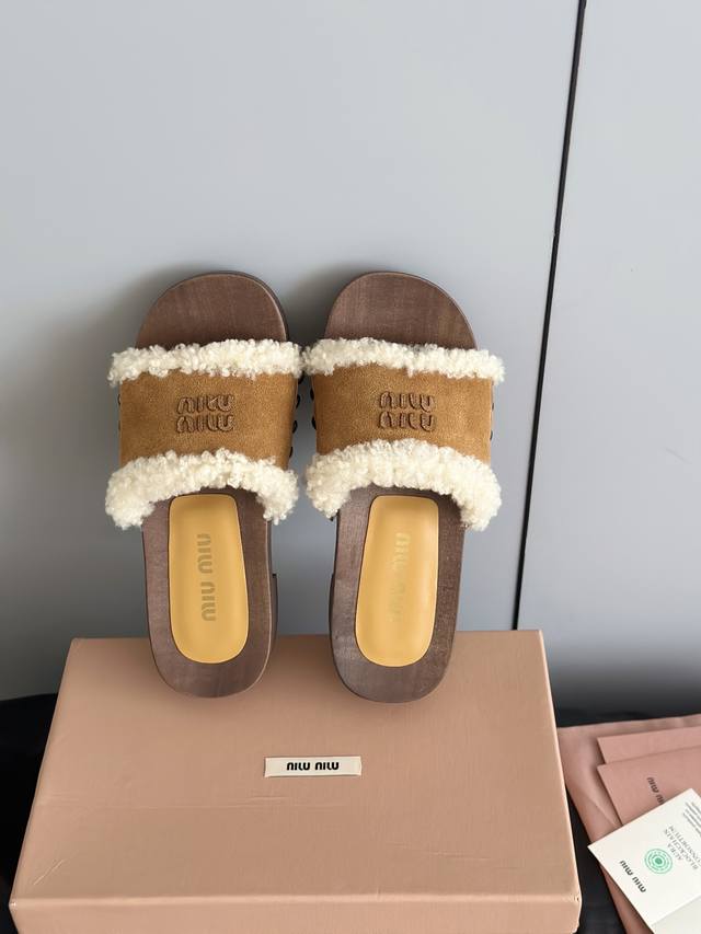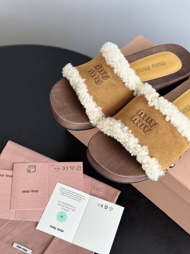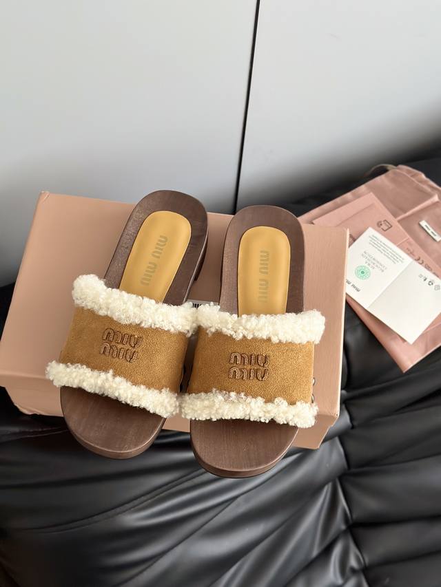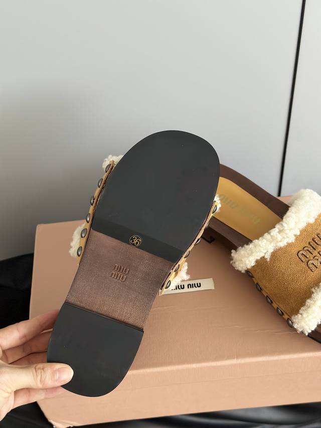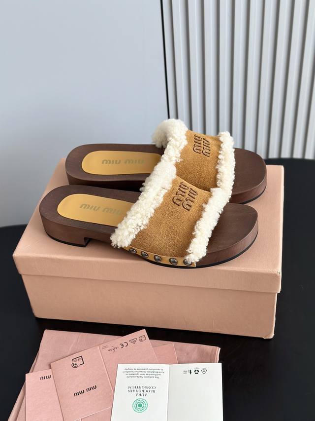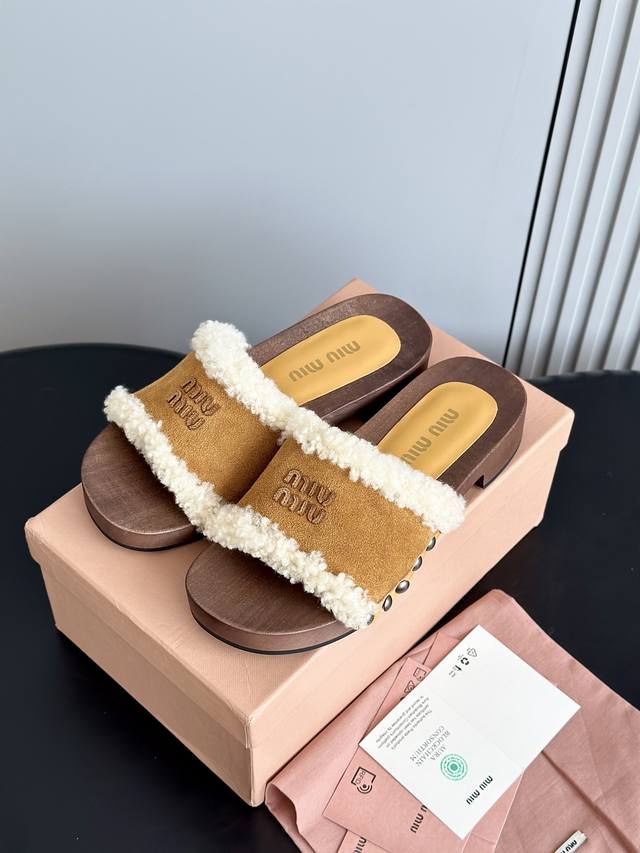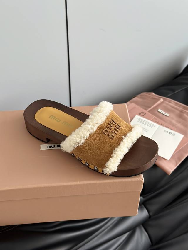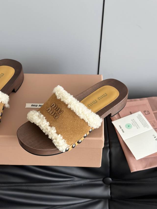Miumi*25 New Wool Slippers, Thick-Soled Wooden Clogs, Hair Slippers. The upper is made of suede, a material that is not only soft to the touch but also has a natural texture and retro charm, adding a touch of luxury. A plush trim around the opening looks warm and comfortable, enhancing the shoe's style while providing warmth and support for the ankles, making it especially suitable for cooler seasons. A row of metal rivets adorns the side, adding a punk and fashionable touch, breaking the monotony of traditional slippers and making the shoes more individual and trendy. The upper is made of original high-gloss suede, with a sheepskin lining and an original molded solid wood combination rubber outsole. Sizes: 35-39, 40-41. Custom orders are non-refundable.