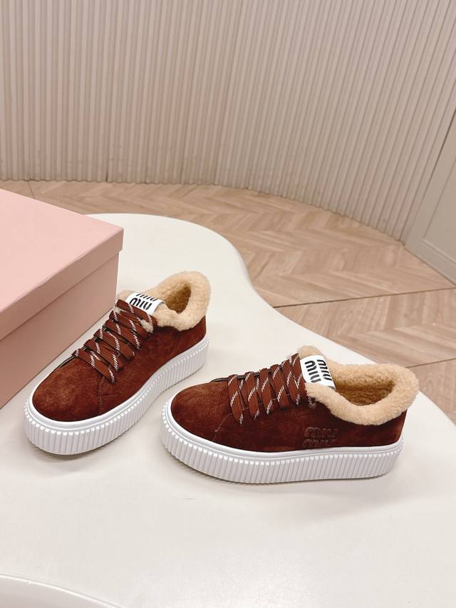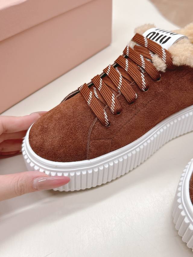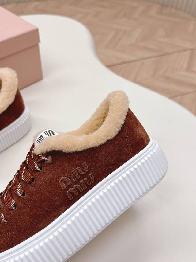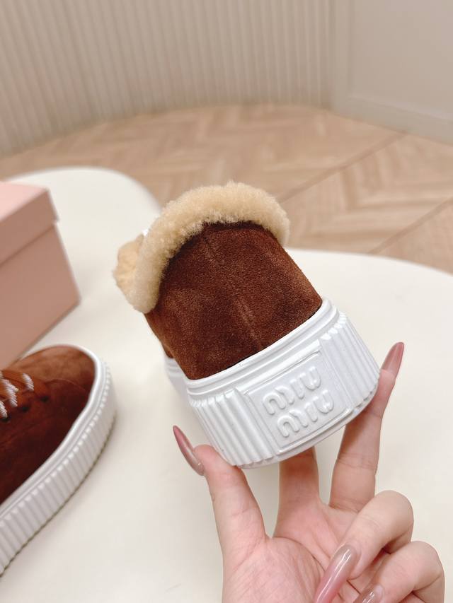 Miumiu 2025 Autumn/Winter New Style Wool Platform Biscuit Shoes - A classic winter upgrade with added wool for a 4cm height increase. These shoes combine the elegance and lightness of biscuit shoes with the cuteness and warmth of a plush texture, making them both stylish and practical. Upper: Original cowhide leather; Lining: Custom wool; Outsole: Original molded non-slip outsole; Sizes: 35-40