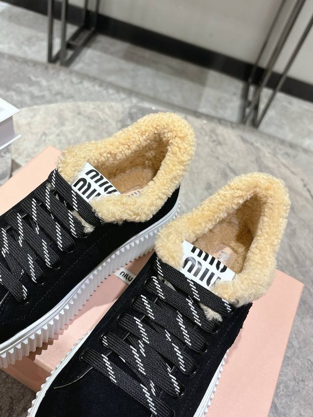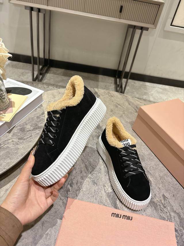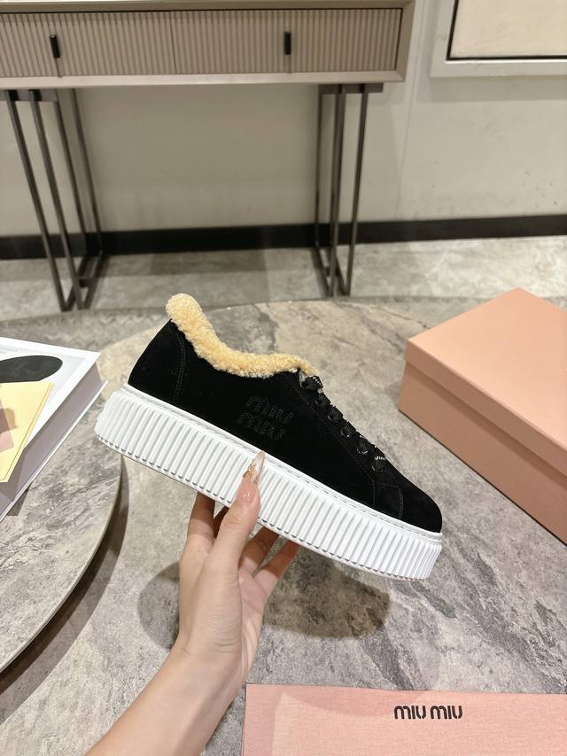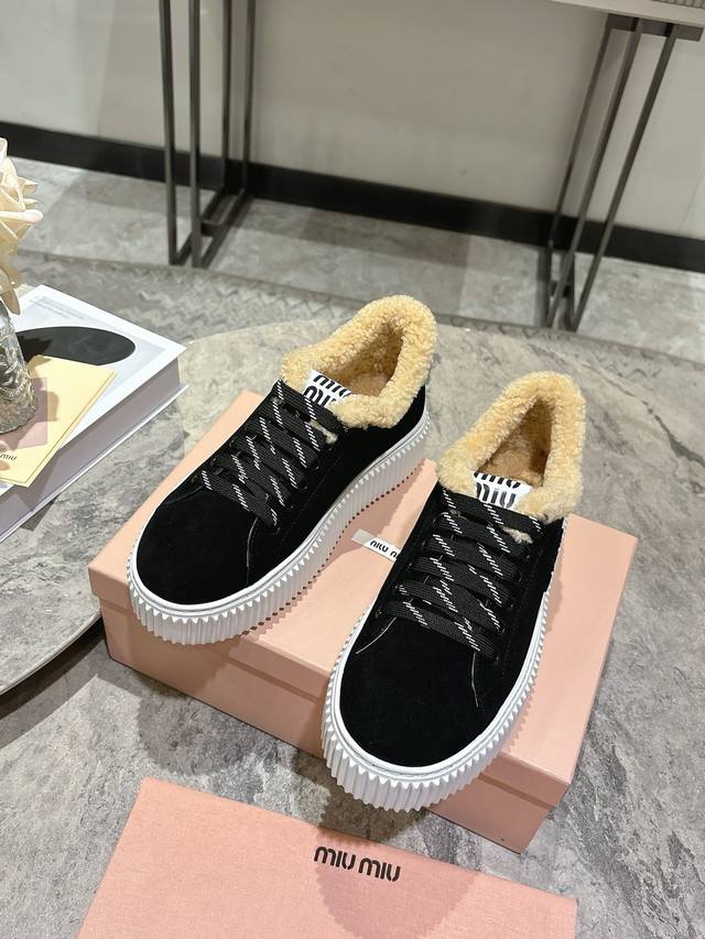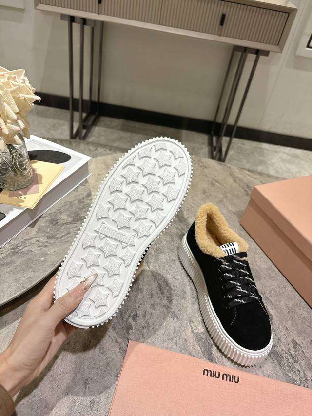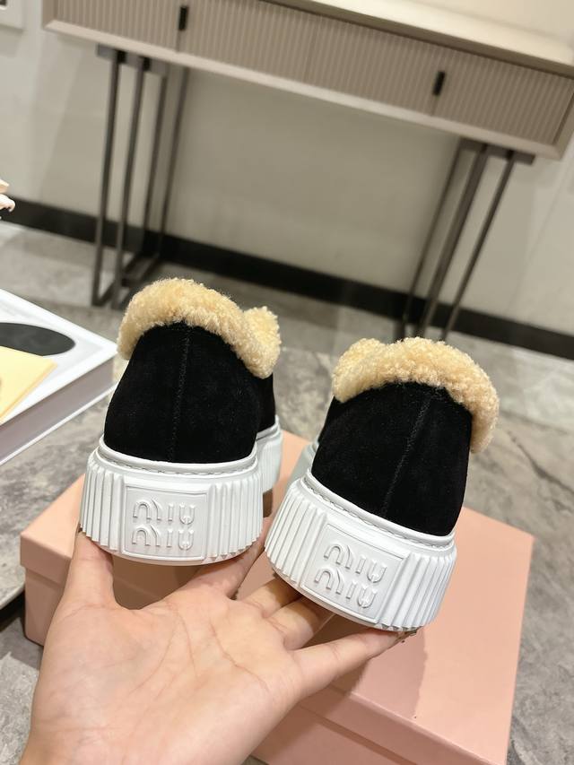 Miumiu 2025 Autumn/Winter New Style Wool Platform Biscuit Shoes - A classic winter upgrade with added wool for a 4cm height increase. These biscuit shoes combine the elegance and lightness of traditional biscuit shoes with the cuteness and warmth of a plush texture, making them both stylish and practical. Upper: Cow suede Lining: Wool Outsole: Original foam anti-slip outsole Sizes: 35-39, 40 (custom made)