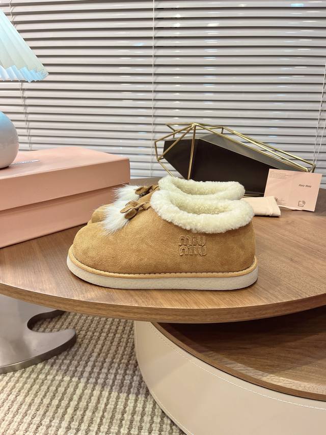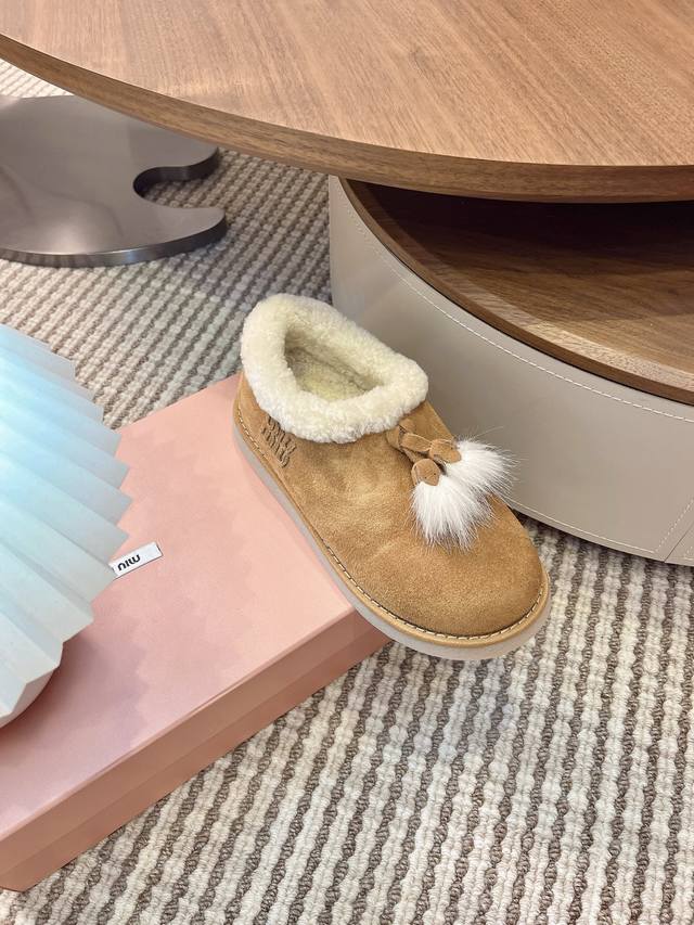Miumiu 2025Ss Fall/Winter Runway Look F027 Tassel Fur Slip-on Ankle Boots, Low-cut Snow Boots. Frequently featured on the covers of major fashion magazines, loved by celebrities and Xiaohongshu bloggers. The fur pendant adds elegance, and the boots are absolutely stunning