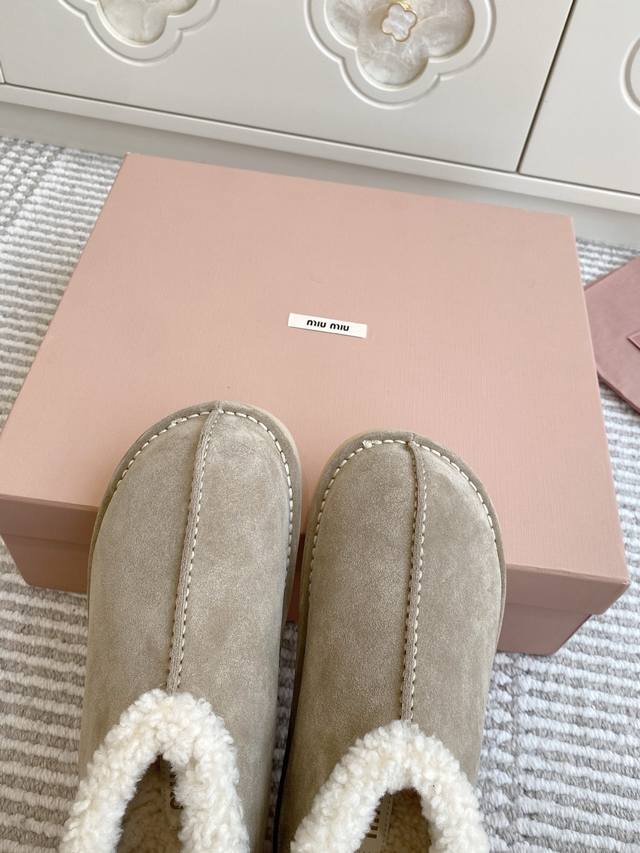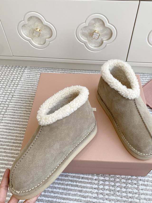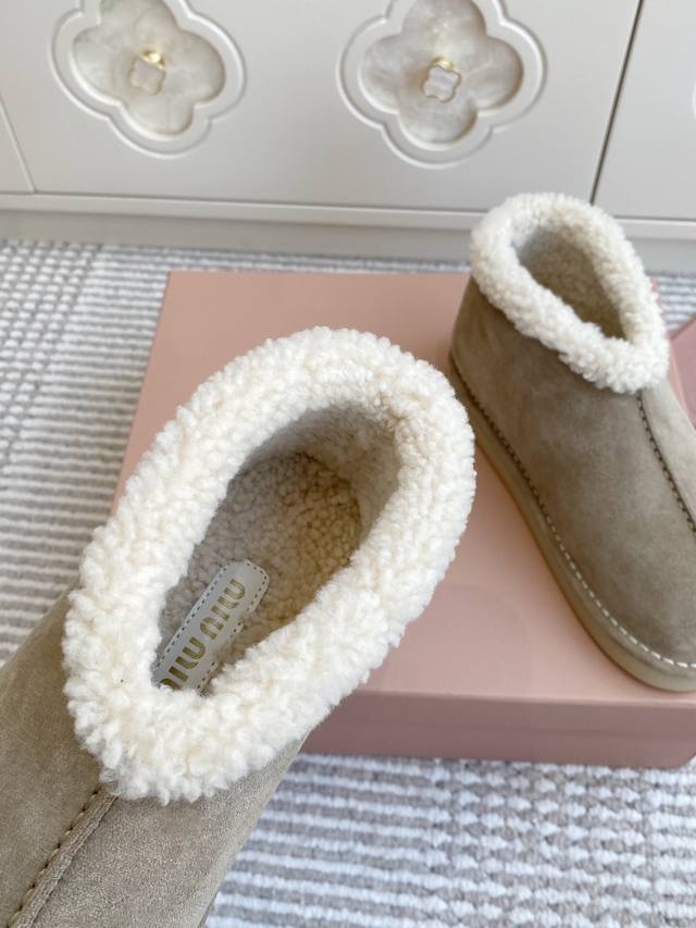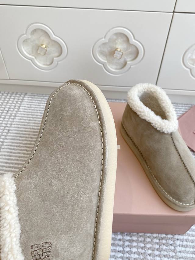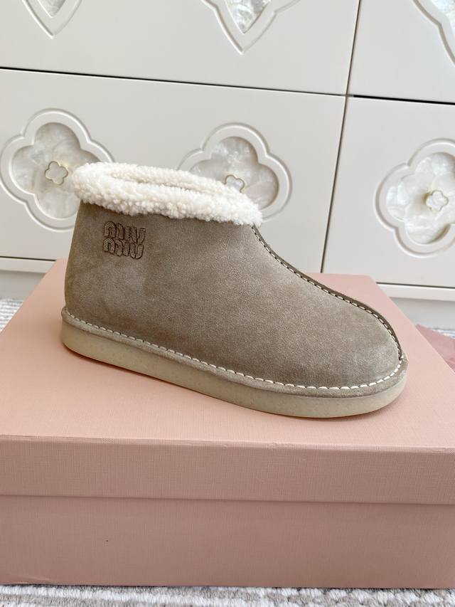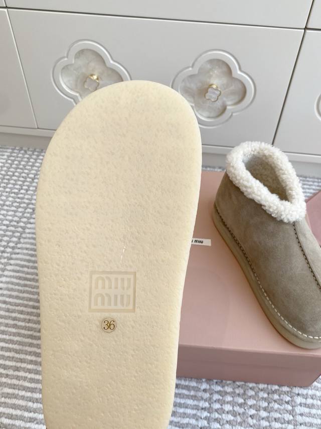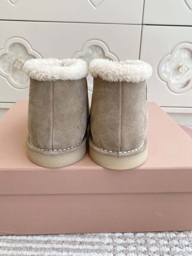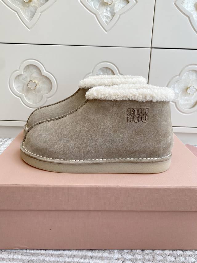 Miumiu 2025Ss Fall/Winter Runway Wool Ankle Boots, Snow Boots, Furry Shoes. Frequently featured on the covers of major fashion magazines, loved by celebrities and Xiaohongshu bloggers. They look amazing on, a must-have you won't regret. Extremely comfortable and stable, versatile with both casual and sweet styles. Developed hardware, custom colors. Upper: Imported high-gloss cow suede. Lining: Australian imported sheep wool. Sole: Developed rubber outsole. Sizes: 35-40, 40.41 (custom available). Full packaging included.