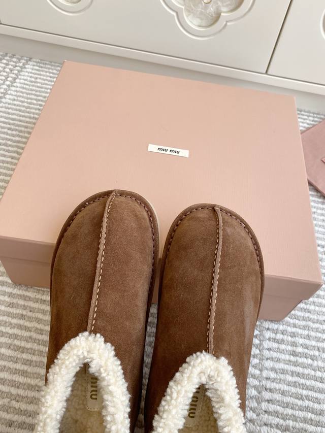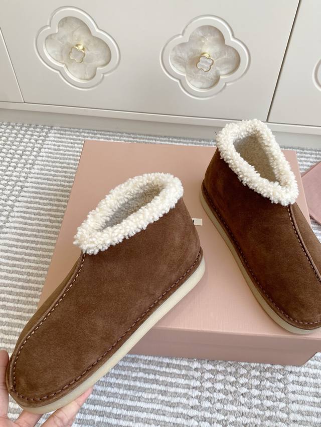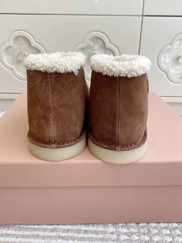 Miumiu 2025Ss Fall/Winter Runway Wool Ankle Boots, Snow Boots, Furry Shoes. Frequently featured on the covers of major fashion magazines, loved by celebrities and Xiaohongshu bloggers. They look amazing on, a must-have you won't regret. Extremely comfortable and stable, versatile with both casual and sweet styles. Developed hardware, custom colors. Upper: Imported high-gloss cow suede. Lining: Australian imported sheep wool. Sole: Developed rubber outsole. Sizes: 35-40, 40.41 (custom available). Full packaging included.
