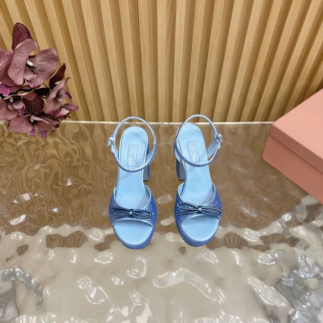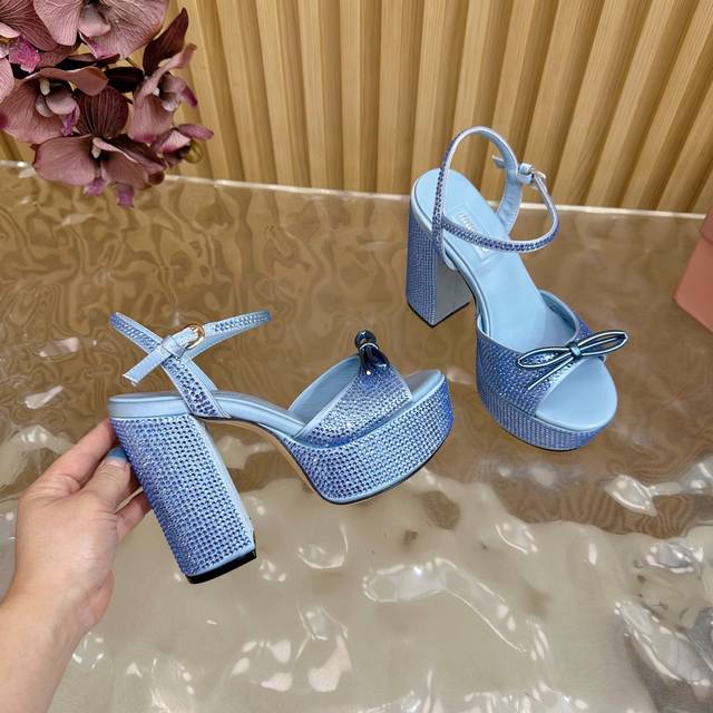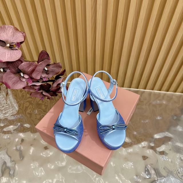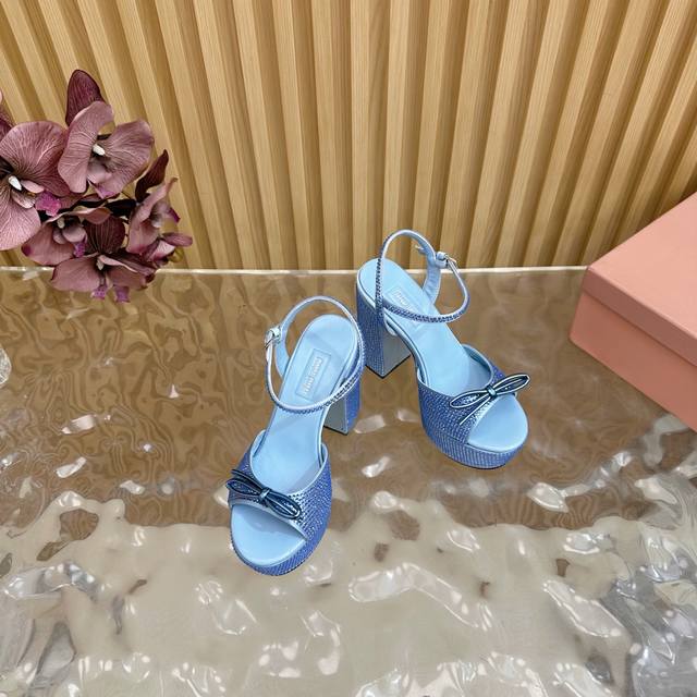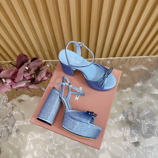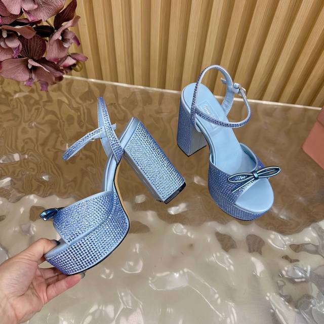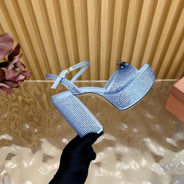 Miumiu 25S Spring/Summer New Arrival Waterproof Platform Chunky Heel Sandals. The heel is studded with sparkling teardrop rhinestones