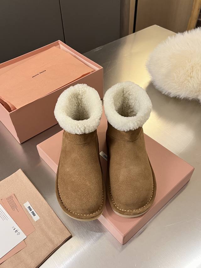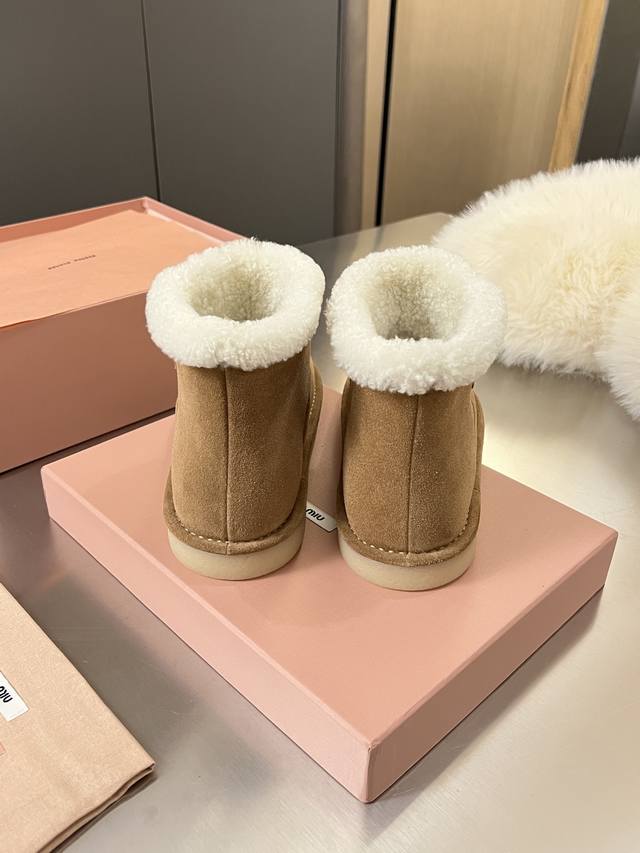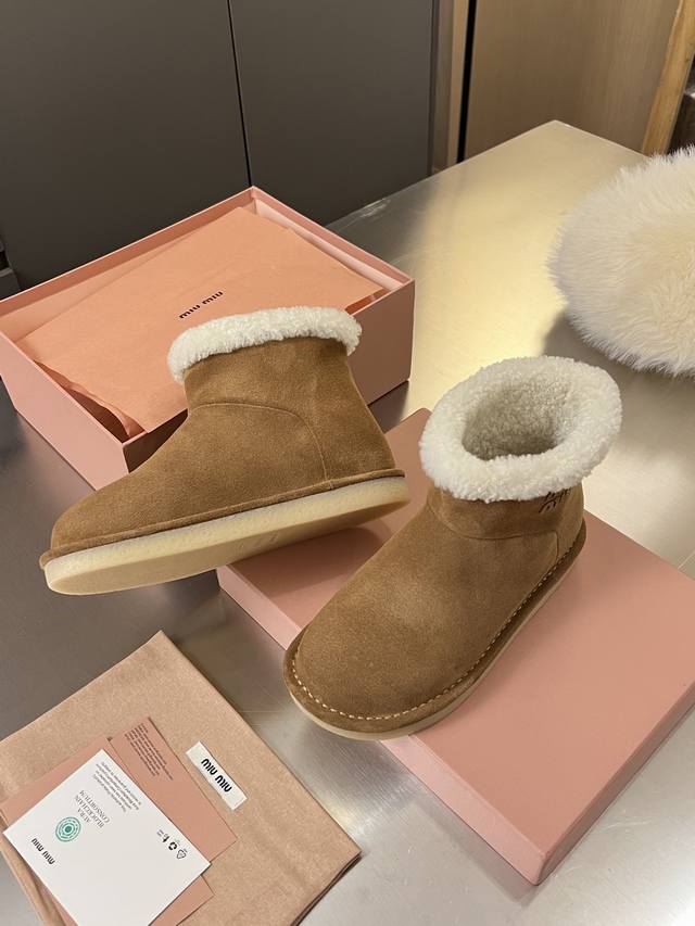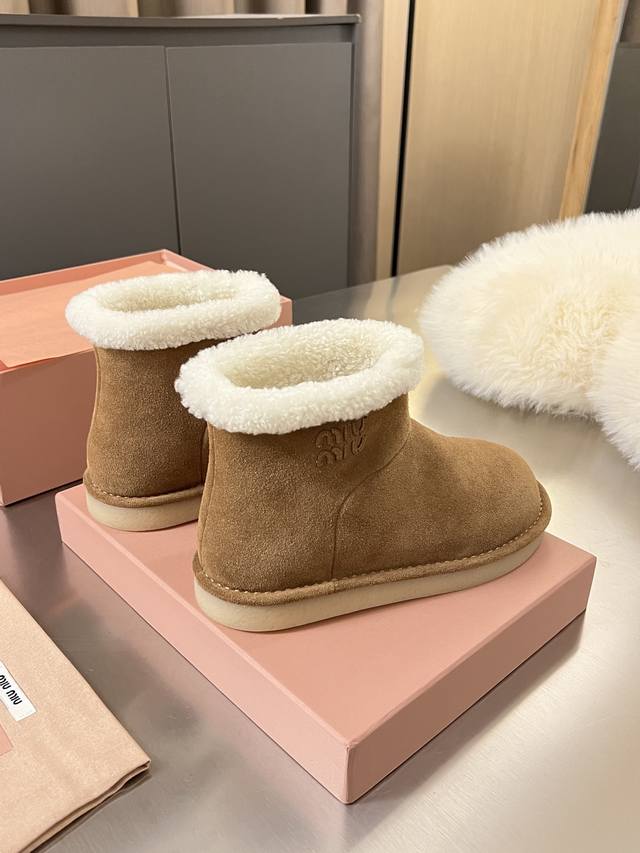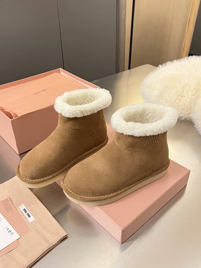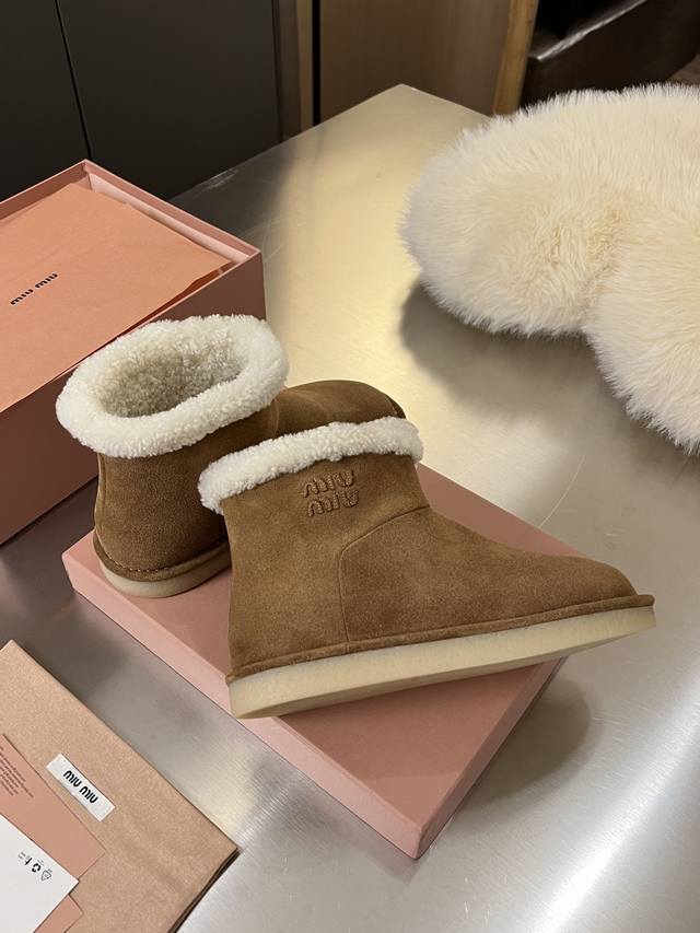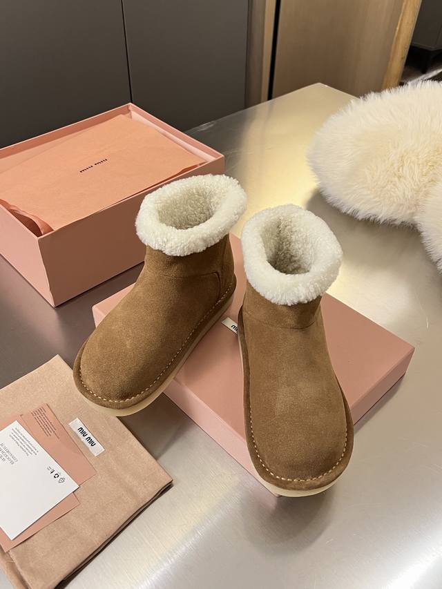 Miumiu Autumn/Winter Runway New Pure Wool Snow Boots, Original 1:1 Edge-Wrapped High-End Version. A warm choice for sweet and cool girls in winter. Snow boots reach a new level of sweetness and coolness. From the design to the details, they perfectly balance girlishness and warmth. The silky cow suede material has a delicate and high-end feel. The woolen trim at the shoe opening is fluffy and soft, visually "warm" and can also modify the ankle line, making the calves look slimmer. Original 1:1 Crystal Lightweight Outsole. Suitable for both everyday outings and winter commutes. Colors: Chestnut, Sand, Peach Wood. Sizes: 35-40. Factory Price: Factory Price, In Stock.