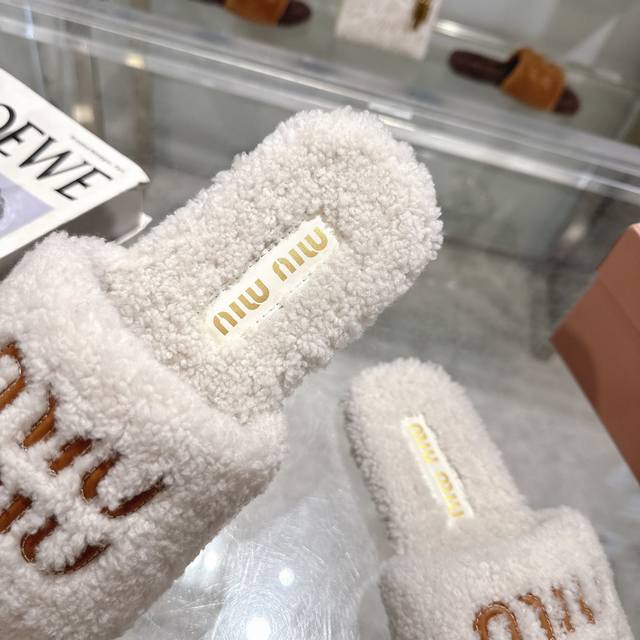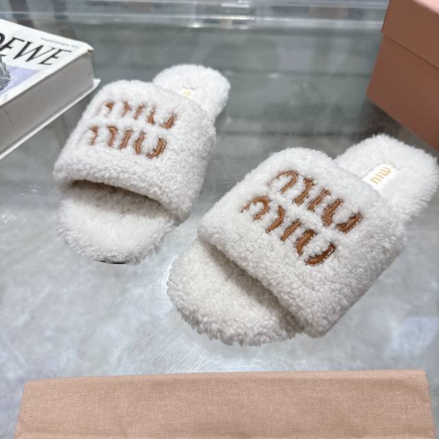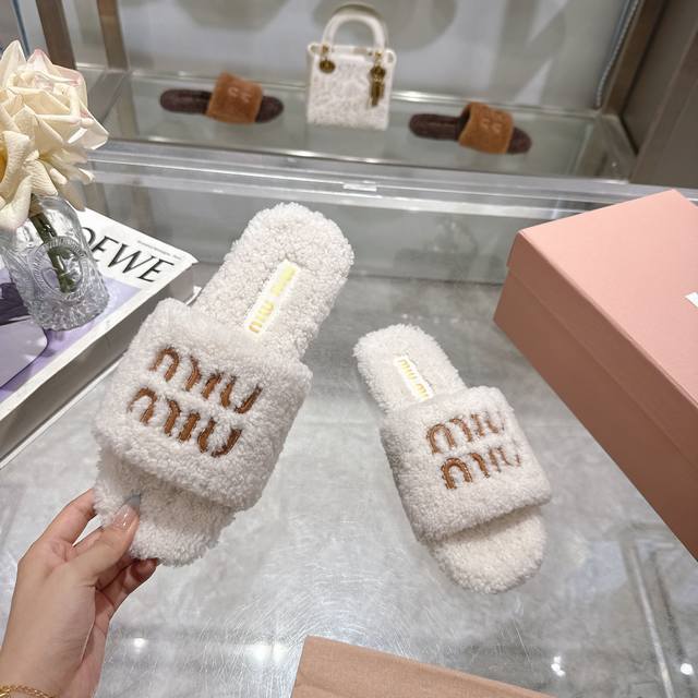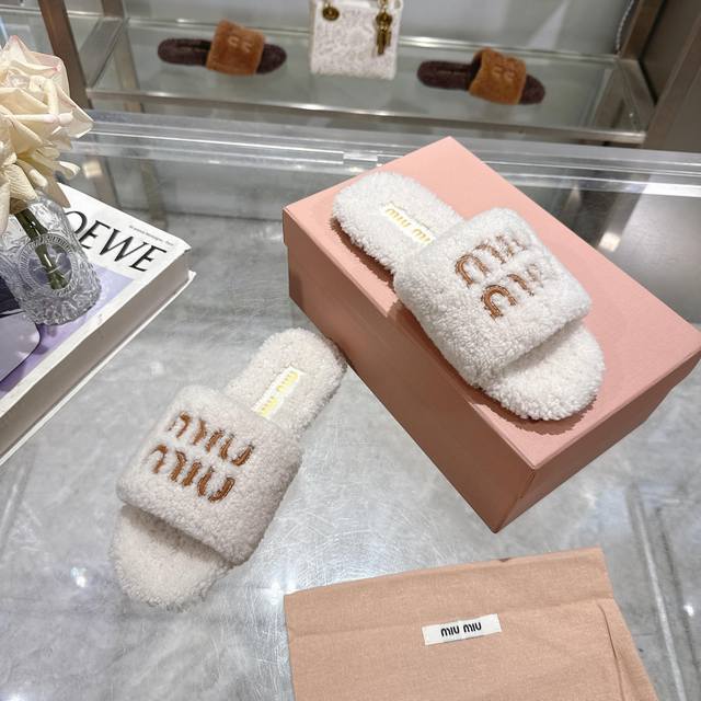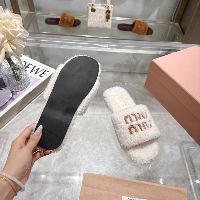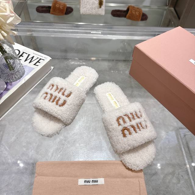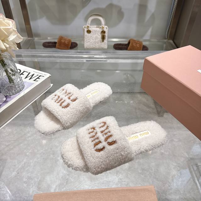 Miumiu classic autumn and winter furry slippers with lettering. There are so many beautiful shoes this season, and these furry slippers are so cute!