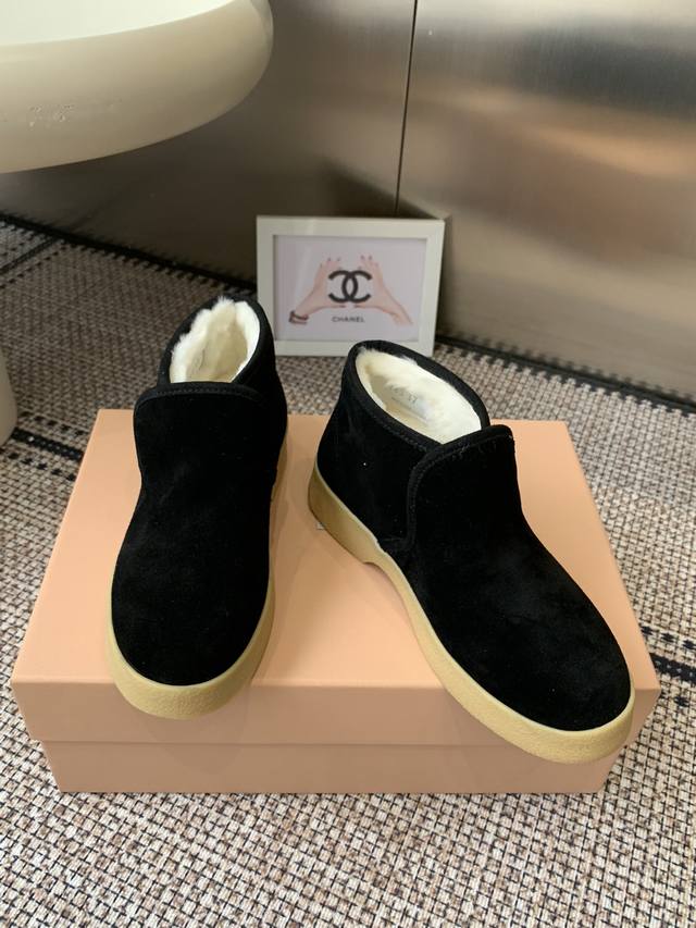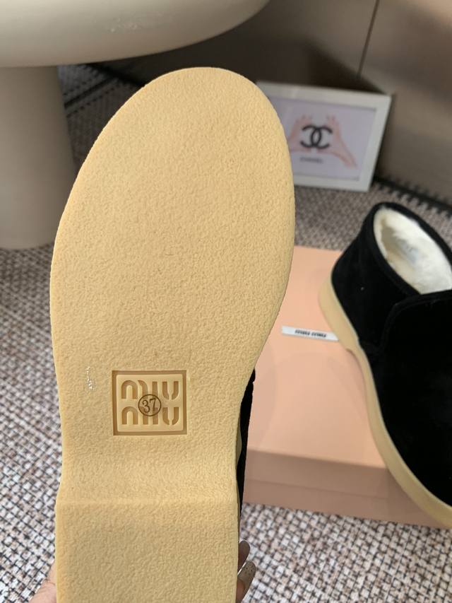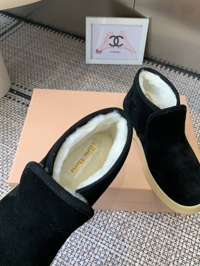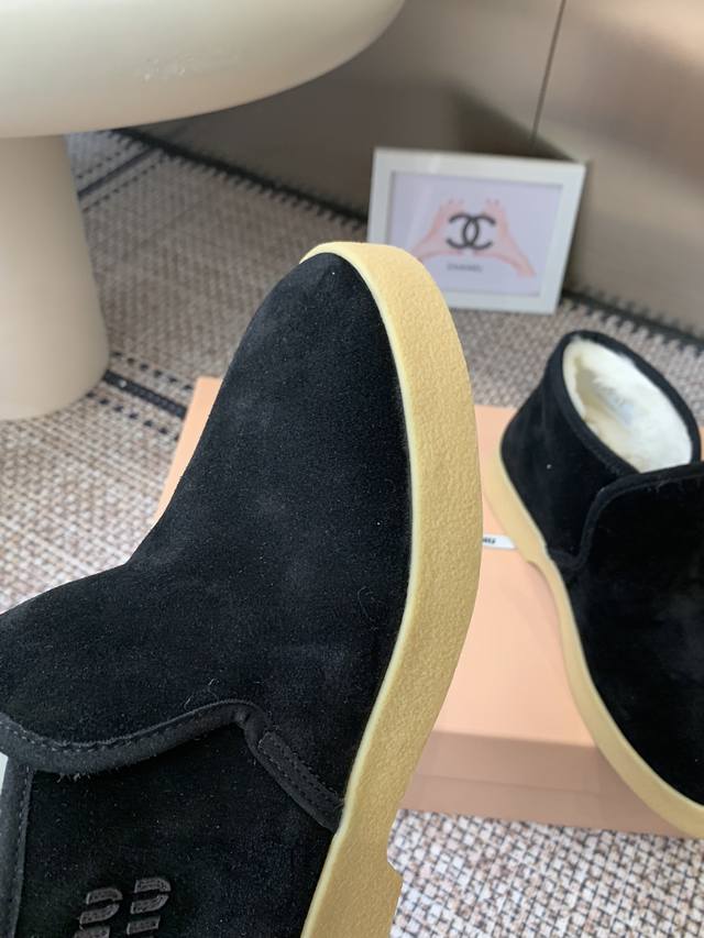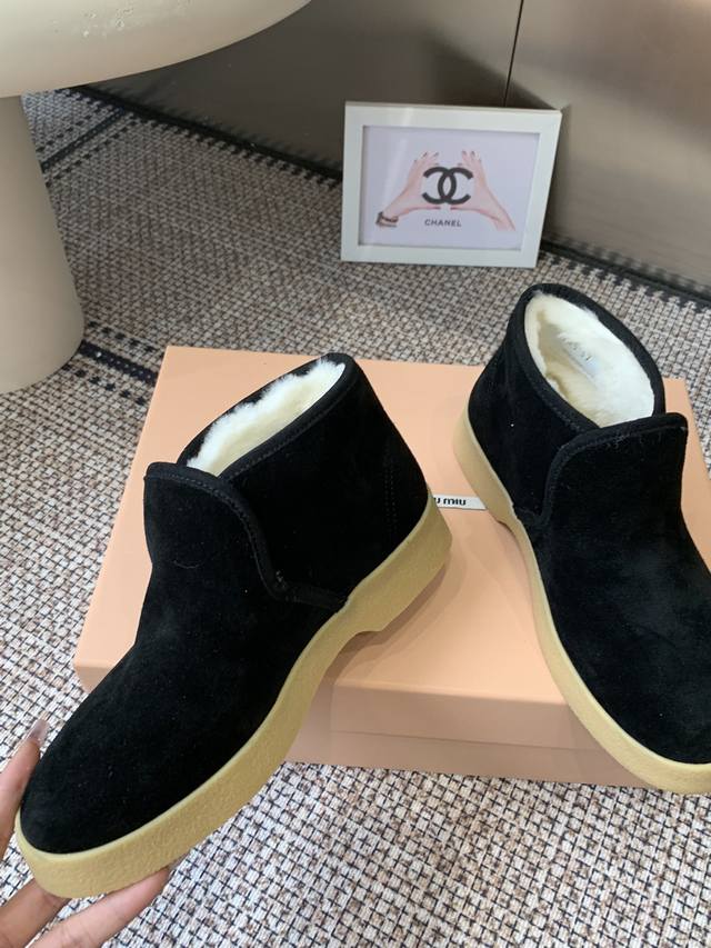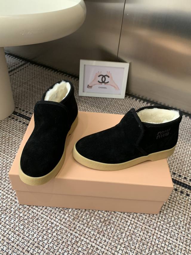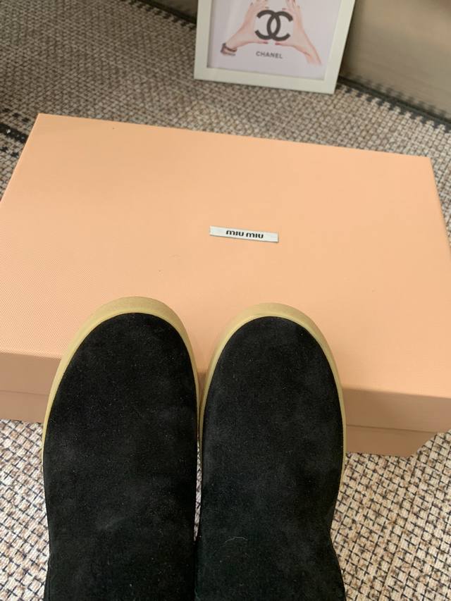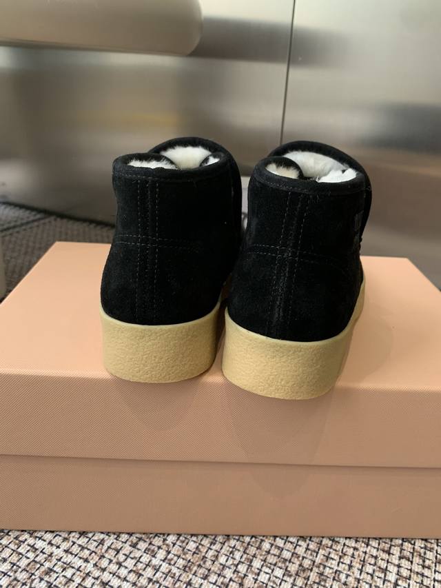 Miumiu Fall/Winter Runway New Pure Wool Snow Boots - A Warm Choice for Sweet and Cool Girls in Winter. These snow boots reach new heights of sweetness and coolness. From design to details, they perfectly balance girlishness and warmth. The silky suede fabric exudes a delicate and luxurious feel. The wool trim at the opening is fluffy and soft, visually very warm, and can also flatter the ankle line, making the calves look slimmer. Suitable for everyday outings or winter commutes. Sizes: 35-40. Size 40 is custom-made and non-refundable.
