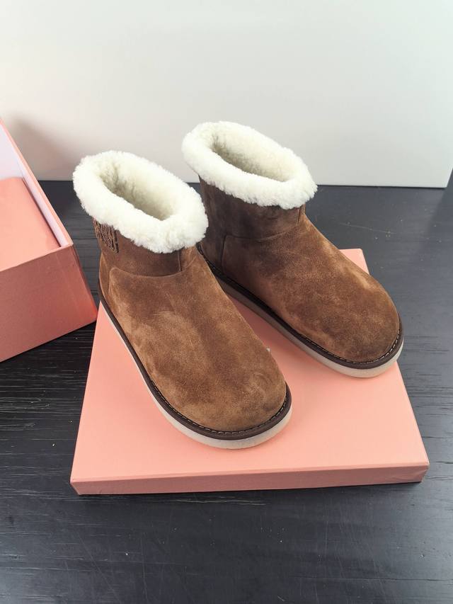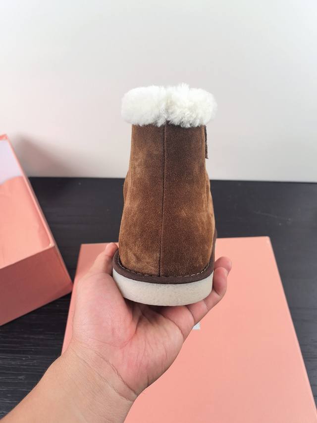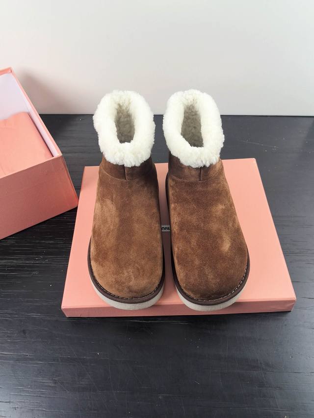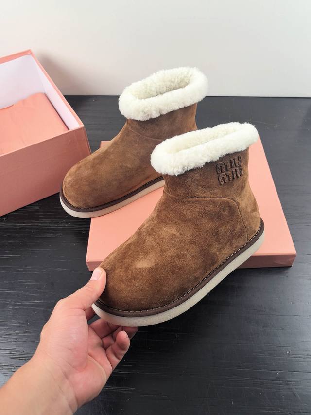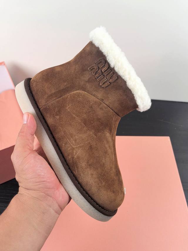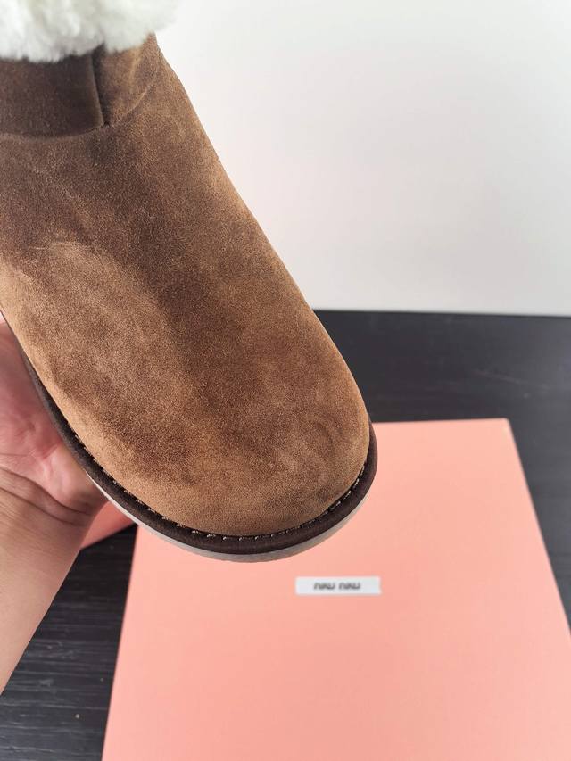 Miumiu Fall/Winter Runway New Pure Wool Snow Boots, Original 1:1 Replica with Bound Edges, High-End Version. A Warm Choice for Sweet and Cool Girls in Winter. Snow boots reach a new level of sweetness and coolness. From the design to the details, they perfectly balance girlishness and warmth. The silky cow suede material has a delicate and high-end feel, and the wool trim at the shoe opening is fluffy and soft, visually "warm" and can also modify the ankle line, making the calves look slimmer. Original 1:1 Crystal Lightweight Outsole, suitable for both everyday outings and winter commutes. Colors: Chestnut, Sand, Peach Wood. Sizes: 35-40.