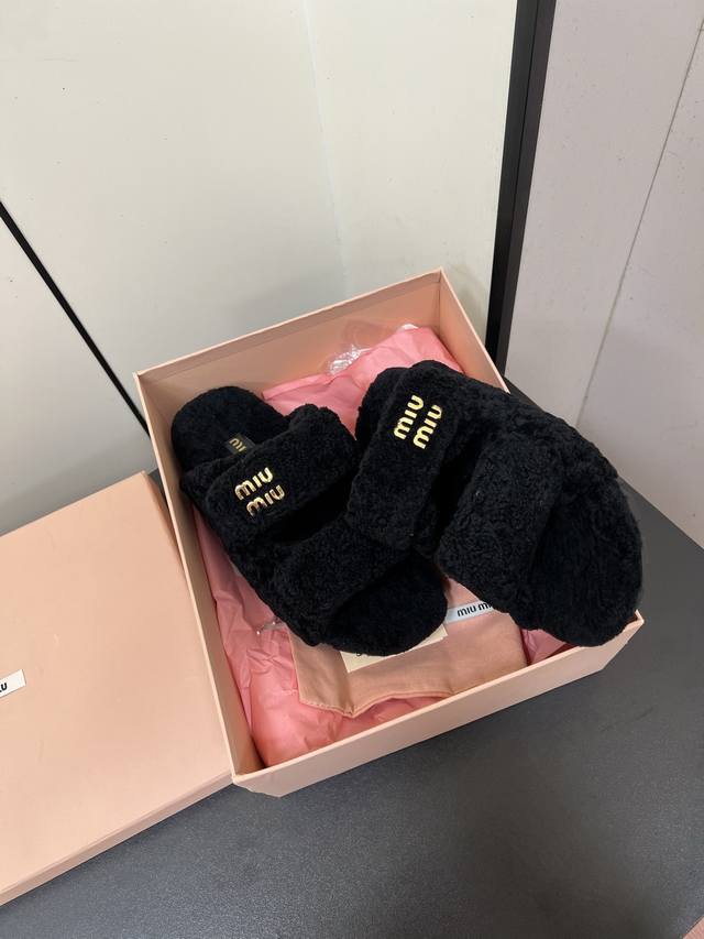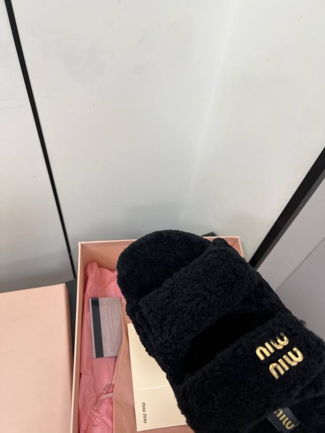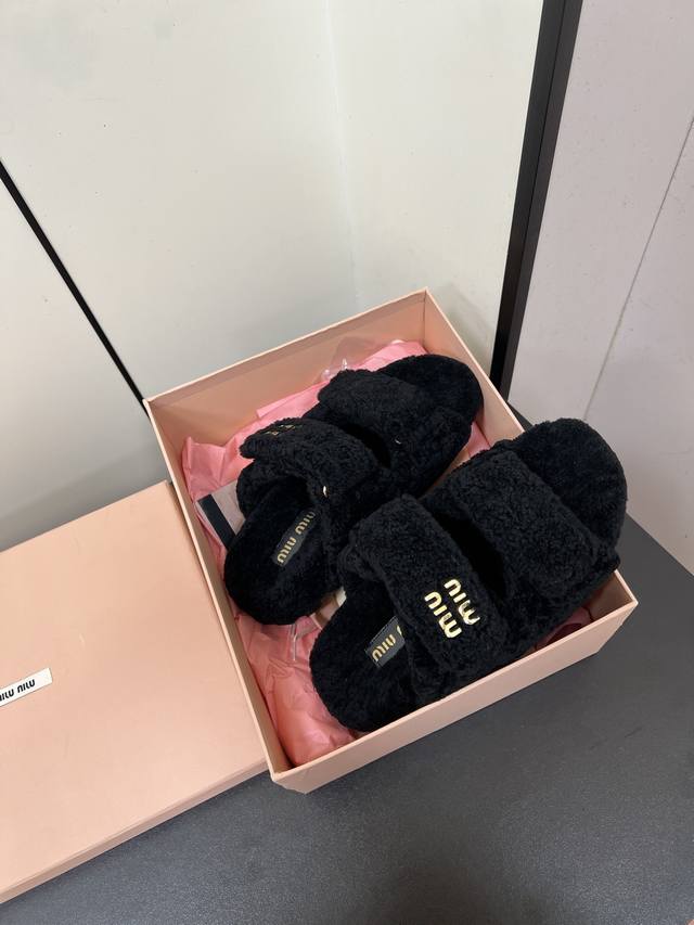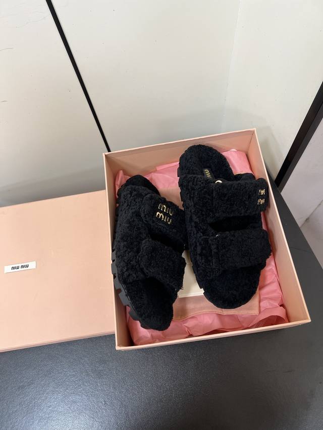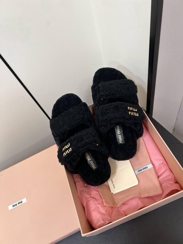 Miumiu Miu Miu 2025Ss Autumn and Winter New Home Velcro Furry Slippers Furry Slippers