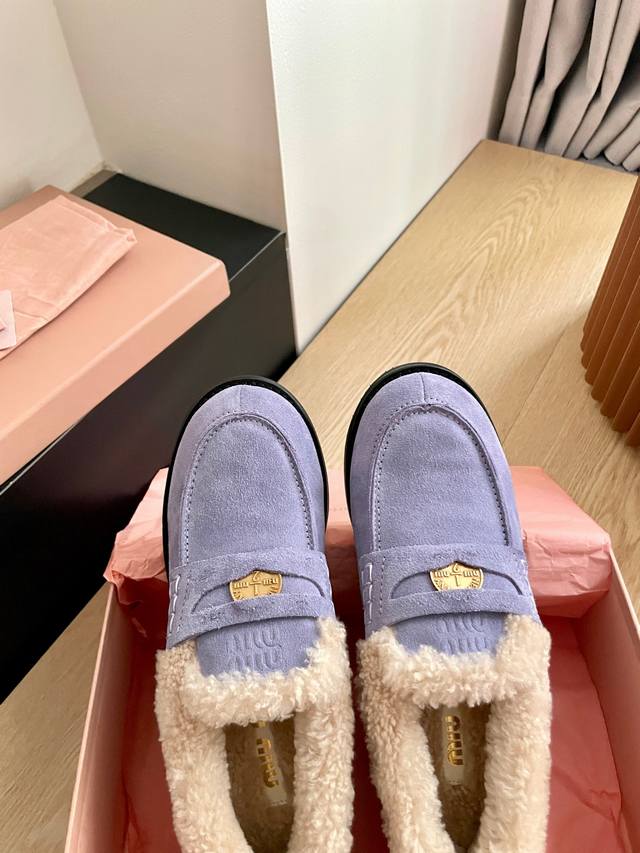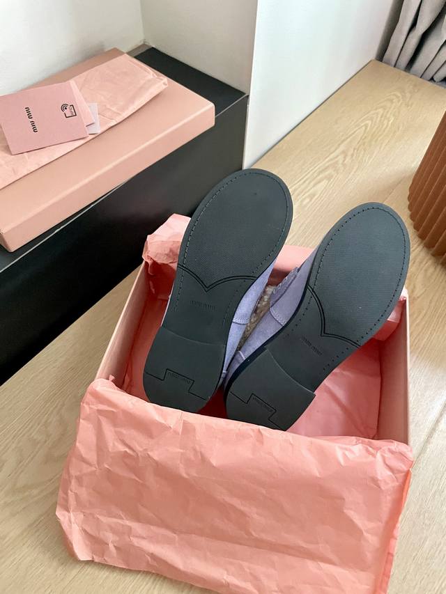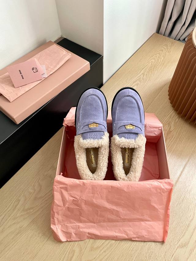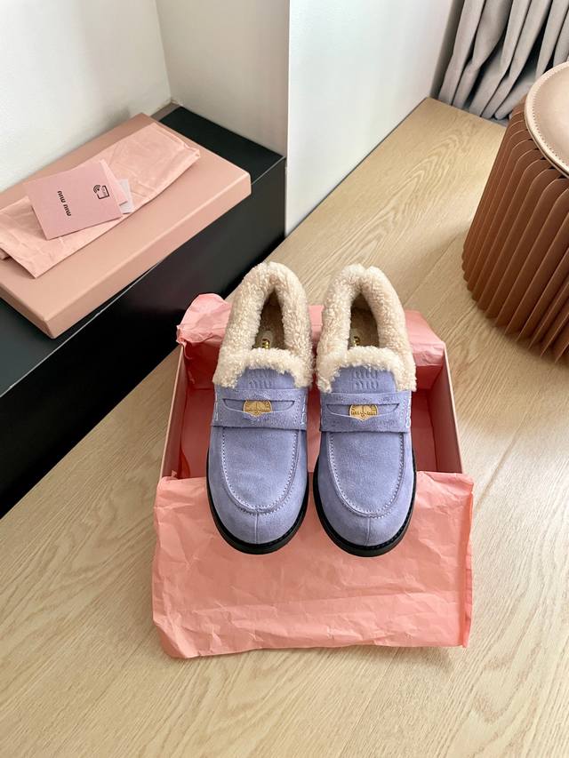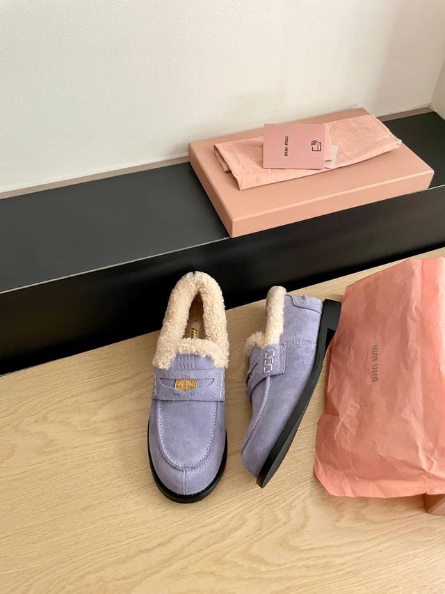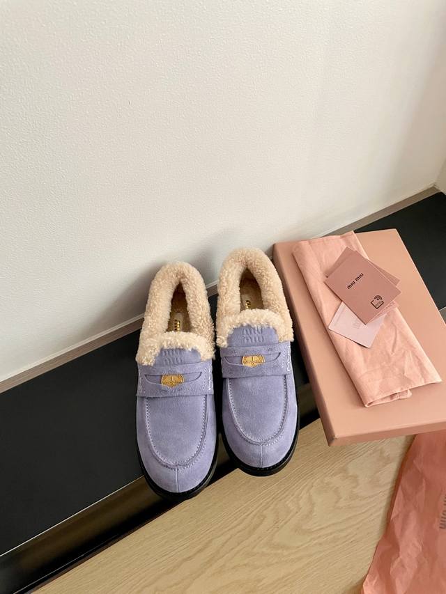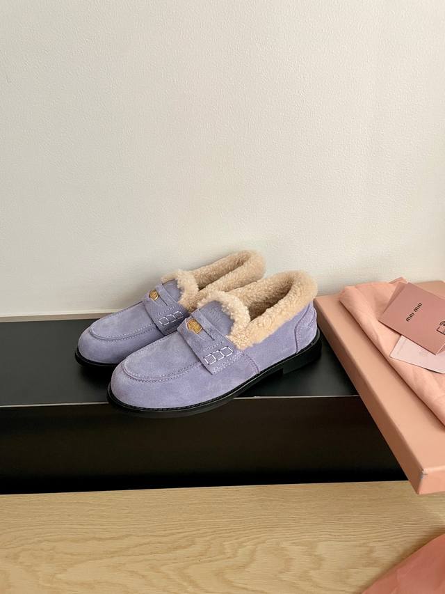 Miumiu's latest autumn/winter coin loafers, fluffy shoes recommended by many celebrities and fashion bloggers. They look so warm and cozy! The new 'little coin' design is absolutely irresistible. Besides the coin detail, the overall shoe shape is very elegant and not bulky. The toe shape is a cute upturned nose, and they look amazing on! Upper: High-gloss cowhide, genuine sheepskin lining, original mold, non-slip outsole. Sizes: 35-40 DDD