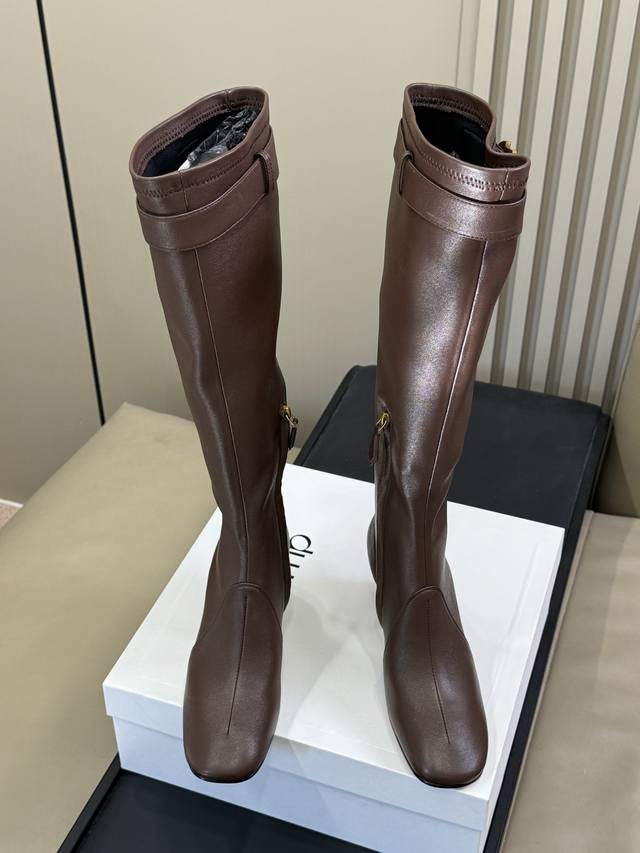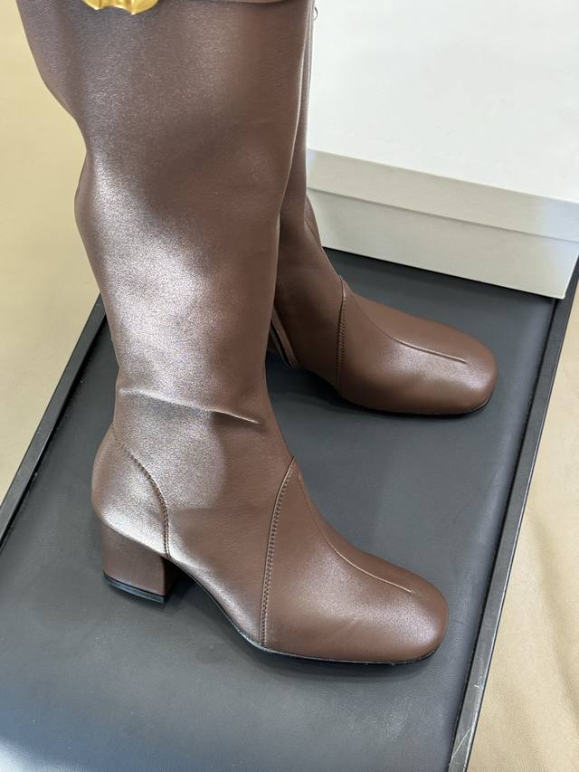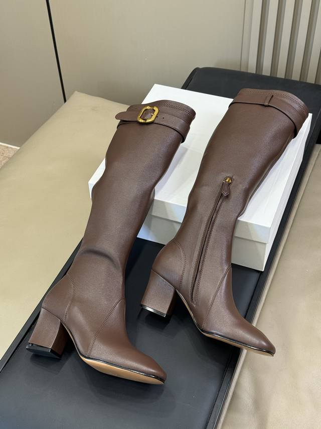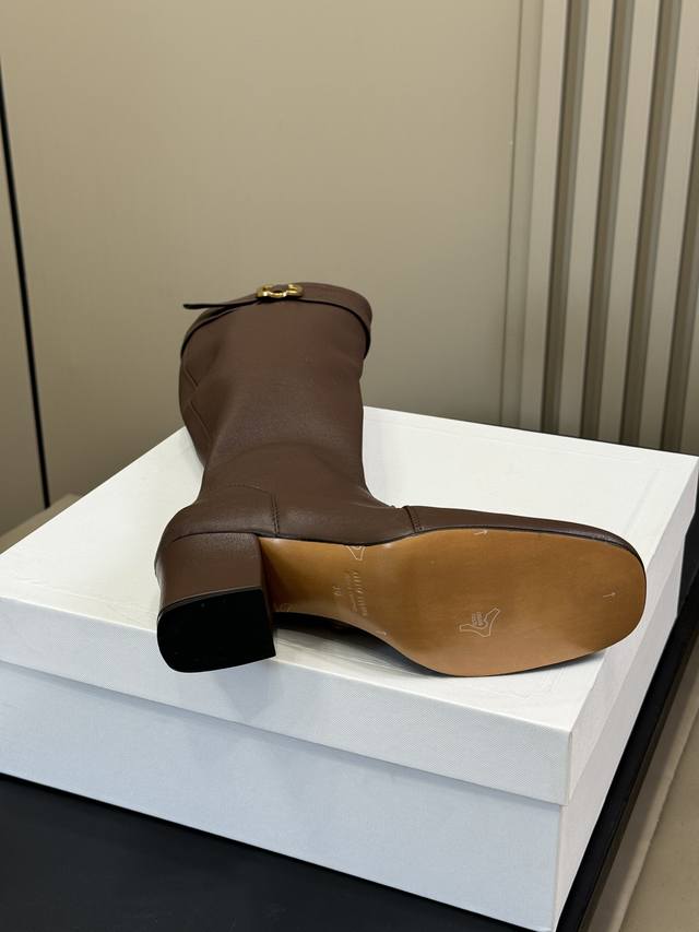 The boots are equipped with metal buckles embossed with the iconic logo, a theme that also appears on the armbands of the Spring/Summer 2025 series. The 65mm square high heel highlights the everyday femininity.