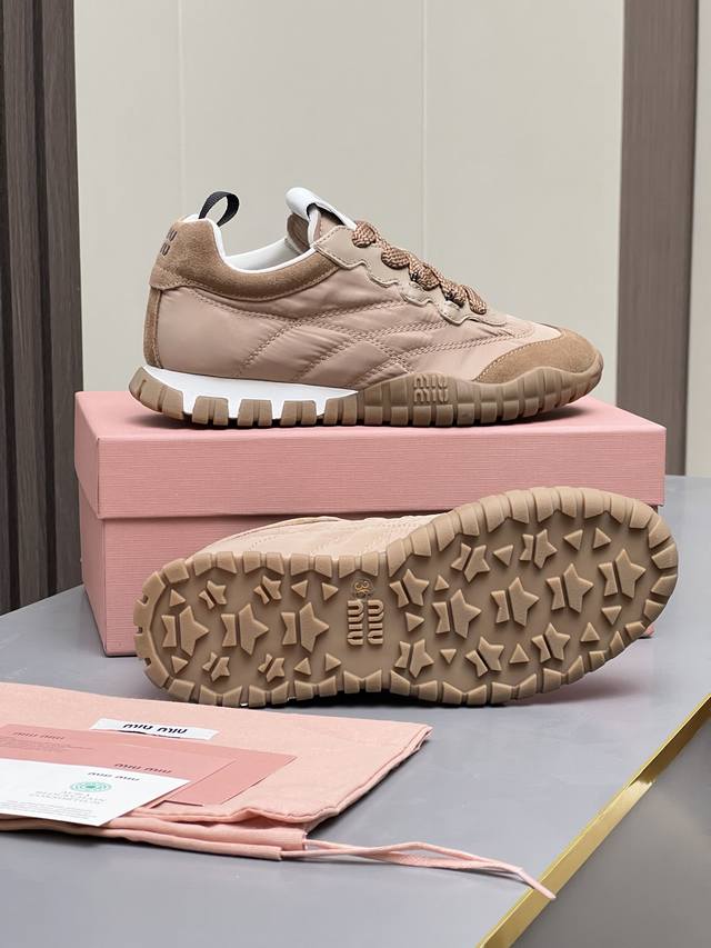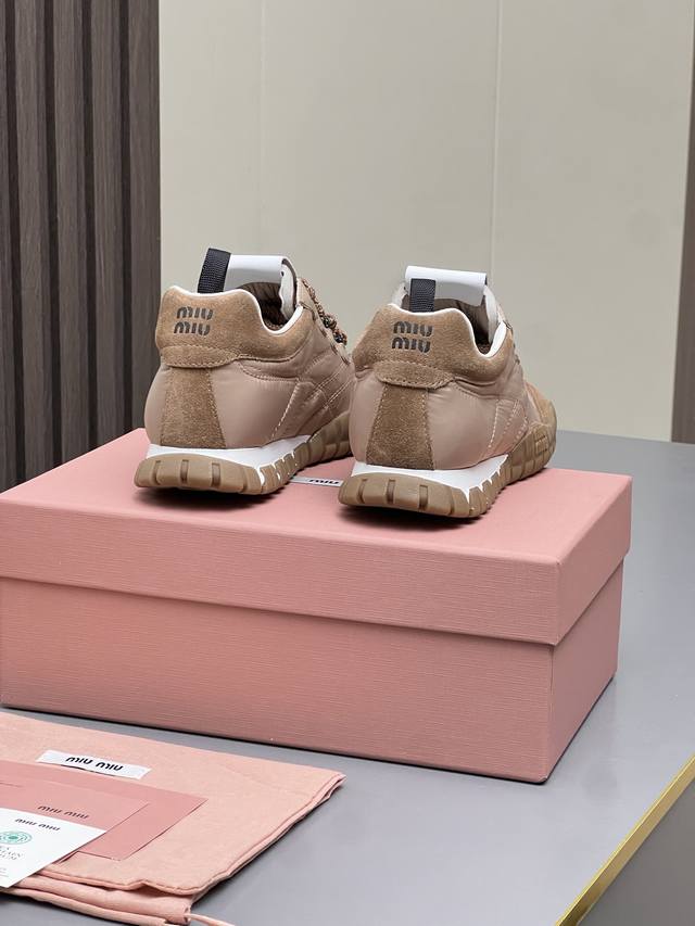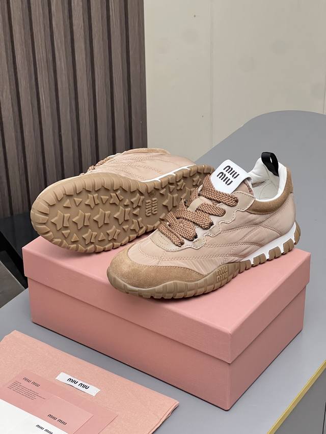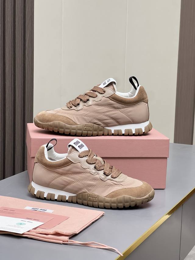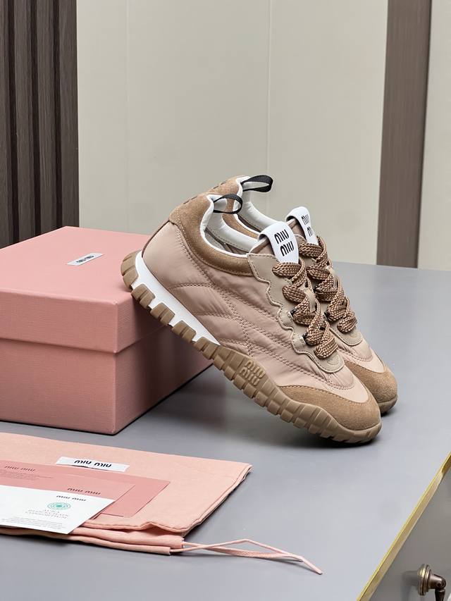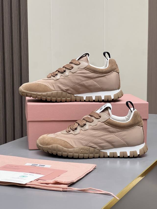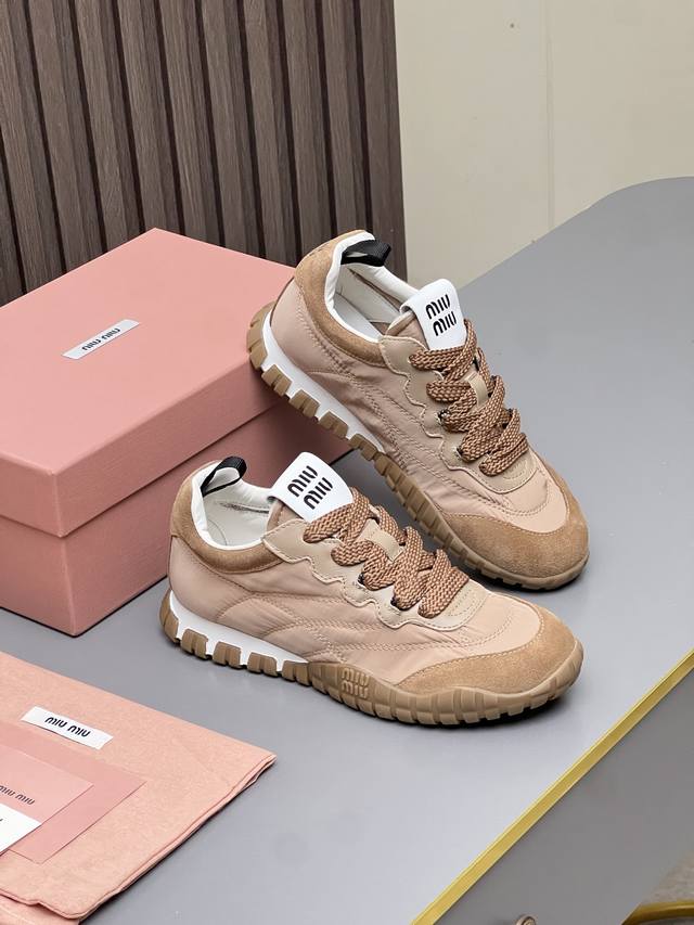 Mm Miu Miu 2025 Spring/Summer New German Training Shoes are here! Super comfortable, stylish, easy to wear, lightweight, and versatile. Simple yet sophisticated, these bold and avant-garde design shoes blend Miu Miu style with the minimalist lines of this chunky canvas sneaker. Unique logos adorn the tongue and back, adding a retro touch and signature element! Chunky sole design defines a modern and avant-garde style. Material: Original custom-made cow suede. Lining: Original custom-made cowhide lining. Outsole: Original molded non-slip rubber outsole. Sizes: 35-40. Colors: Off-white, black, gray, yellow, military green.