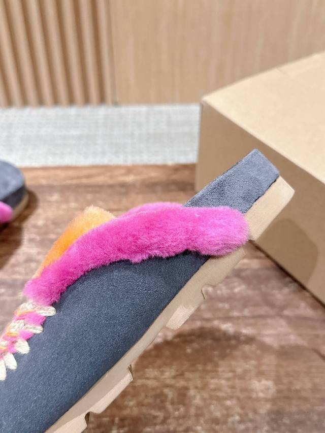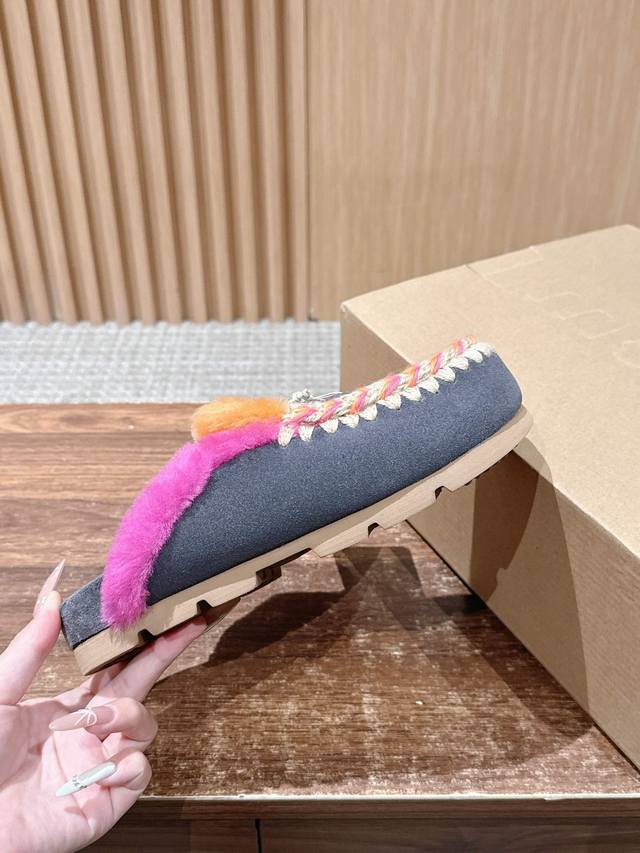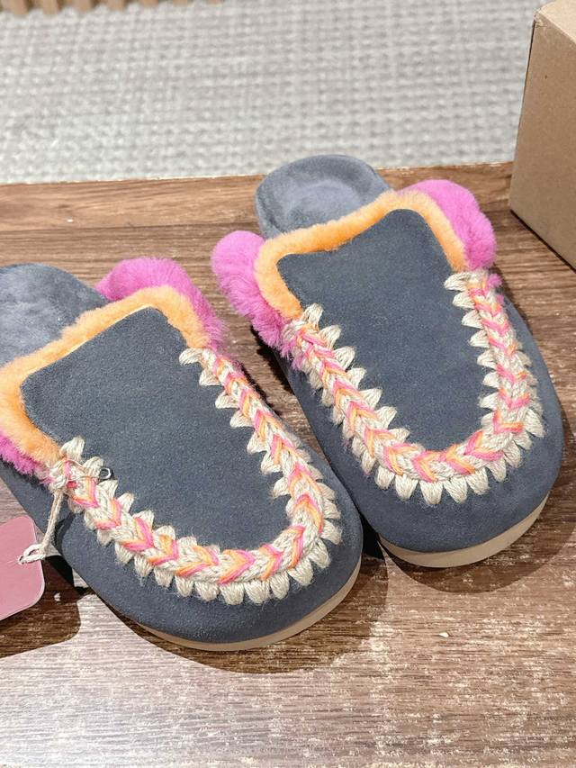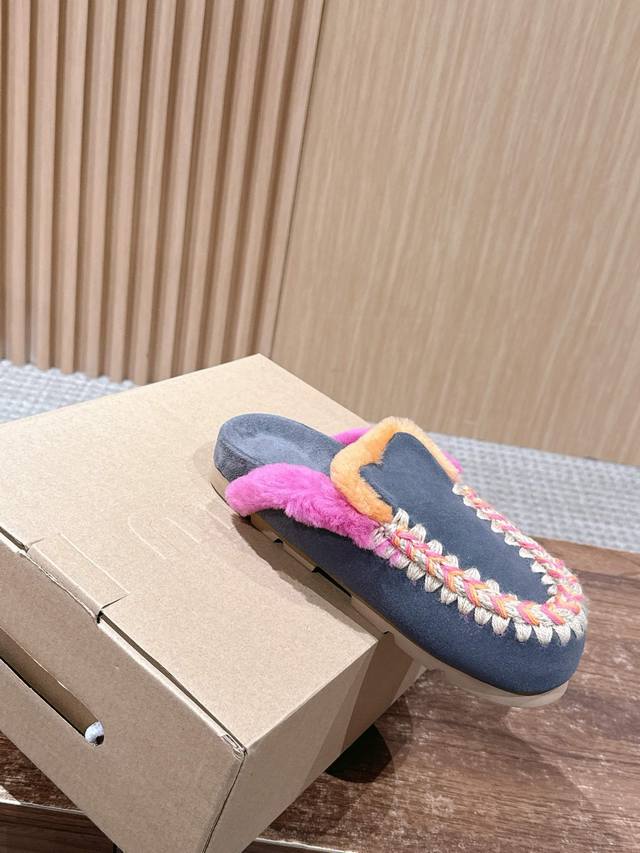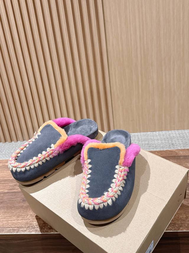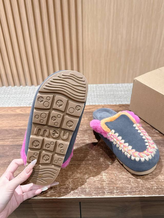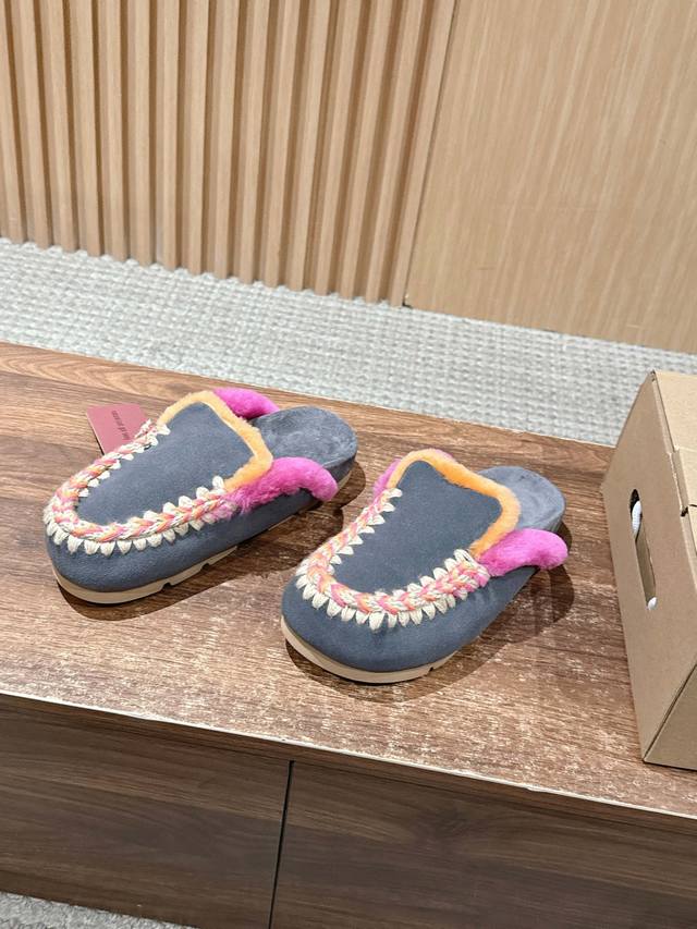 Mou Niche Trendy Brand Autumn/Winter New Arrival: Boken Wool Slippers. Comfortable and sophisticated for home wear. A pair of elastic, thick-soled wool slippers that are both cozy and warm. Your feet will feel like they're sinking into a gentle embrace. The soft sheepskin and leather combination makes them perfect for both outings and lounging at home. Add a touch of romantic charm to winter. Upper: Suede upper with heavy-duty ethnic-style hand-quilted trim . Insole: Wool. Sole: Original soft rubber outsole. Size: 35-39. 40.41 Made to order, no returns or exchanges.