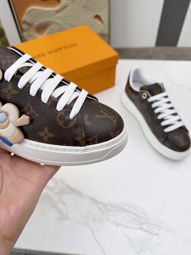 New Arrival DDD This attractive winter-themed Time Out sneaker features Monogram canvas printed with the brand's Vivienne and Gaston mascots, along with various winter-themed graphics. The laces are adorned with leather tags featuring Vivienne paired with a ski. This iconic style features a lightweight rubber outsole decorated with Monogram Flowers. DDD Sizes: 35-41, 34 and 42 available for custom orders DDD