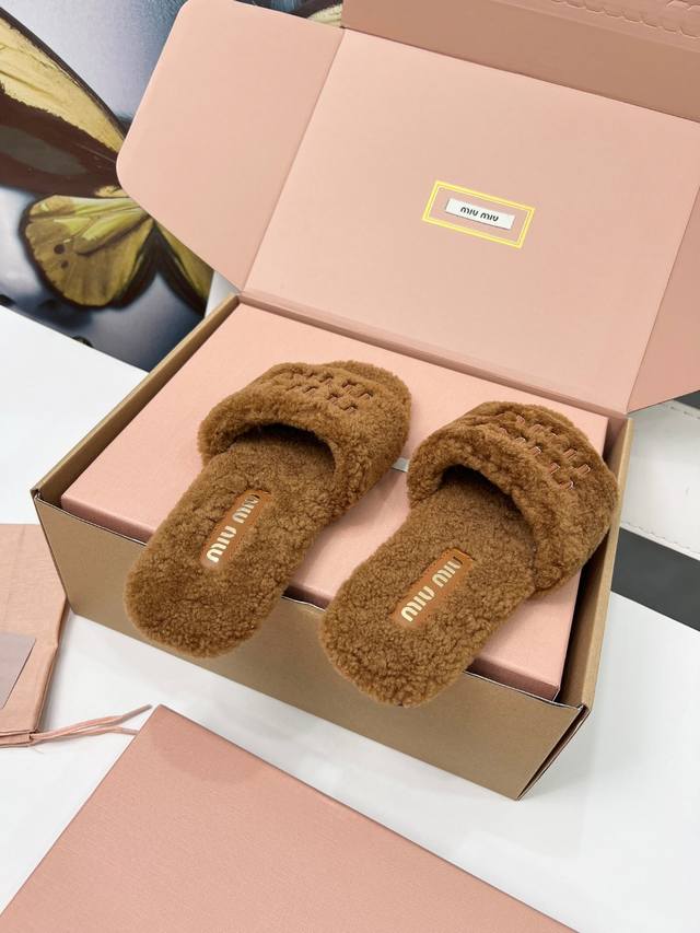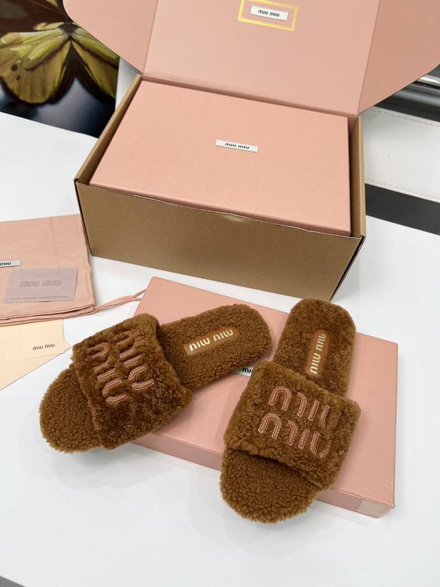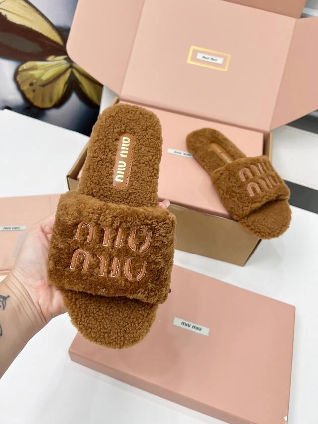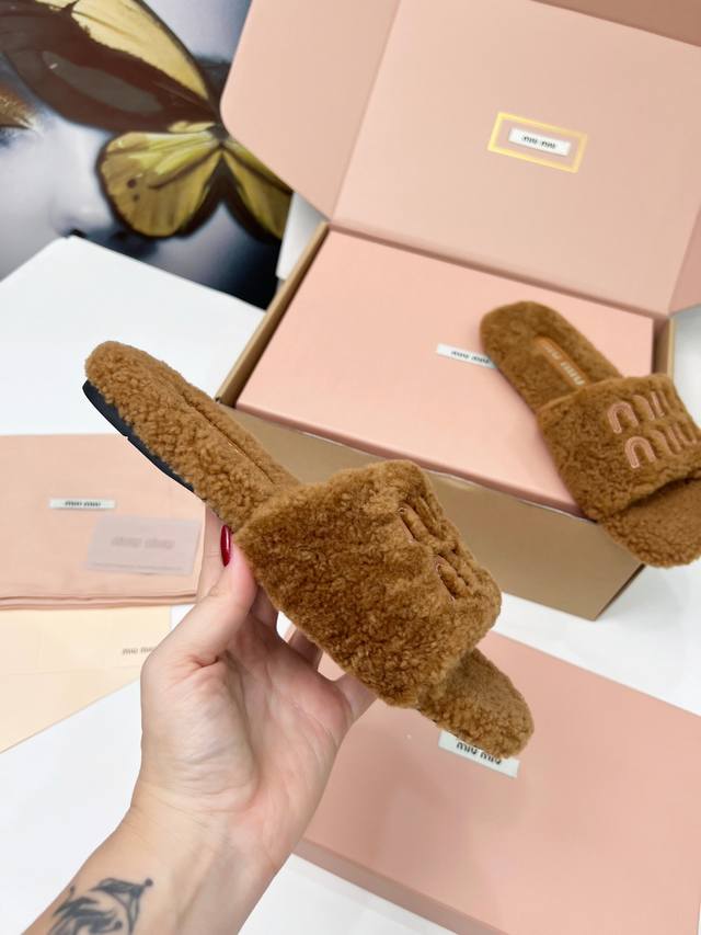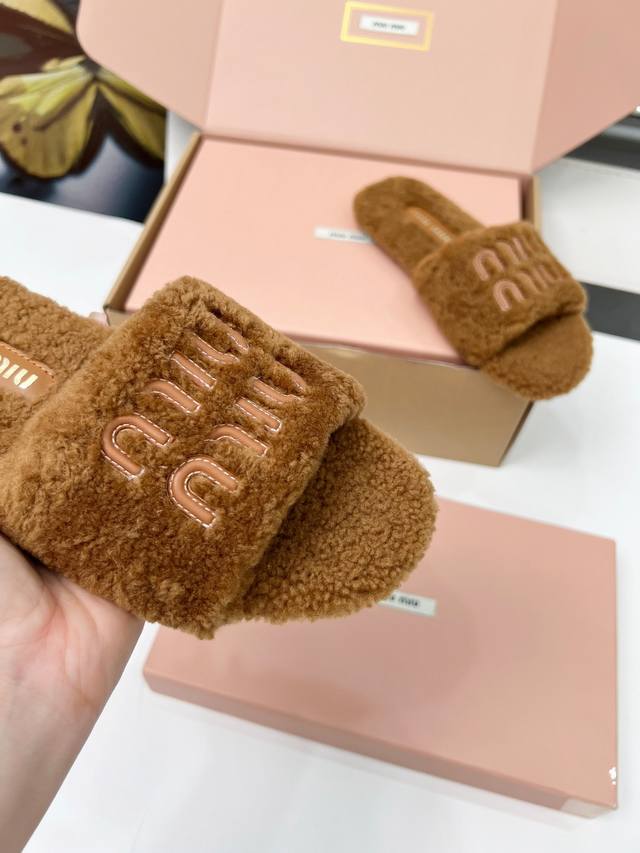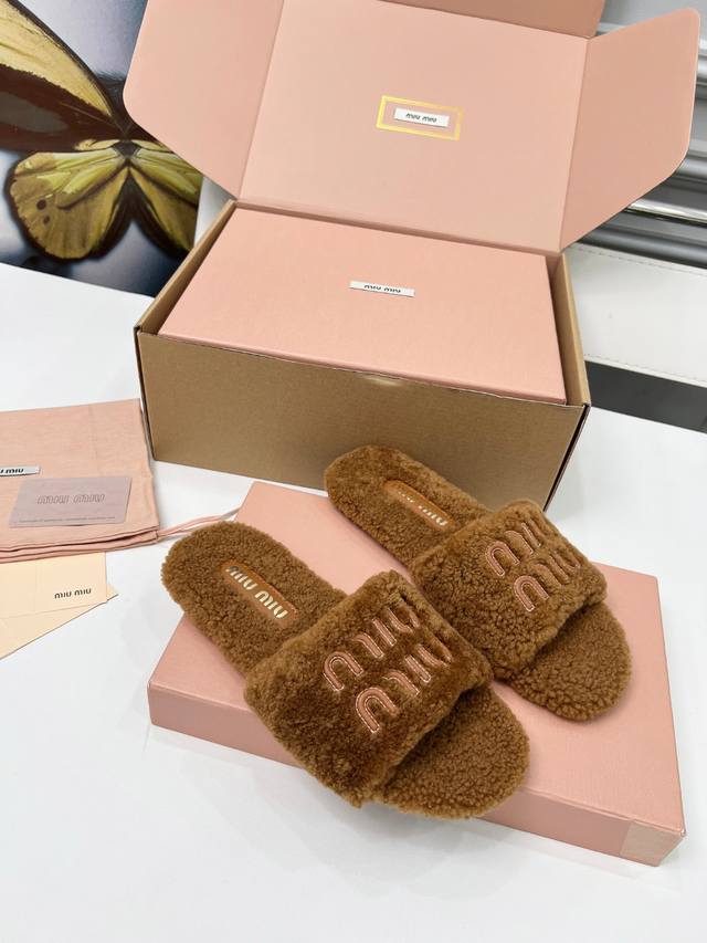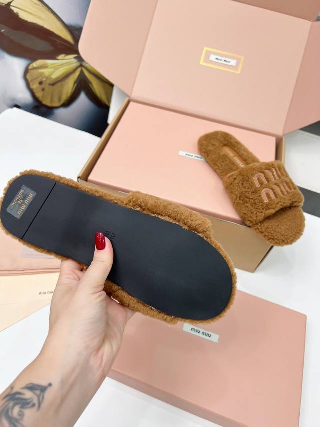 New Miu Miu wool slippers, crafted from top-quality pure lambskin! Super warm and cozy, wearing them feels like walking on clouds. Classic laser-embroidered leather lettering adds a touch of sophistication and luxury! This elevates the value of these slippers! The sole is an original molded non-slip rubber outsole, making them very comfortable and slip-resistant. The thick sole also provides excellent comfort! Sizes: 35-41, 40, 41. Custom orders are non-refundable. Packaging: Original packaging. Factory price: [Price not specified]