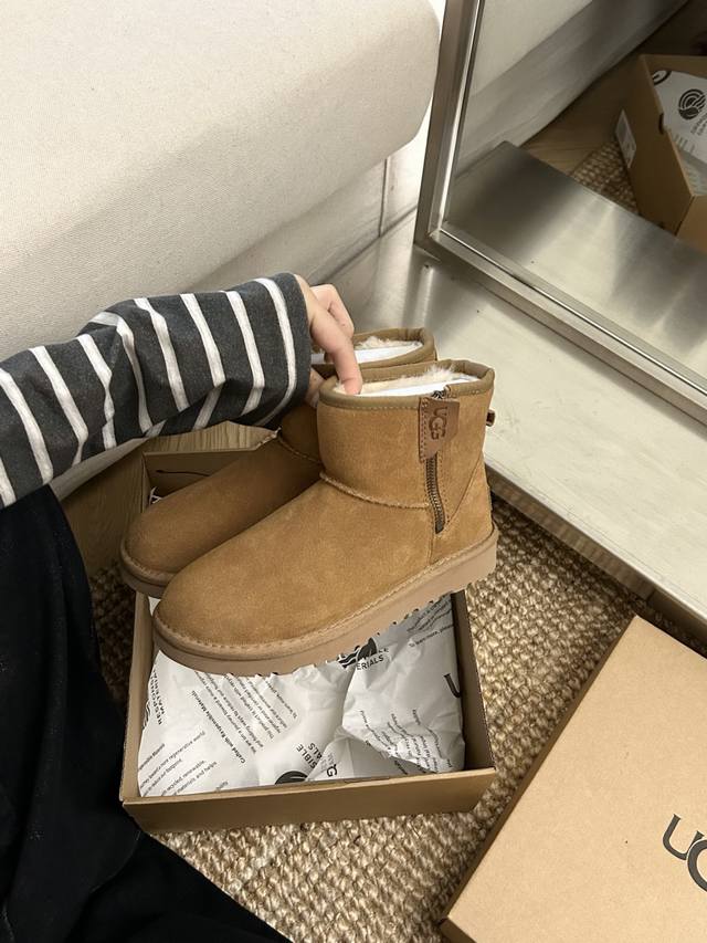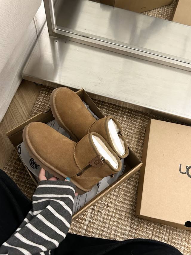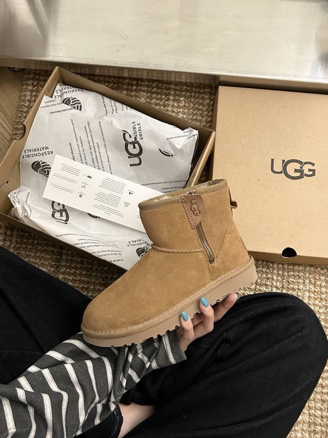 New Ugg classic slip-on shoe with zipper, style 54. Made of cowhide and wool, the adjustable zipper makes these slip-on shoes a must-have! Available in: Walnut, Chestnut, and Black. Sizes: 35-40.
