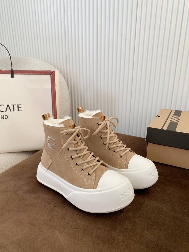 New Ugg design is here! A rare round-toe design, perfect for a vibrant winter look. The G letter rhinestones on the outer side of the upper add a touch of elegance. High-top for warmth and solid construction! Upper: Calfskin + Wool Lining! Colors: Black, Chestnut, Khaki, Antelope Brown. Sizes: 35-40. High-quality shipping.