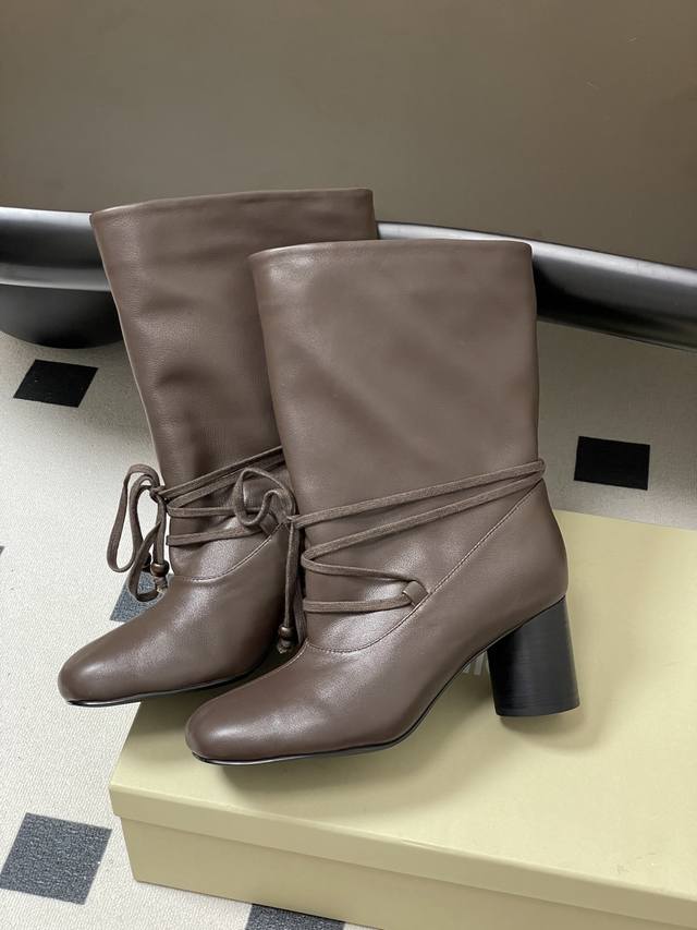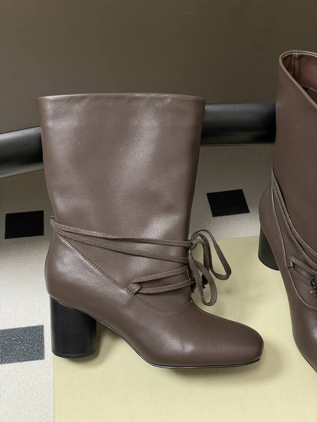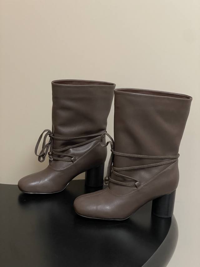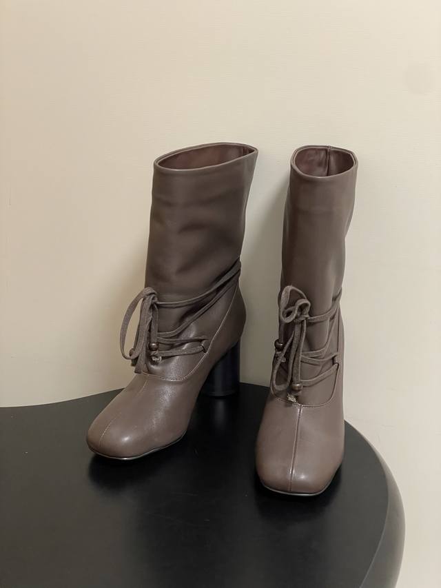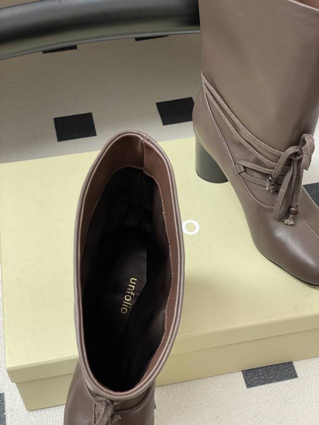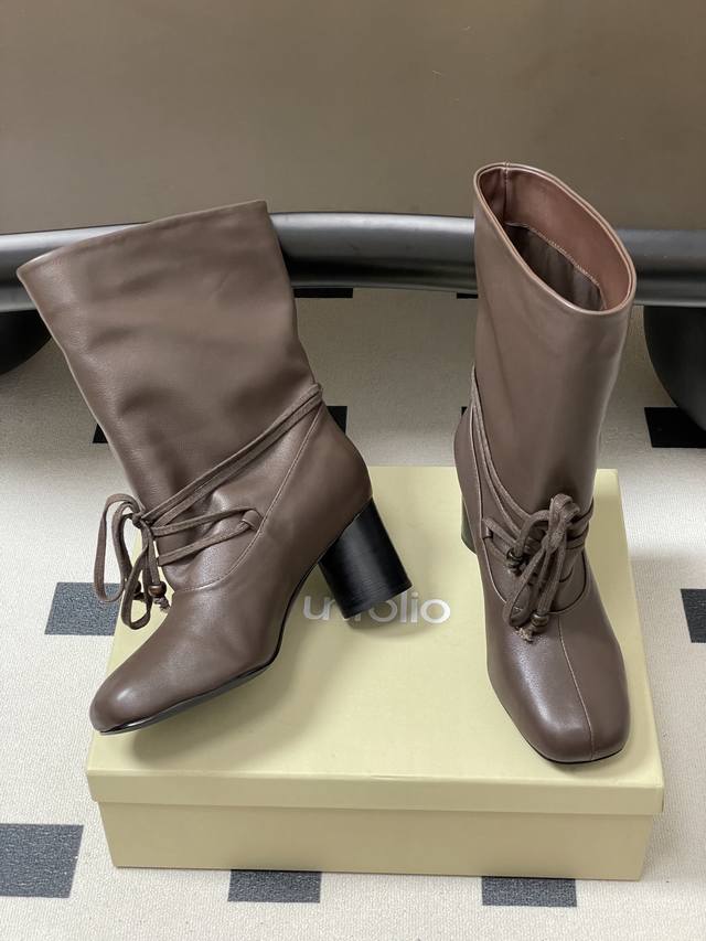 Niche brand Unfolio 25Aw Autumn/Winter New Style Strappy Chunky Heel Ankle Boots, Wide-Cut Slip-On Straight Boots, Short Boots, Slouch Boots DDD Elliot. The upper of these lace-up chunky heel ankle boots is made of ultra-soft cowhide, with a delicate texture and excellent elasticity, conforming naturally to foot movements. The lining is made of elastic Lycra plant fiber, possessing excellent elasticity, conforming to the foot's curves, and being skin-friendly and non-irritating, ensuring comfort for extended wear. The insole is made of sheepskin, providing soft support and reducing walking pressure; the 7cm golden heel height ensures a balance between aesthetics and comfort. The sole is made of rubber with a textured design to enhance grip, adapt to everyday ground conditions, and improve walking stability. DDD The square-rounded toe outlines clean lines, exuding a calm and sophisticated atmosphere. The wide last enhances foot shape accommodatingness, adapting to various foot shapes without restriction. The proportionate cut of the toe and boot shaft creates a clean visual effect and enhances walking stability, combining style and practicality. DDD 7cm cylindrical high heels strike the perfect height, ensuring stable and effortless walking. The heel is covered in fine leather, its texture revealing a handcrafted feel. The smooth lines combine aesthetics and comfort, with every detail showcasing high-quality craftsmanship. The boot shaft can be freely folded, easily switching between two wearing styles. Folded up, it reveals a unique leather lining; unfolded, it presents a sleek boot look. Different forms convey diverse atmospheres, adapting to various styling occasions and meeting individual dressing needs. DDD Upper: Cowhide DDD Lining/Insole: Fabric/Sheepskin DDD Sole: Molded Rubber Outsole DDD Heel Height: 7cm DDD Sizes: 35-39 Sizes 40 and 41 are custom-made and non-refundable/non-exchangeable.