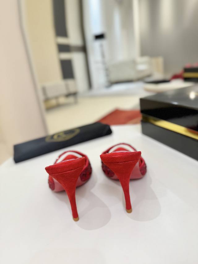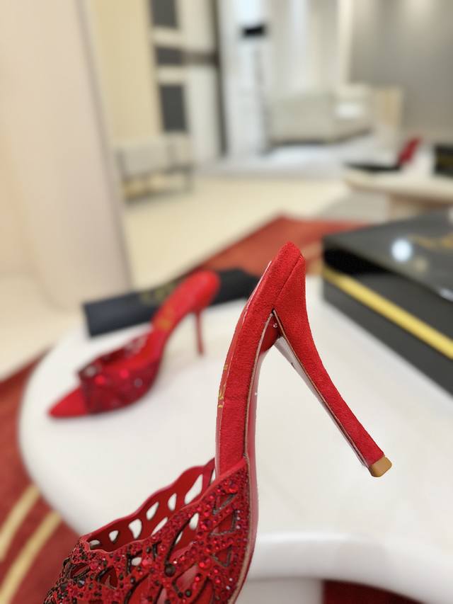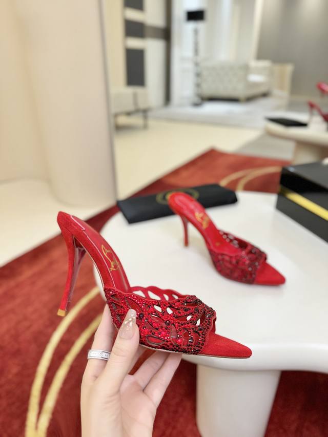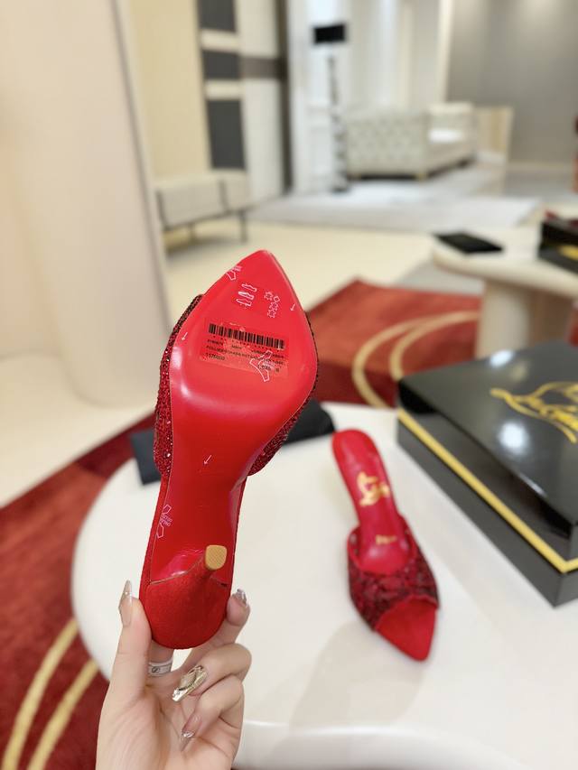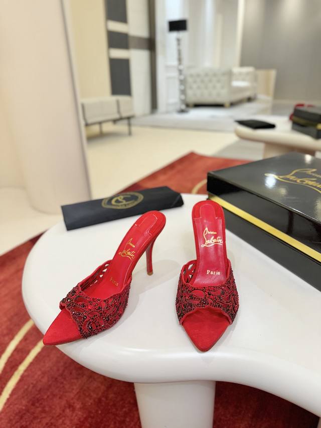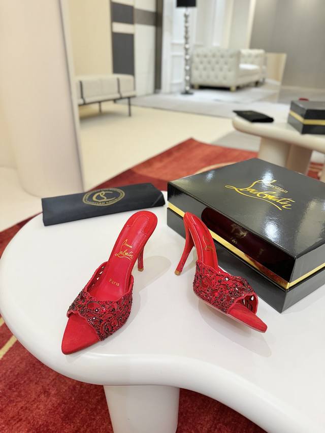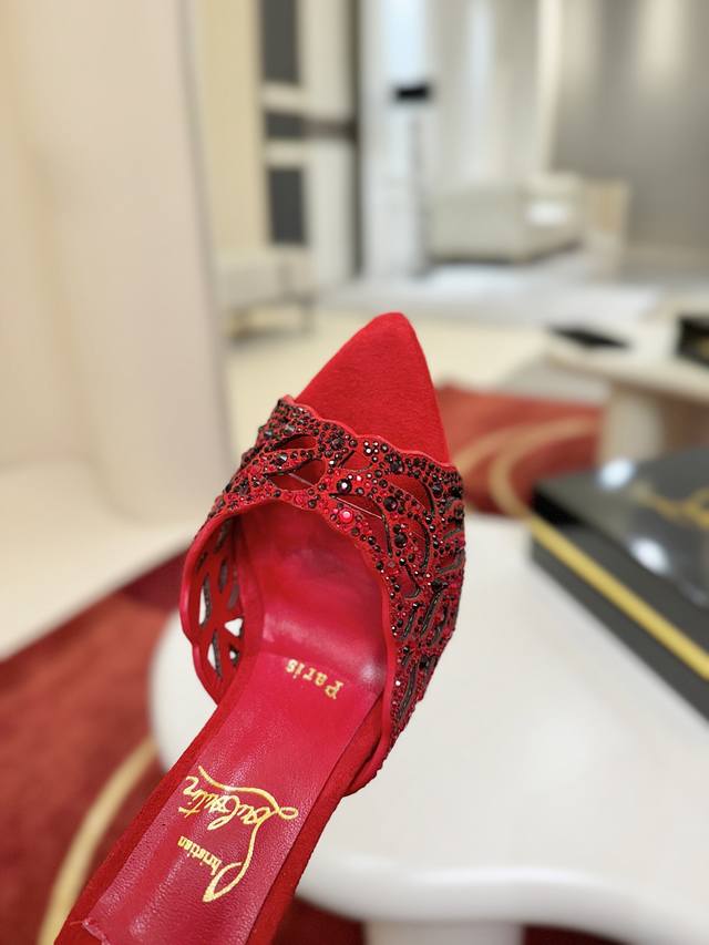 Openwork Diamond-Studded Slippers W. DDD This Maison Christian Louboutin shoe features a 100mm heel, crafted from Fever Red Lambskin, and comes with a padded insole. Catching the light with every step, this shoe is adorned with countless 1,700 sparkling red gemstones of varying sizes, some hand-placed to create a beautifully subtle fading effect. The handcrafted open design showcases the elegance of the foot. DDD Size: 35-43 DDD 40, 41, 42. Custom orders are non-refundable and non-exchangeable, size 43 is 10 DDD Heel height: 10cm 8.5cm (custom orders possible DDD Color: Red and Black DDD