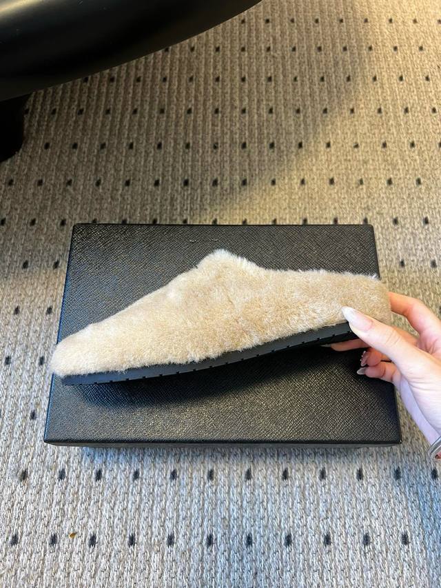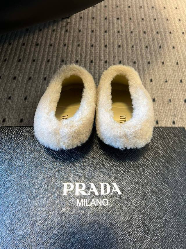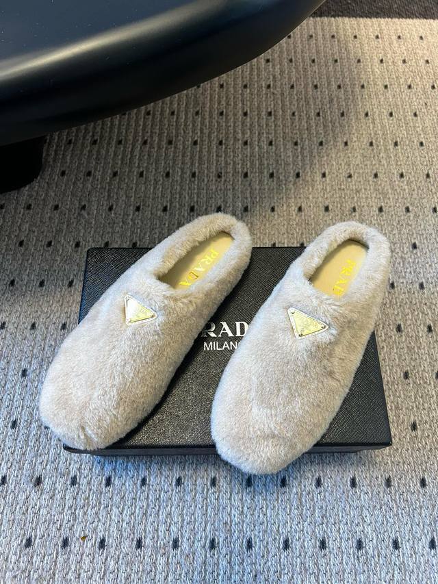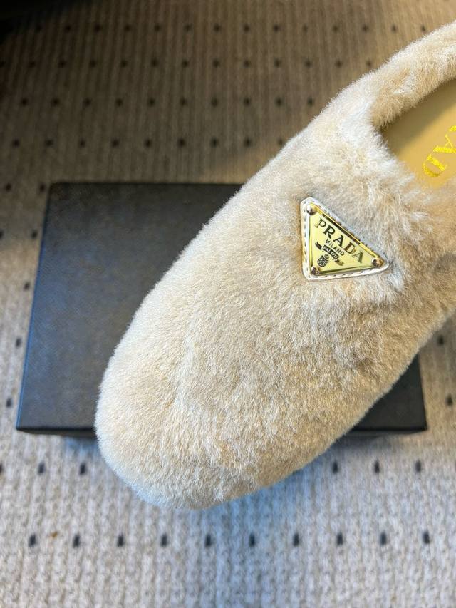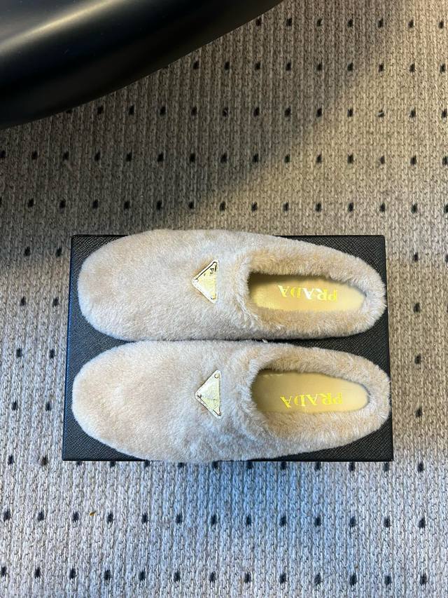 prad* 25Ss Triangle Label Plush Mules DDD Made of plush material, soft and comfortable to the touch, providing a warm wearing experience for the feet, suitable for autumn and winter. Available in a variety of colors including beige, white, black, dark purple, and brown to meet different style needs and adaptable to various occasions. DDD A mule style with a backless design, easy to put on and take off, combining fashion and practicality, it can be used as an everyday casual shoe or add a fashionable element to your look. DDD Material: Wool Ddd Lining: Sheepskin Ddd Outsole: TPU outsole Ddd Heel height: 2cm Ddd Size: 35-41, 40-41 sizes are custom-made and non-refundable DDD