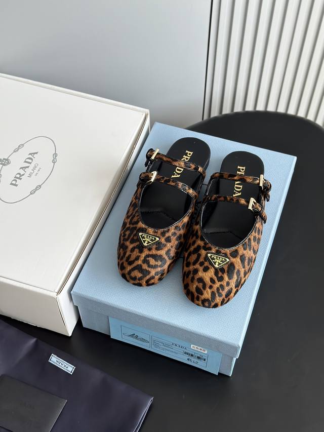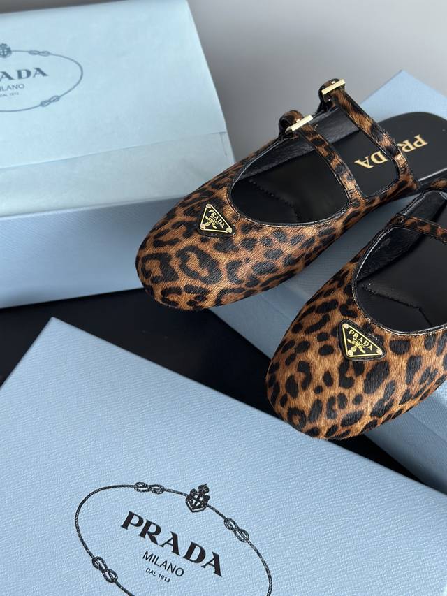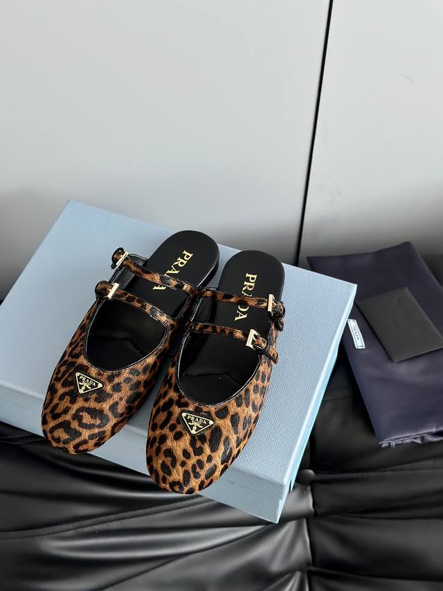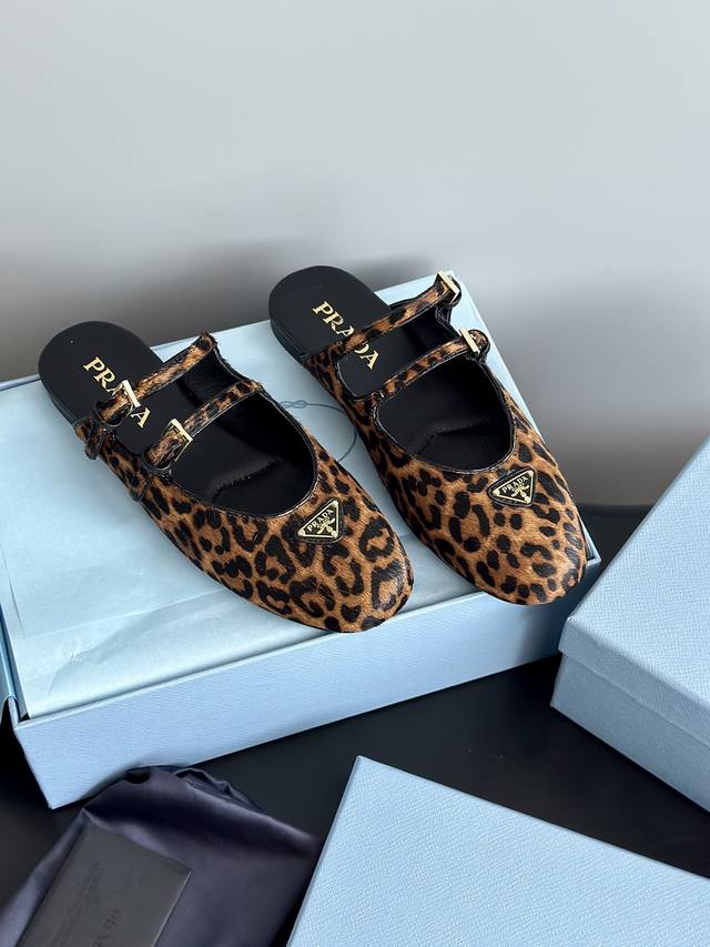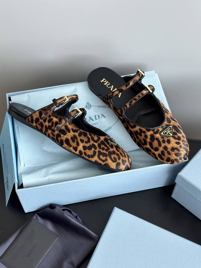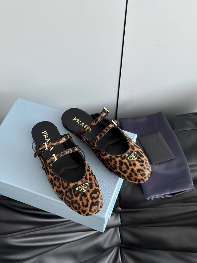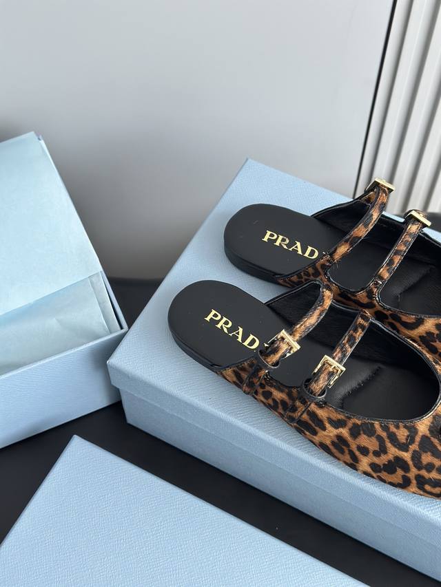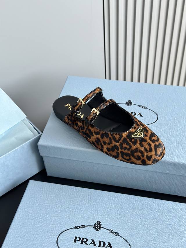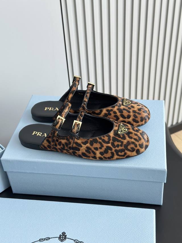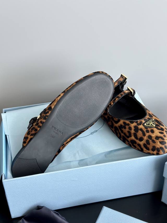 prad*25 New Mary Jane Ballet Flat Mules, High-Quality Item (Retail Purchase) These ballet flats feature a tapered silhouette, with patent sheepskin leather adding a touch of sophistication and showcasing elegant femininity. They feature a round toe, a rubber sole, and an enamel triangular metal logo, highlighting classic lines and refined details. The upper is adorned with straps and an engraved logo metal buckle. The 5mm one-piece sole features an enamel triangular metal logo and a heat-pressed logo. The upper is made of original wrinkled patent leather with horsehair and leopard print, the insole is made of sheepskin, and the outsole is made from original molded rubber. Sizes: 35, 41, 40, 41. Custom orders are non-refundable and non-exchangeable.