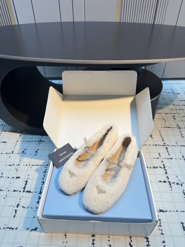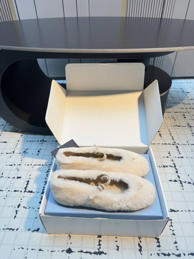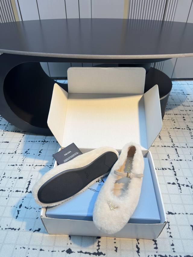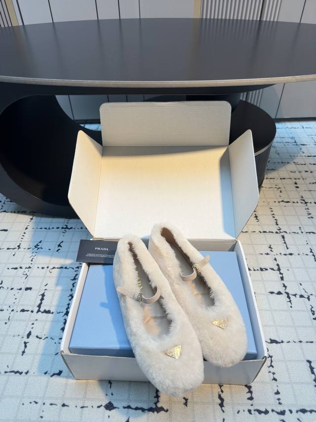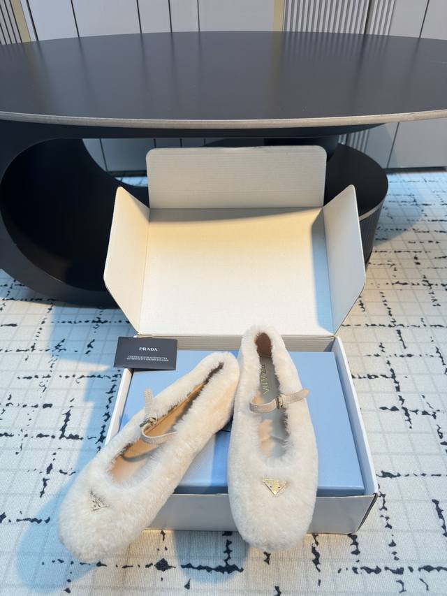 prad*25 New Mary Jane Furry Shoes, Top Version DDD These ballet flats feature a tapered silhouette, with patent sheepskin leather adding a touch of sophistication and showcasing elegant femininity. They feature a round toe, a rubber sole, and an enamel triangular metal logo, highlighting classic lines and refined details. The upper is adorned with straps and an engraved logo metal buckle, and the 5mm one-piece sole features a heat-pressed logo. DDD Sizes: 35, 41, 40, 41. Custom orders are non-refundable and non-exchangeable. DDD