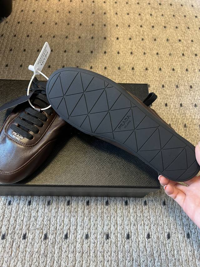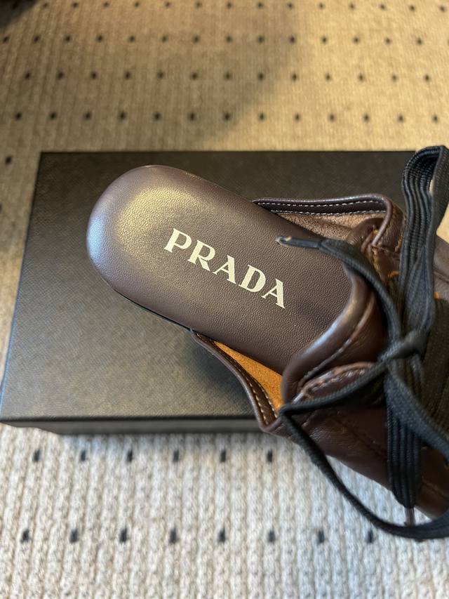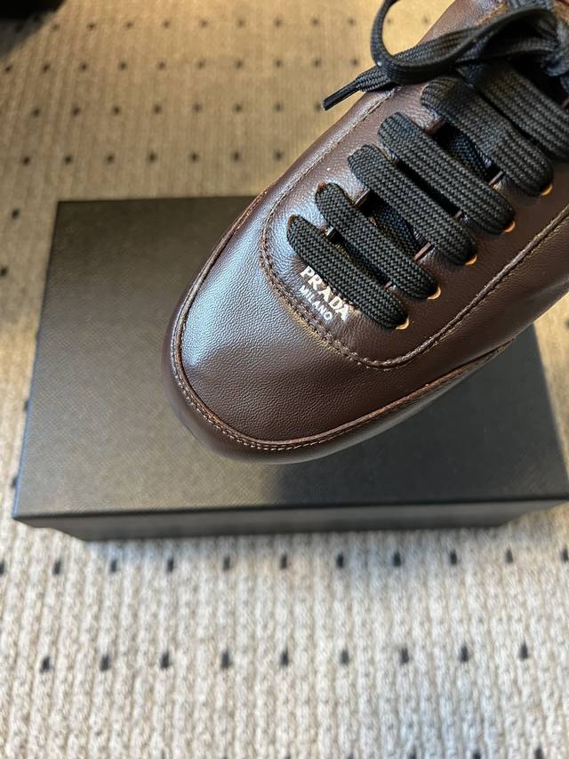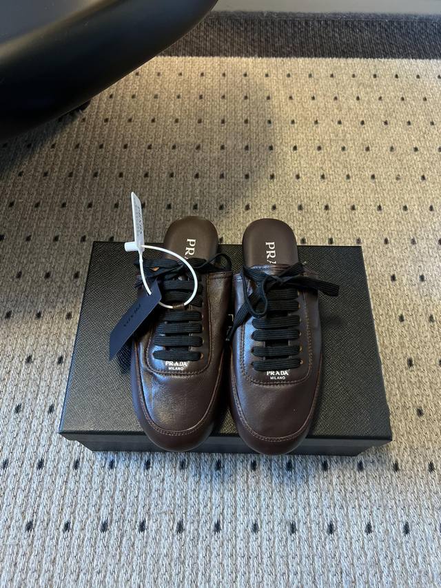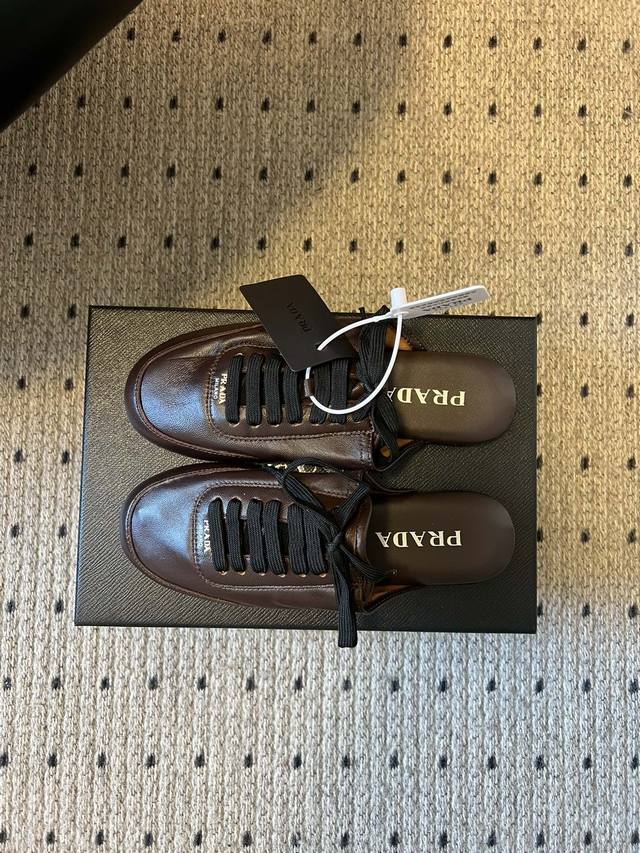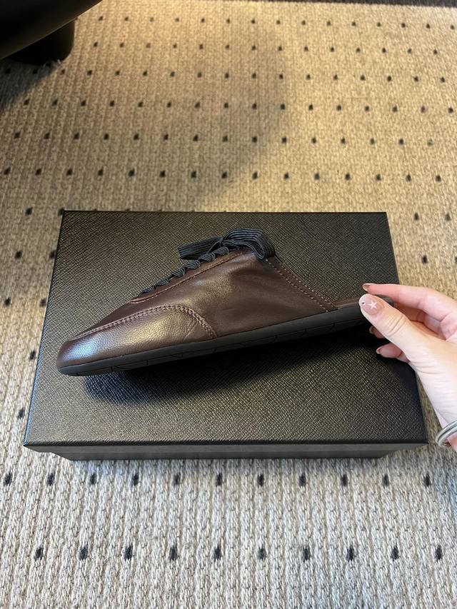 prad*25Ss Leather Thin-Soled Lace-Up Casual Shoes DDD This shoe combines the lacing elements of athletic shoes with the backless structure of mules, retaining the vitality of casual shoes while adding a relaxed and casual vibe due to the backless design. The lacing element echoes the details of retro items, while the backless design injects a modern and relaxed feel into the retro look, easily creating a unique and individual style. DDD Made of soft leather, it conforms to the shape of the foot and is comfortable against the skin; the black shoelaces contrast with the shoe body, enhancing the visual layering. The backless design weakens the "formal feeling" of wearing shoes, making it more relaxed when paired with casual items, suitable for casual occasions such as shopping or coffee dates. DDD Upper: Imported soft sheepskin DDD Lining: Sheepskin DDD Outsole: Original molded outsole DDD Sizes: 35 41 40 41 Custom-made, no returns or exchanges DDD