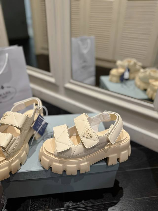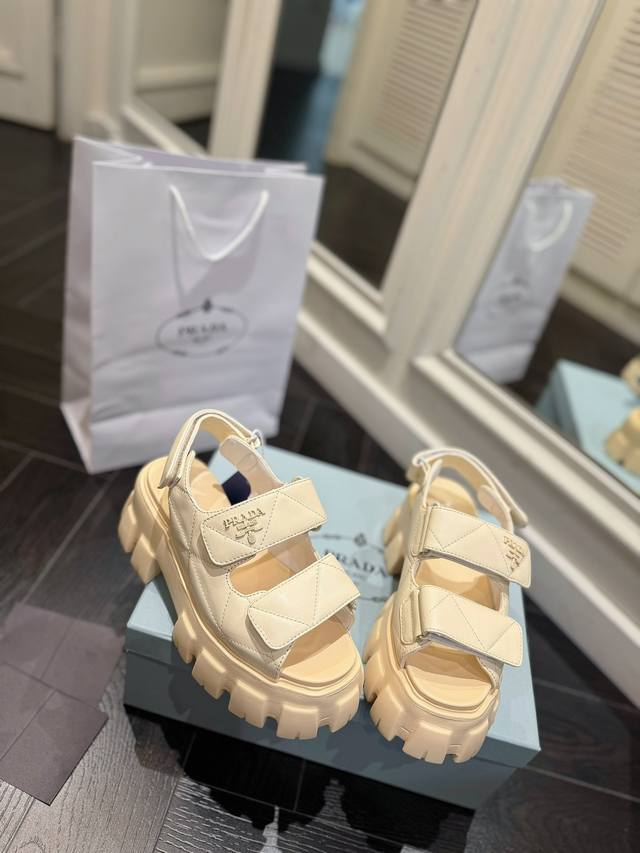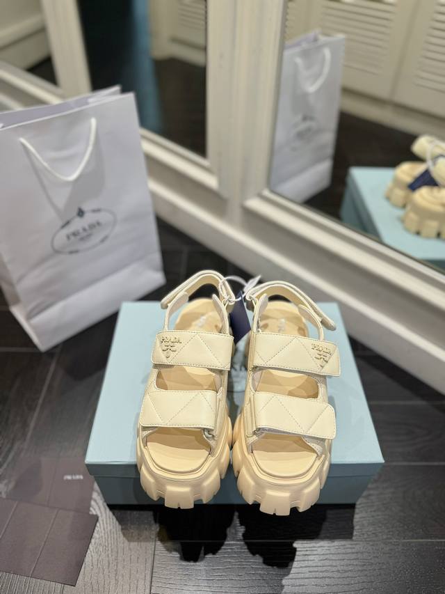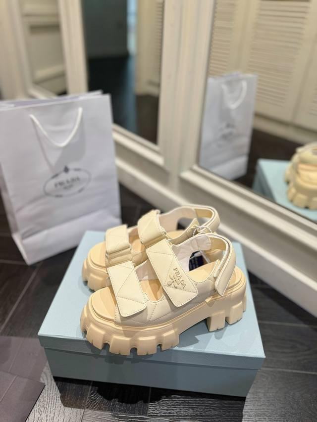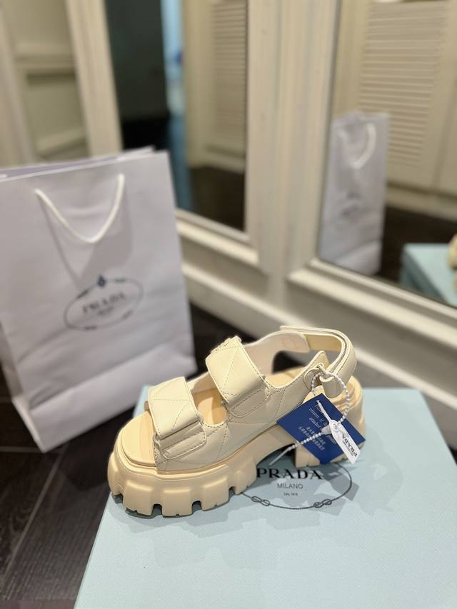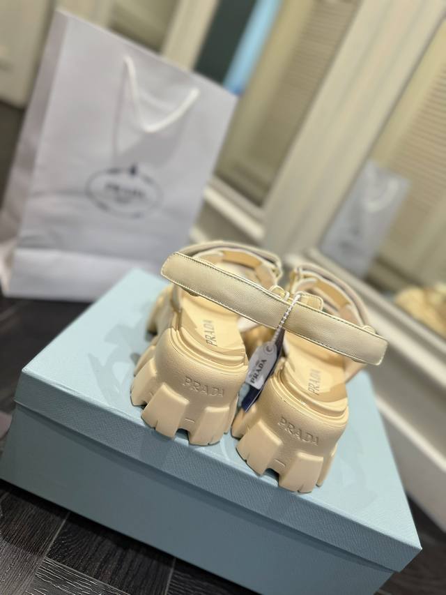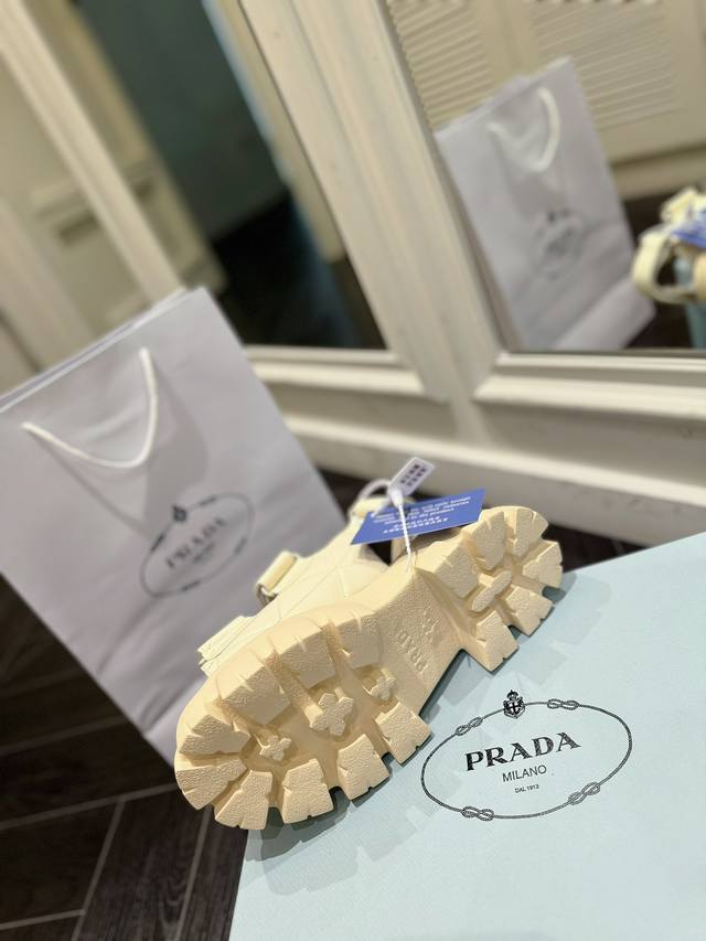 Prada sandals are named for their thick foam soles. Through their timeless, robust design aesthetic, they embody a unique blend of research, innovation, and style. Summer-inspired. A soft nappa leather upper and a uniform-inspired sole create a dialogue, skillfully blending modernity and elegance.