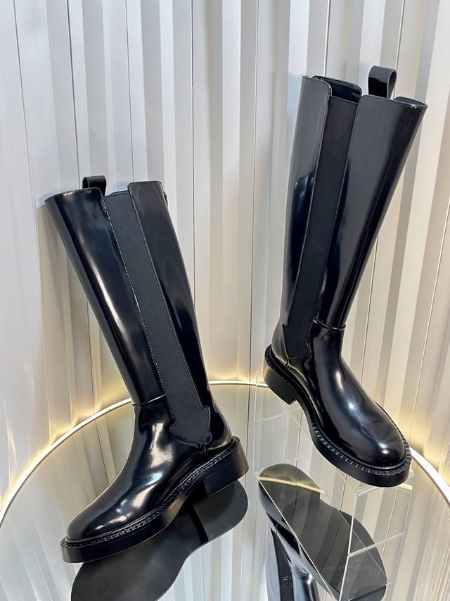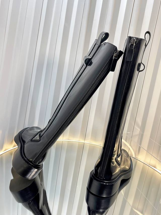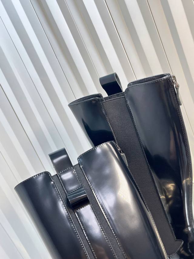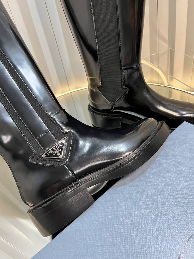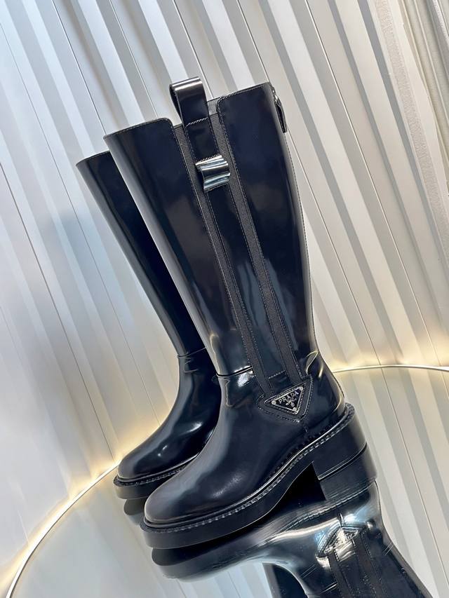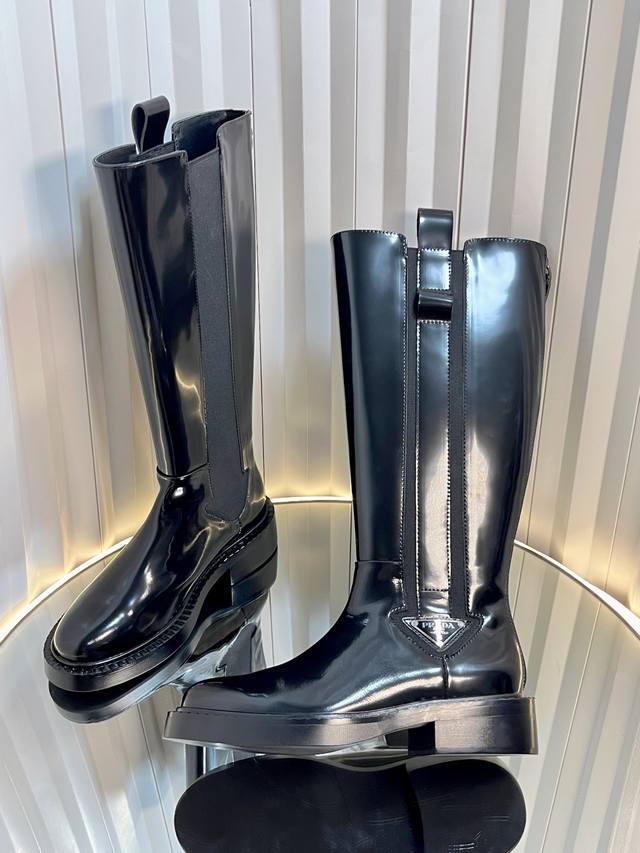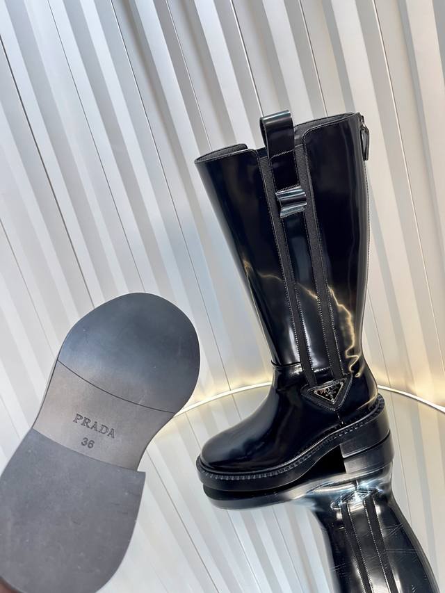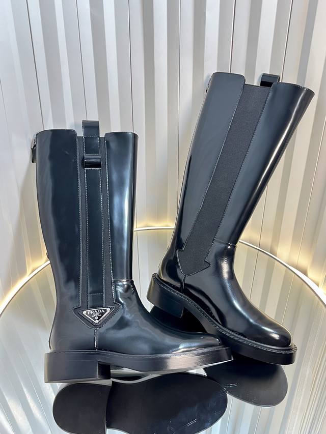 Prada's new 2025 cigarette boots, Martin boots. These Prada 2025 autumn/winter boots feature triangular side straps and small ears that really elevate your look. A practical and versatile piece, perfect for any autumn/winter look. The slit-beaded calfskin upper is incredibly textured. The slightly thick sole is incredibly stylish, lengthens your legs, is easy to put on and take off, and is especially flattering for your calves! Sizes: 35-39, 40, 41. Made to order, no returns or exchanges.