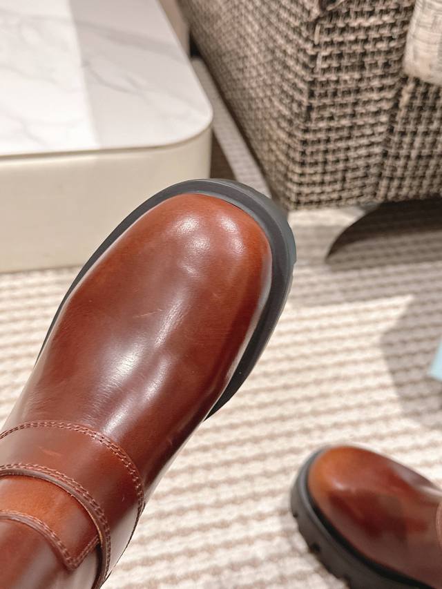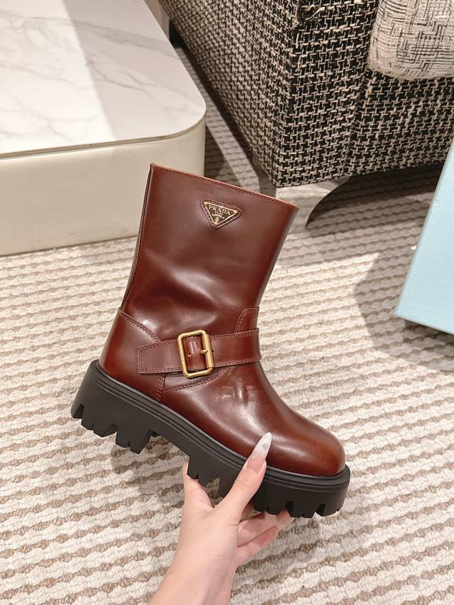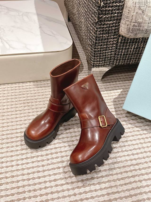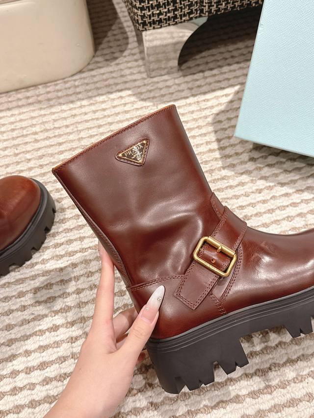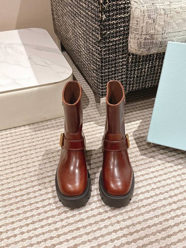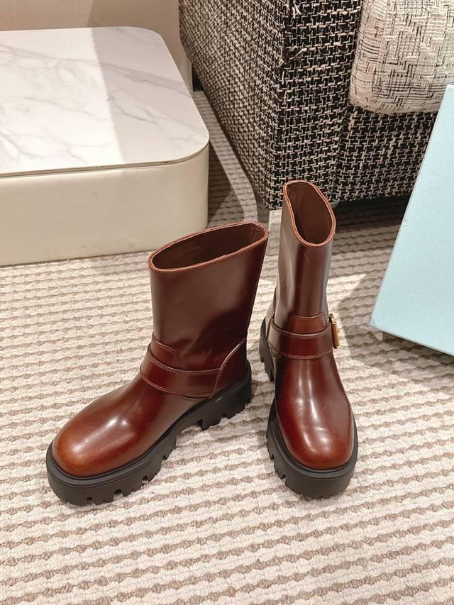 Exquisite lines and craftsmanship define these leather boots, adorned with the iconic triangle logo. A unique metal buckle adds a touch of personality to the moto style!