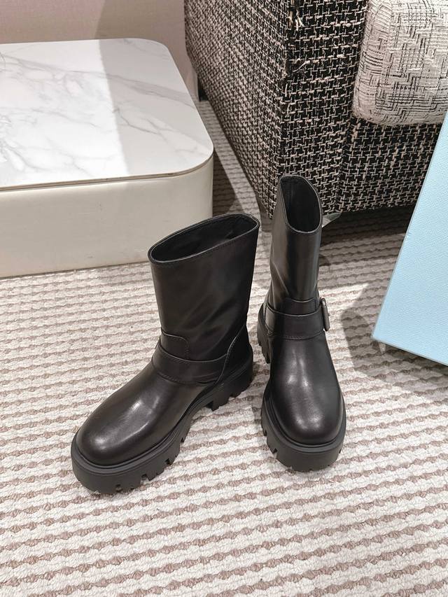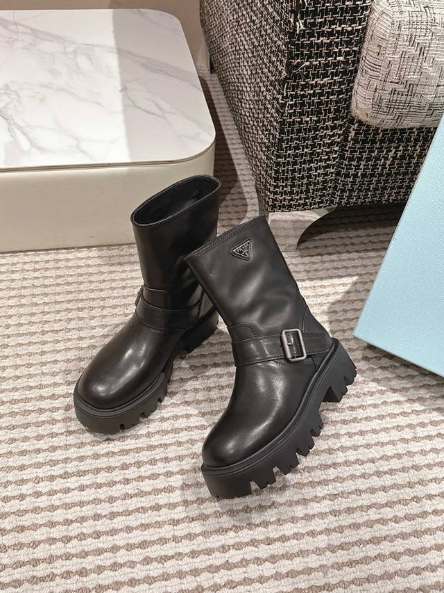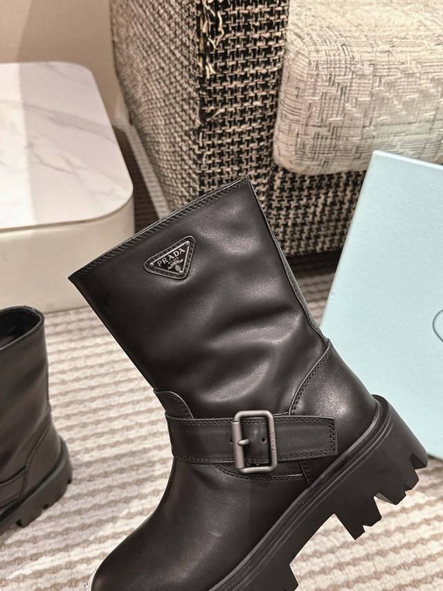 Exquisite lines and craftsmanship define these leather boots, adorned with the iconic triangle logo. A unique metal buckle adds a touch of personality to the moto style!