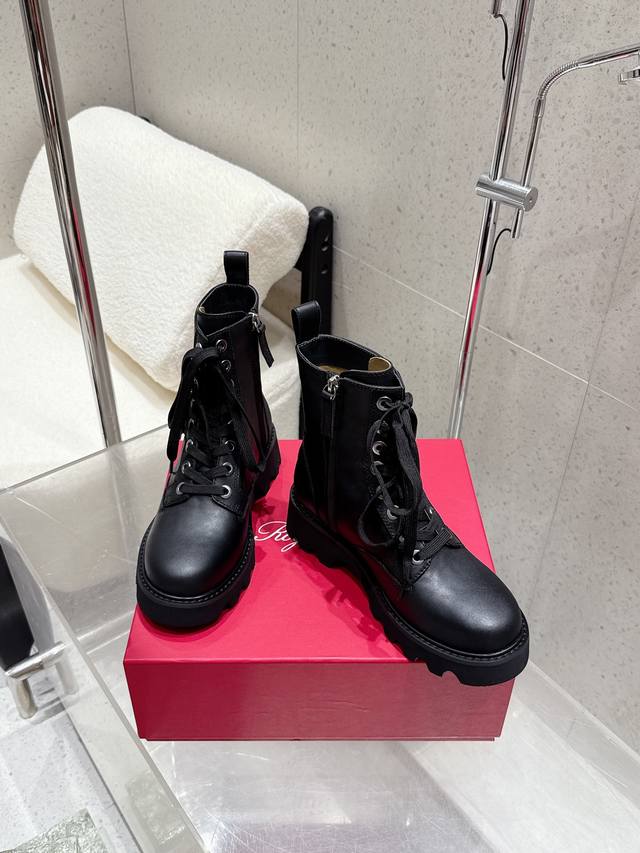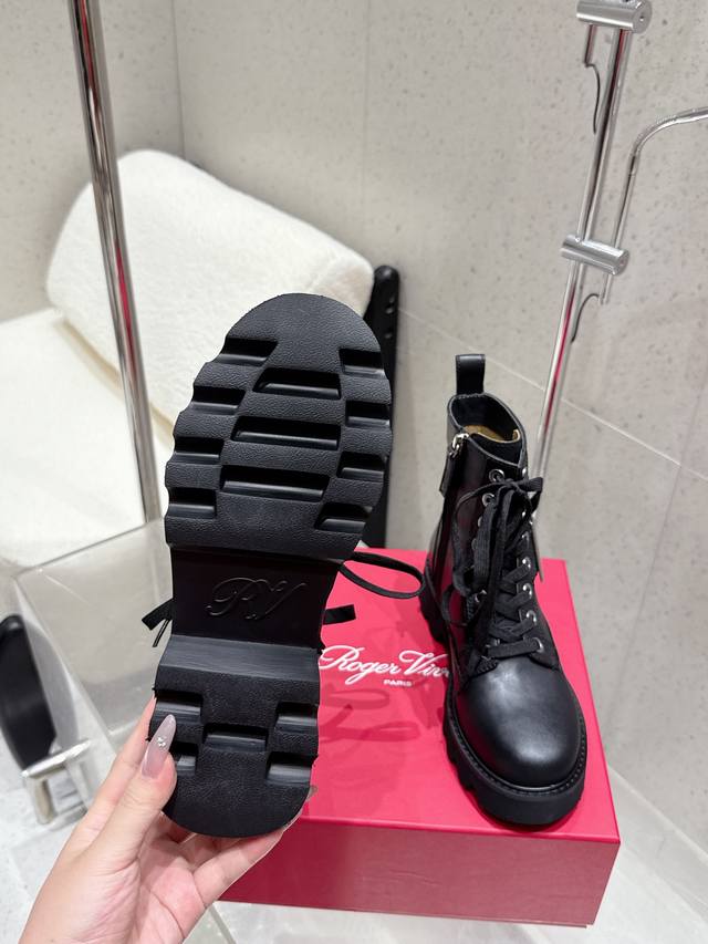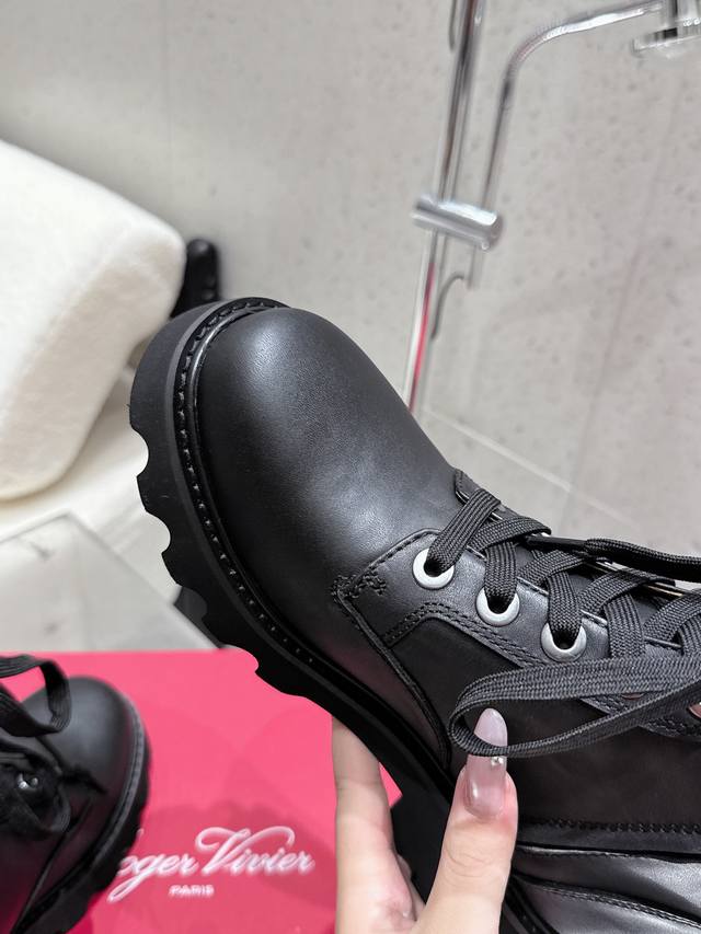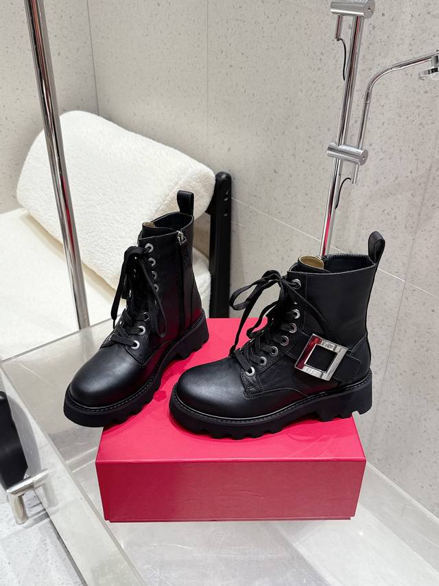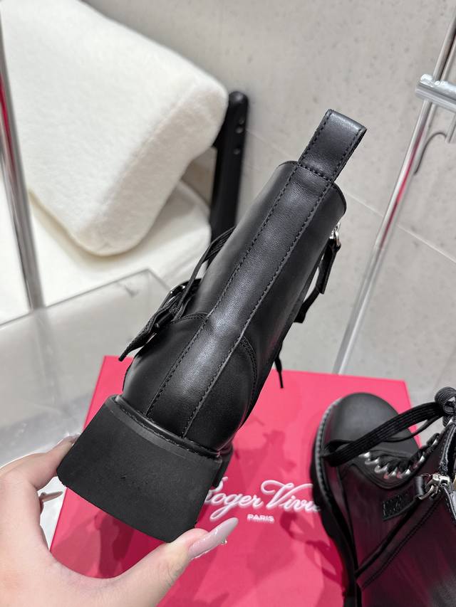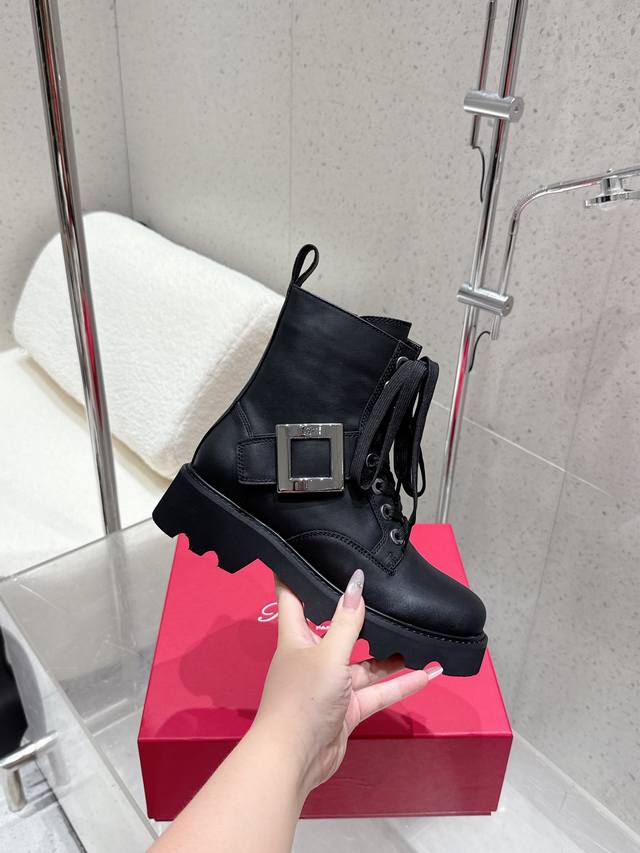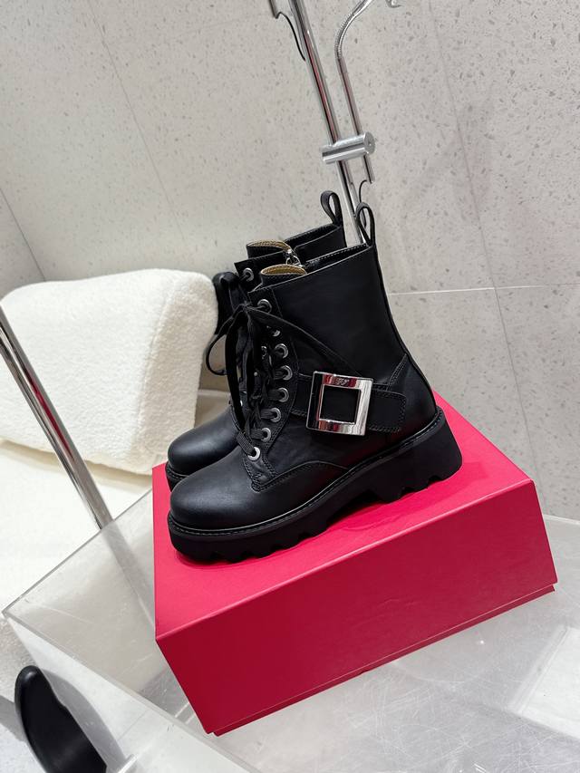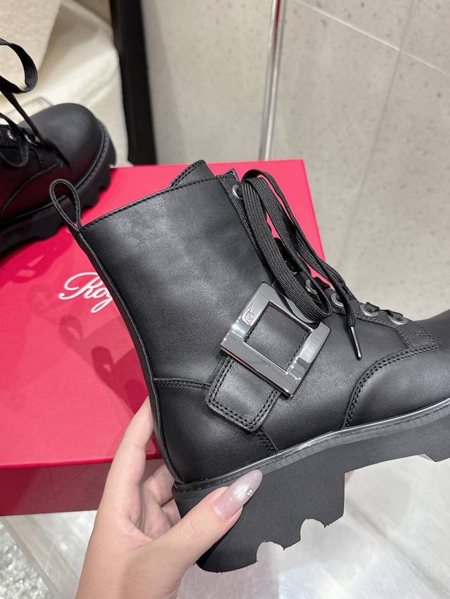 Roger Vivier's new autumn/winter women's square-buckle mid-calf boots with a thick sole and British-style martin boots. These stunning diamond-buckle mid-calf boots feature a lace-up design that flatters and enhances leg shape. Stylish and versatile, these boots are complemented by the brand's signature diamond buckle, which gleams with a dazzling brilliance. Their simple yet chic design adds interest and enhances comfort. The large genuine leather tongue and generous front guard provide a seamless fit and a slimming effect. The meticulous craftsmanship is evident in the meticulously crafted upper and delicately painted edges. The boots are plush and soft, offering an elegant and refined look, creating a powerful presence. The