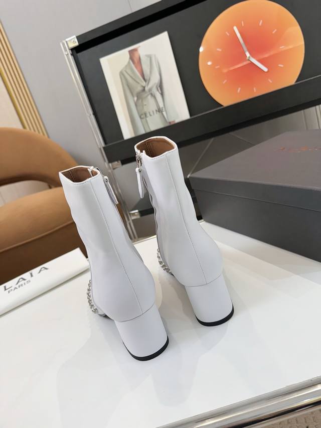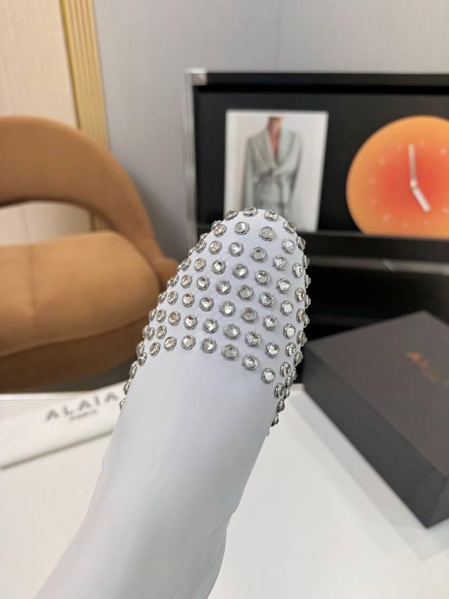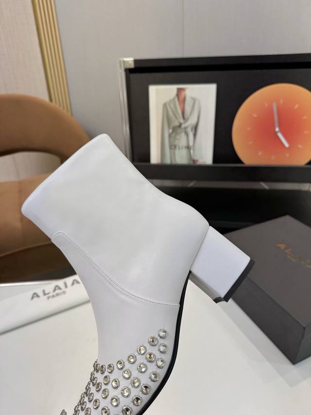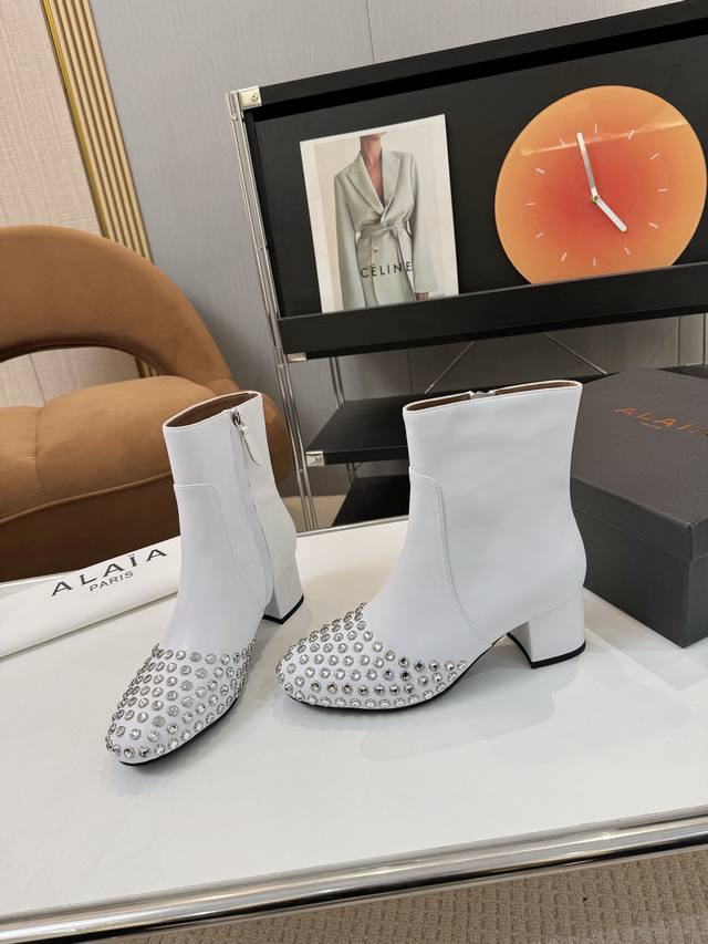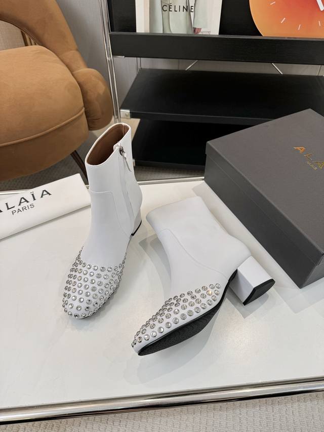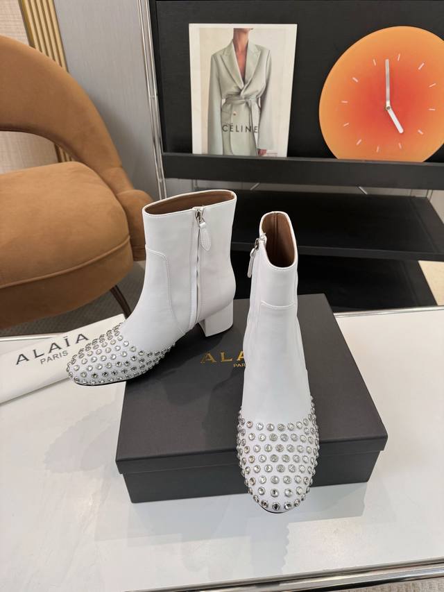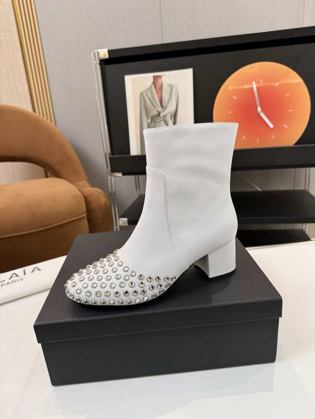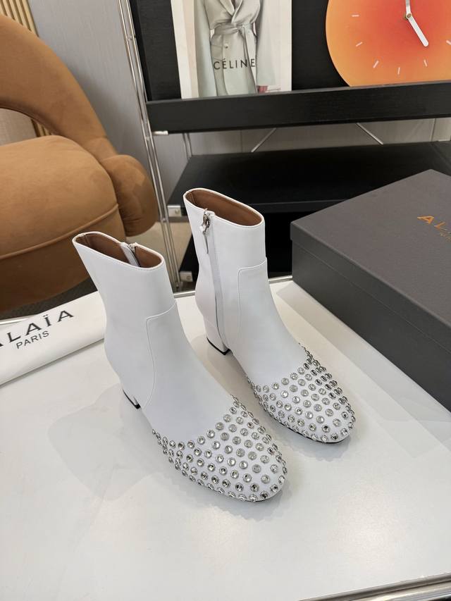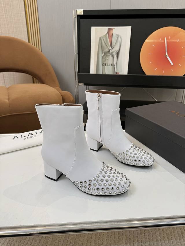 2025 Early Autumn New Alaia Suede Crystal Rhinestone Ankle Boots Calfskin Hot Rhinestone Side Zipper Chunky Heel Ankle Boots