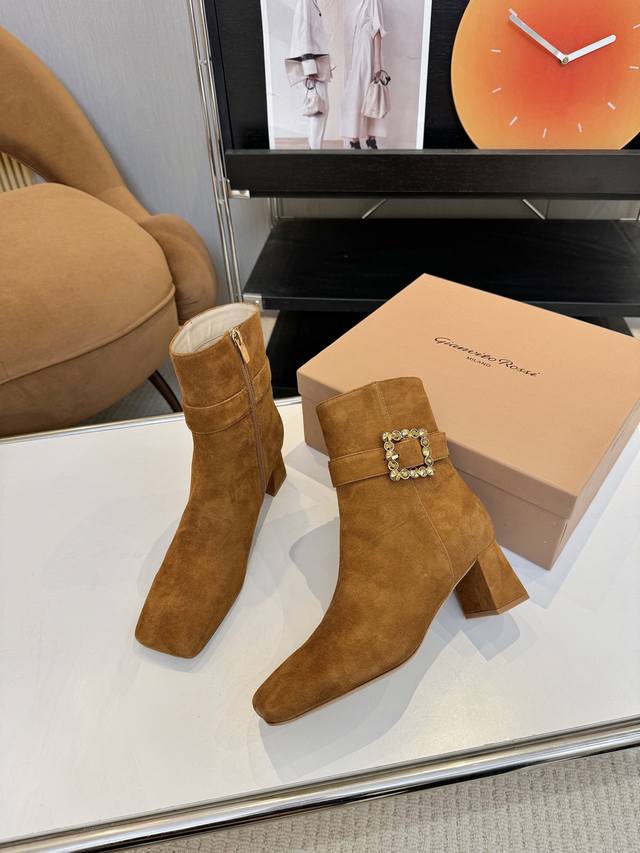 25S Autumn/Winter New Rossi Gr Square Toe Ankle Boots with Side Zipper and R Buckle Chunky Heel. The