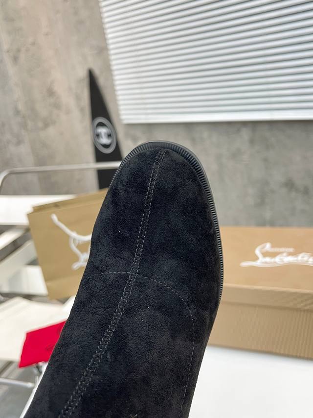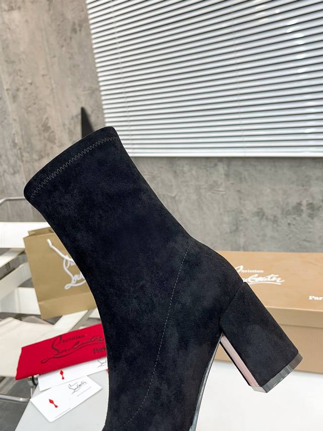 Price: Christian Louboutin Cl's new chunky-heeled stretch ankle boots are classic and sophisticated, with sleek and slender lines. They feature a 70mm square heel. Depending on the occasion, pull them up to the calf or loosen them to the ankle; one pair can be worn as two. Shaft height: 8 inches. Material: Stretch velvet leather. Lining: Sheepskin. Heel height: Rubber, 7cm. Color: Black stretch velvet, black stretch leather, khaki stretch suede. Sizes: 34-41 (34, 41 custom sizes available). Packaging: Original packaging.