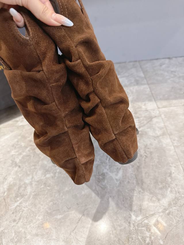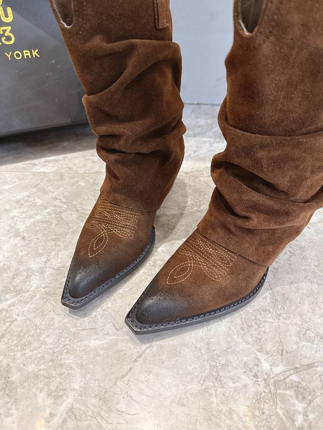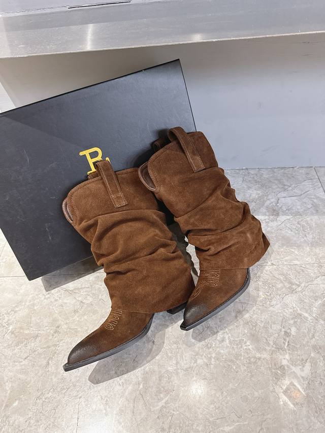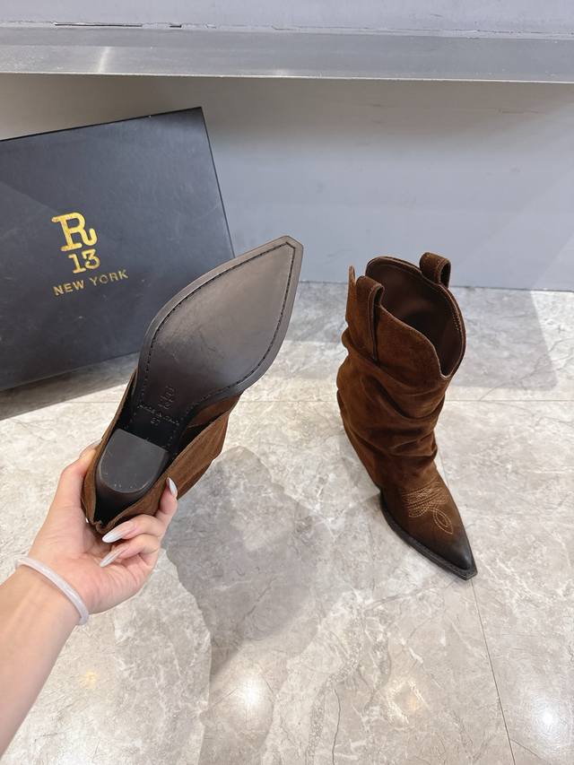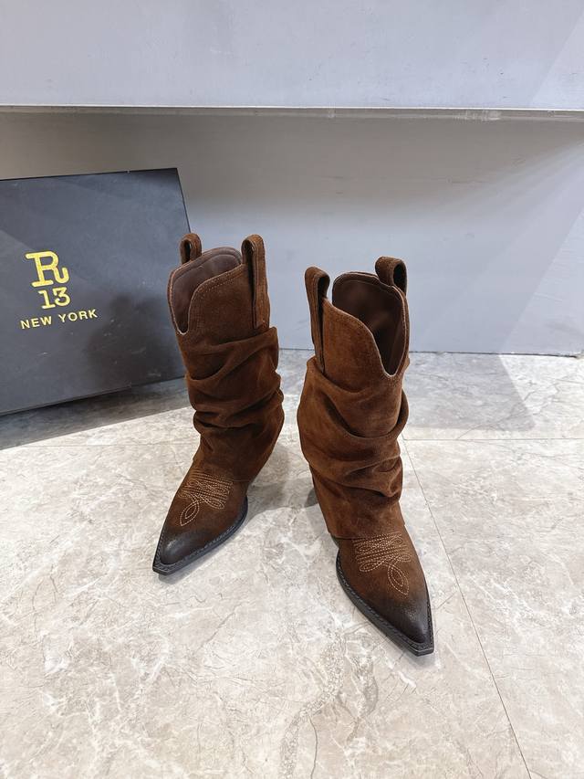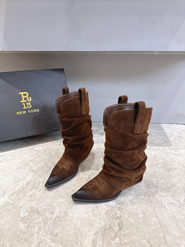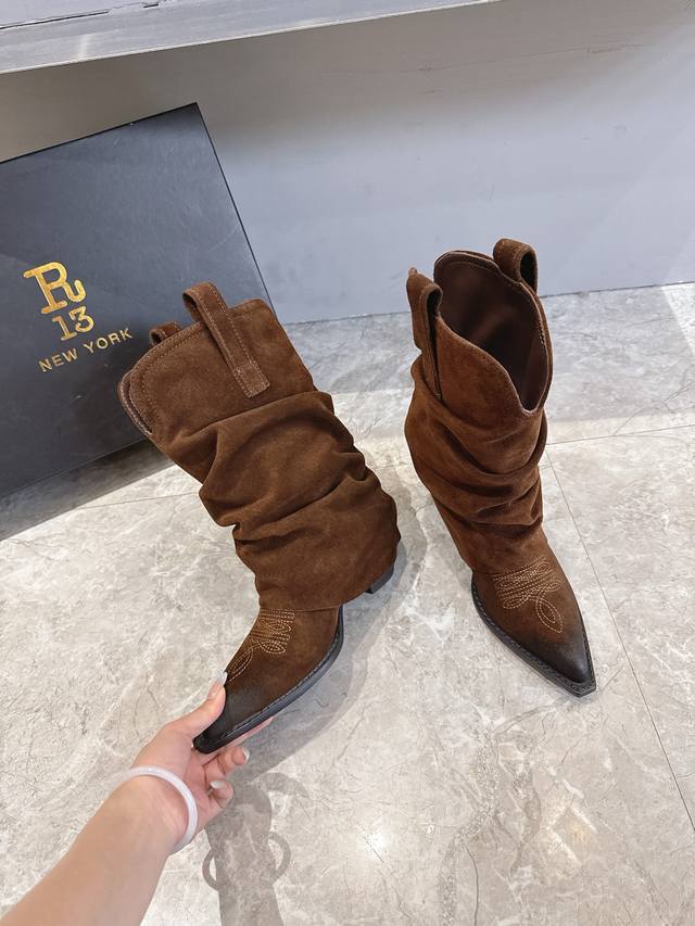 R13 New Arrival R13 These Western boots feature a retro suede pleated design that's incredibly eye-catching. The pointed toe adds a cool and edgy touch, instantly transforming you into a street style icon and effortlessly capturing the American retro vibe. Upper: Imported suede; Lining: Imported cowhide; Outsole: Imported outsole; Heel height: 7cm; Size: 35-39, 40, 41, 42 (Fixed order).