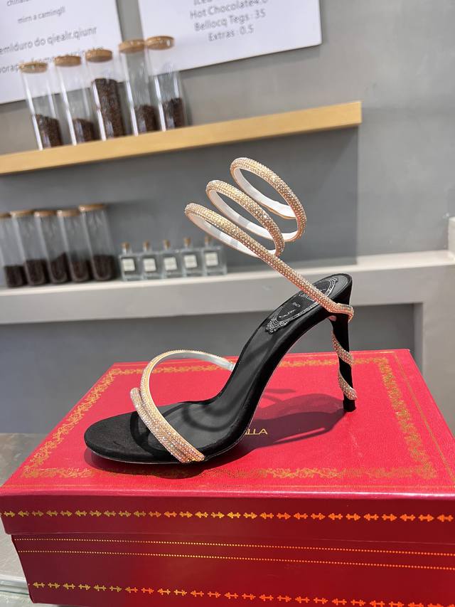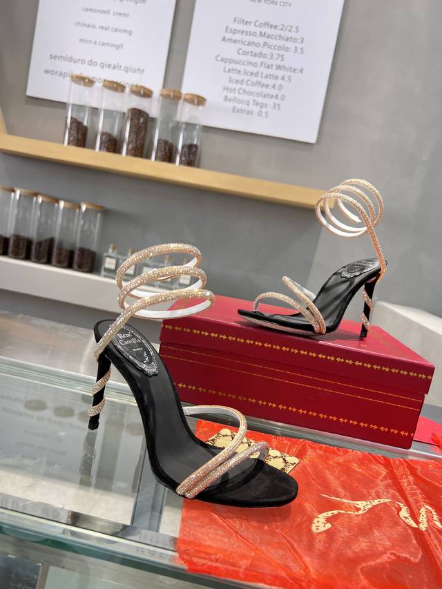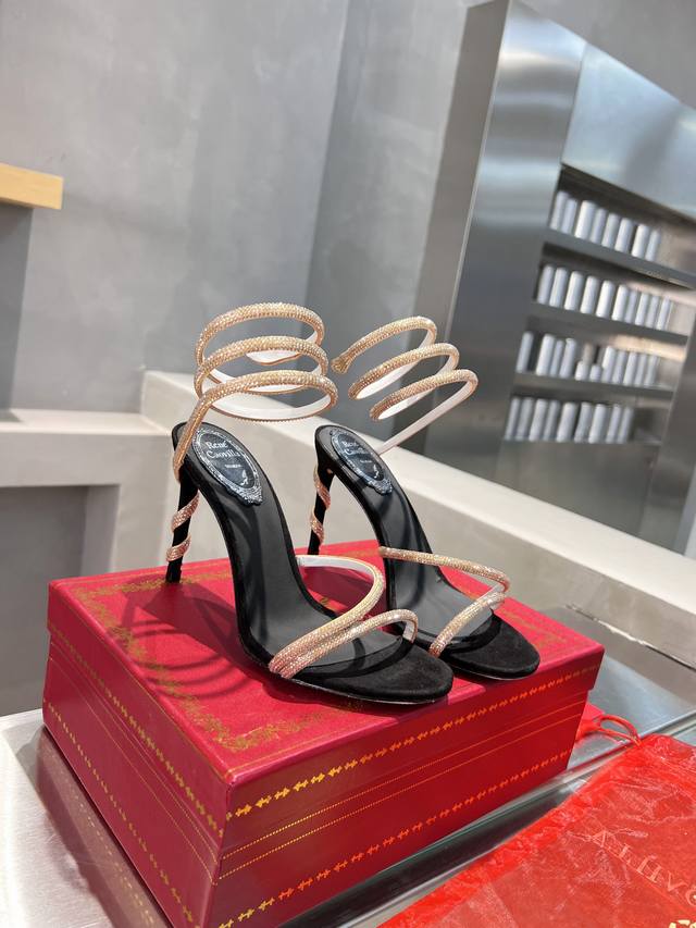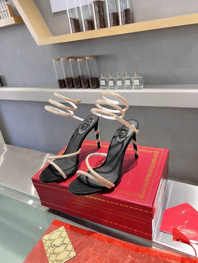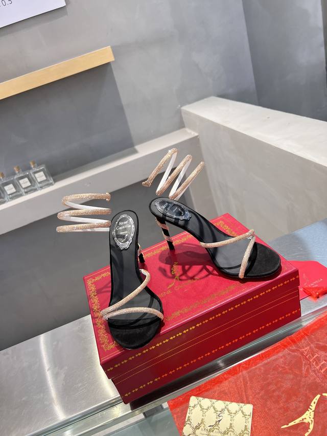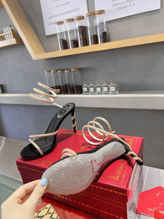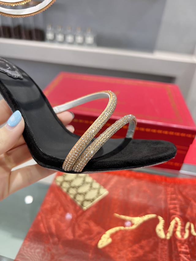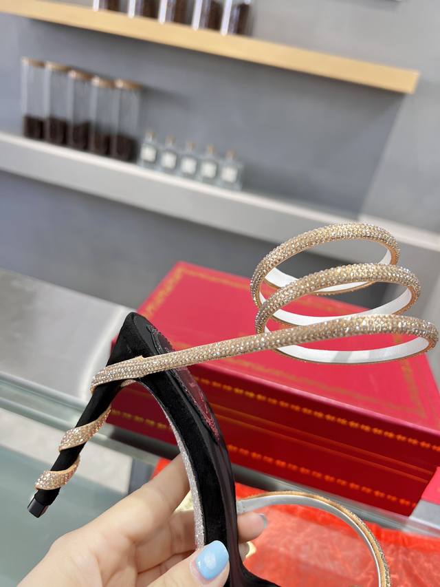 RC Heavy-duty Rc snake-patterned Cleo series, crystal-wrapped anklet high-heeled sandals. Simple yet subtly intricate, the entire upper shimmers and sparkles under a little light. Effortlessly chic for both warm, lively parties and dimly lit, intimate occasions. High-quality spring/summer new arrival, a captivating and luxurious top-tier item, a heavyweight flagship piece of the year! Material: Imported silk + Cleo rhinestones Lining: Imported silk sheepskin lining Outsole: Original Blingbling shimmering silver genuine leather sole Heel height: Approximately 9.5cm Color: Gold, black, silver, white Size: 35-39 34 40 41 42 43 (Custom orders are non-refundable, standard size) Packaging: Comes with a cloth bag, card, and spare top. Rc hot-selling item.