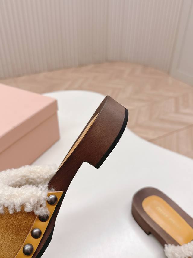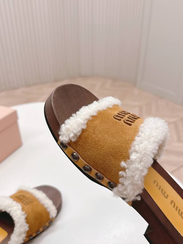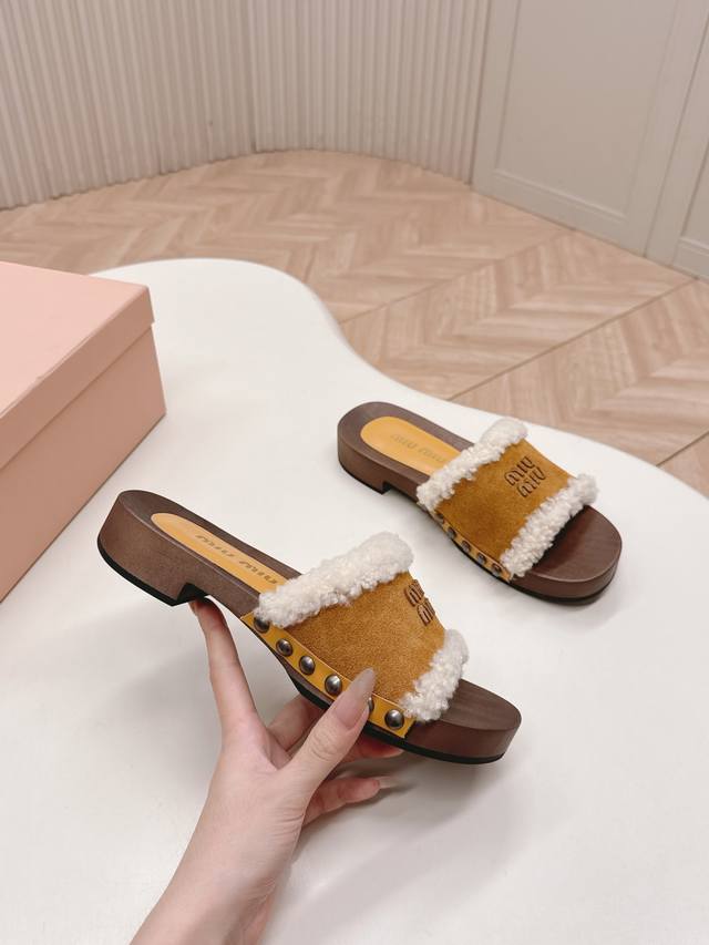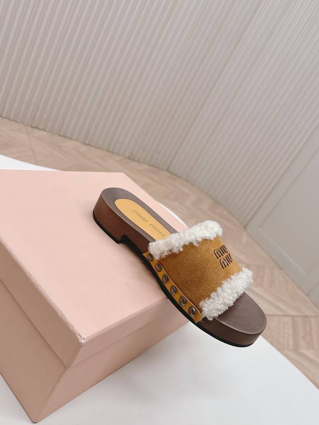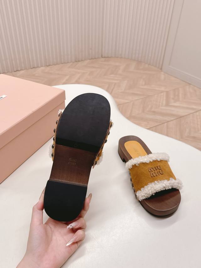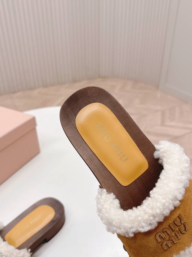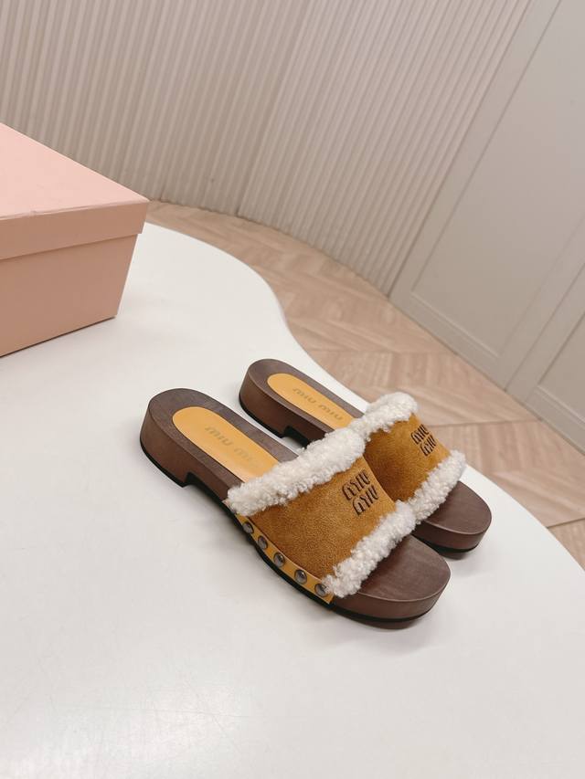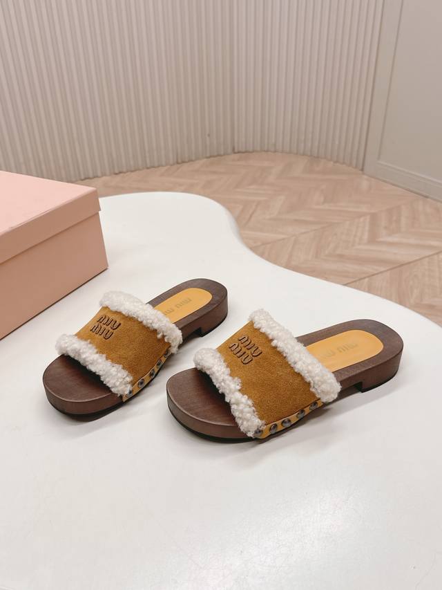 Releases Miu Miu's new 2025Ss Fall/Winter Velcro furry slippers. Miu Miu has made me fall in love with them all over again! There are so many beautiful shoes this season, and these furry slippers are just irresistible. They're so cool and versatile! They look amazing and comfortable on the feet. Fabric: Cow suede. Lining: Sheepskin. Sole: Original wooden sole. Sizes: 35-40. 40.41. Made to order. No returns or exchanges.
