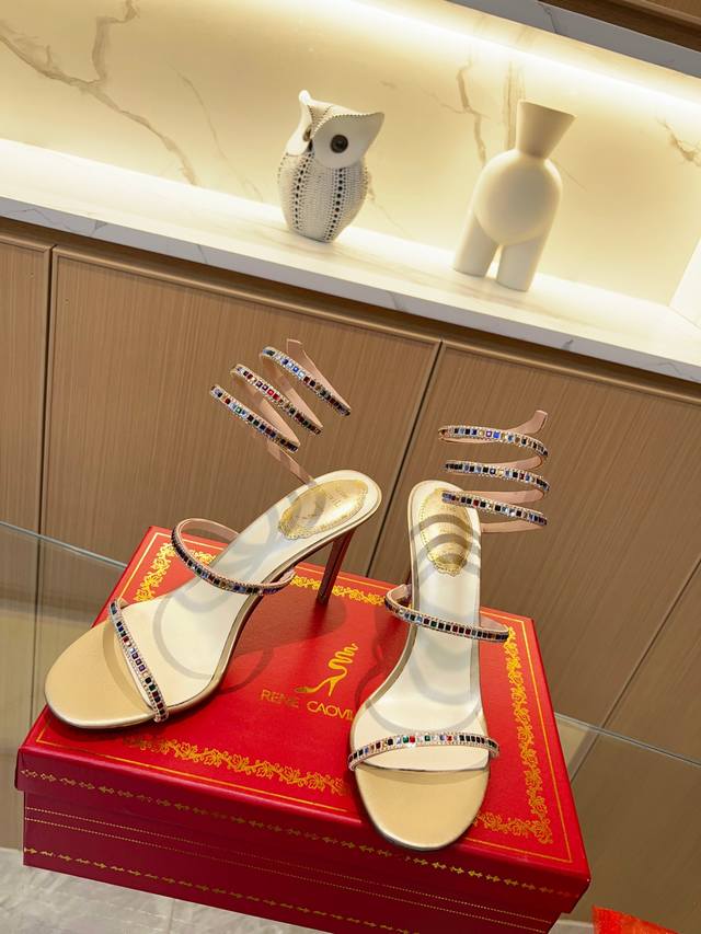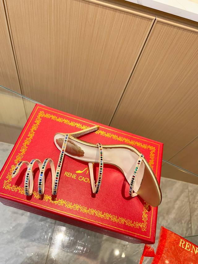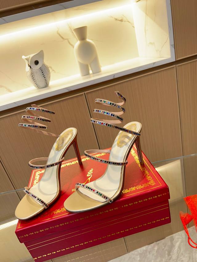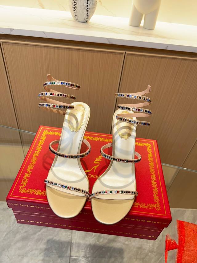 Rene Caovilla Rc high-end version spring/summer's hottest collection, a glamorous and luxurious top-tier item, the Cleo multicolored crystal glass rhinestone sandals, a heavyweight signature piece of the year! Crystal strappy high heels DDD Globally sold-out rhinestone-studded sandals! Celebrity style, showcased by platform anchors and influencers, fashionable and elegant. Thousands of rhinestones are neatly arranged, encircling the ankle, exuding sexy and alluring femininity. Custom-made from the original boutique design, extremely heavy-duty workmanship, using imported machinery and meticulous handcrafting to create a three-dimensional arched rhinestone strap for perfect quality. The goal is to ensure that every girl who owns this item retains the most beautiful romantic memories, radiating ethereal beauty. Classic, noble, and elegant. Material: Original custom-grade silk + Clio crystal glass rhinestones. Lining: Imported sheepskin lining and insoles. Outsole: Original bling-bling shimmering silver genuine leather sole. Heel height: 9.5cm. Color: Multicolored glass rhinestones. Size: 35-39, 34, 40, 41, 42, 43 (custom orders are non-refundable and non-exchangeable, standard size). Packaging: Comes with a cloth bag, card, and spare rhinestones.